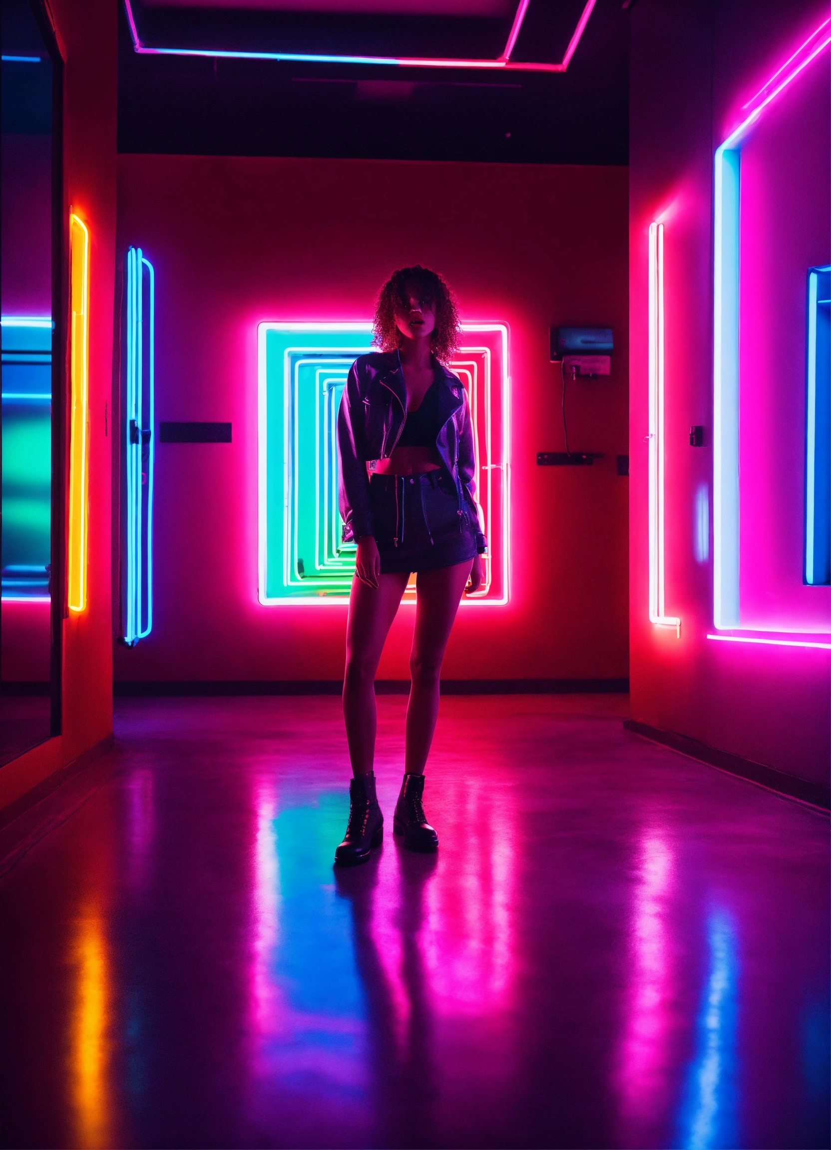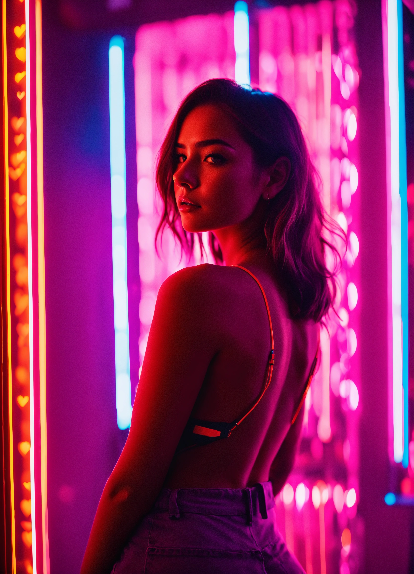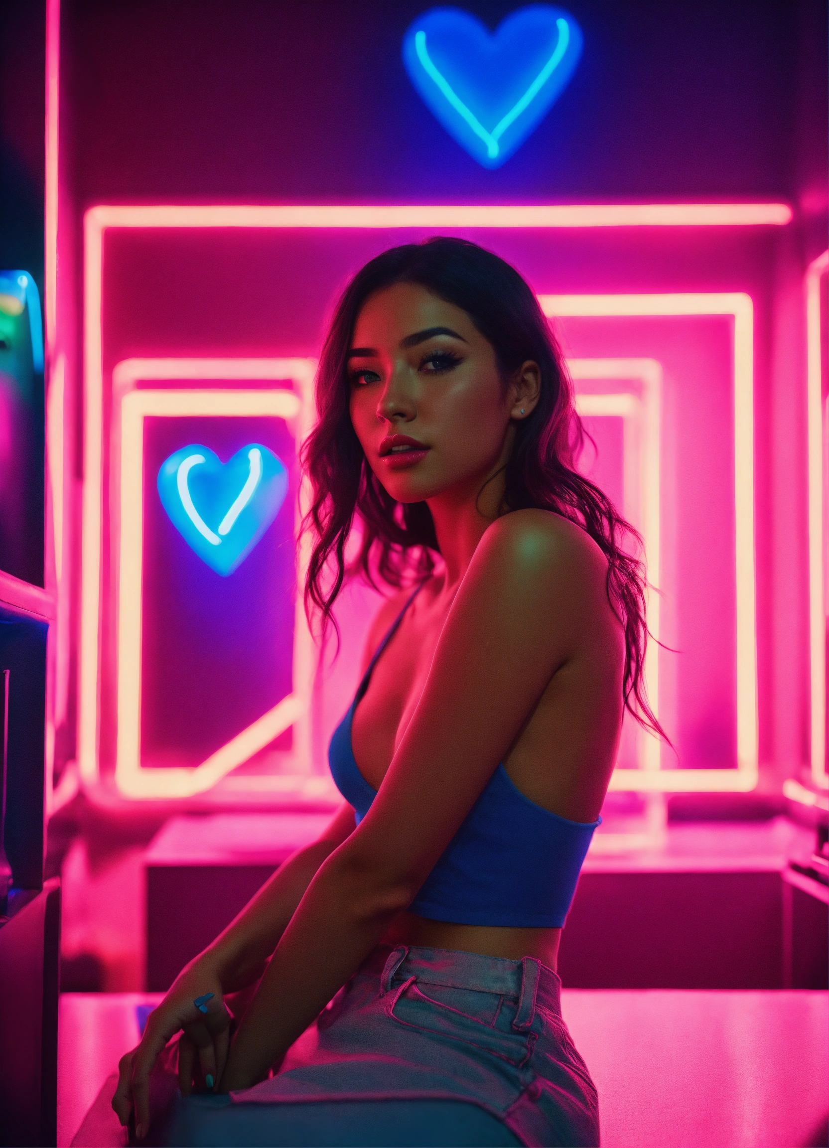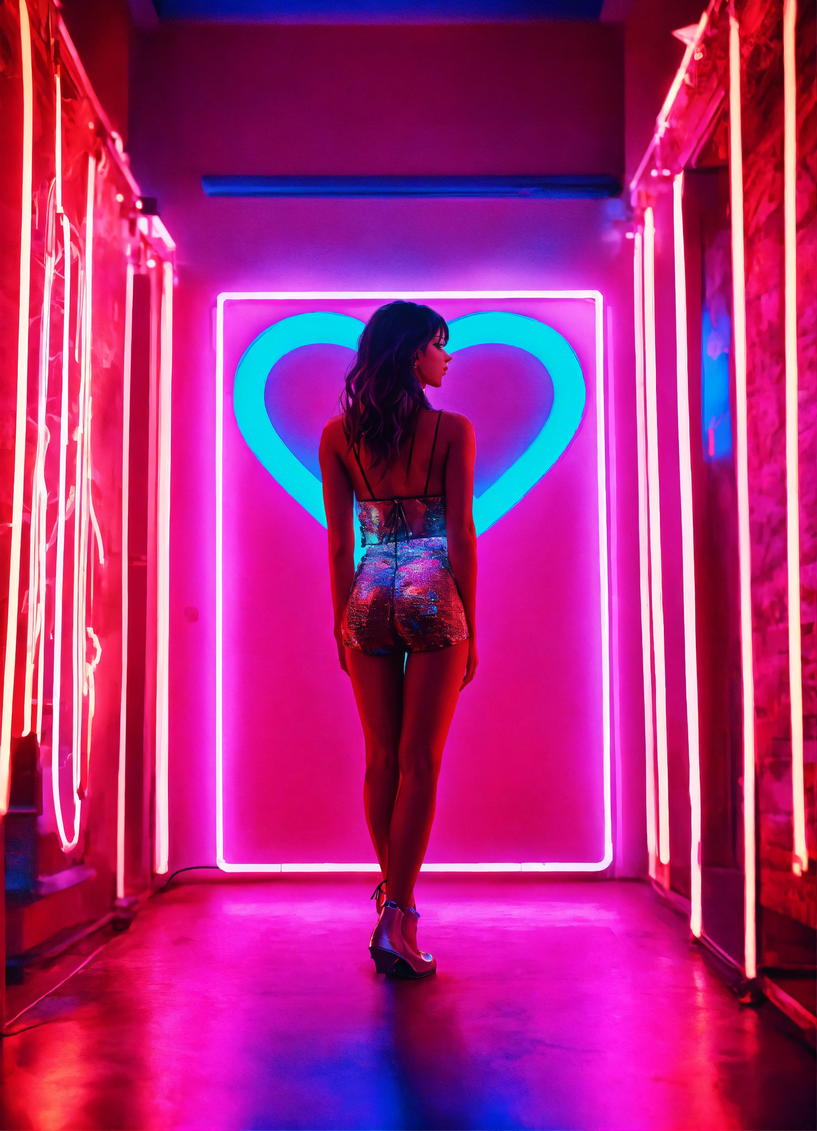 Cinematic photography, modern, mixed female lover in neon hearts room, romantic, proportionate, neon colors details, realistic, ultra 8k resolution