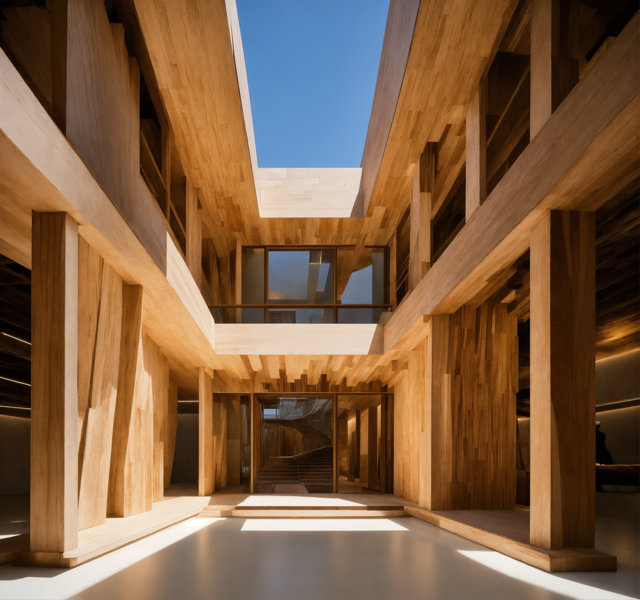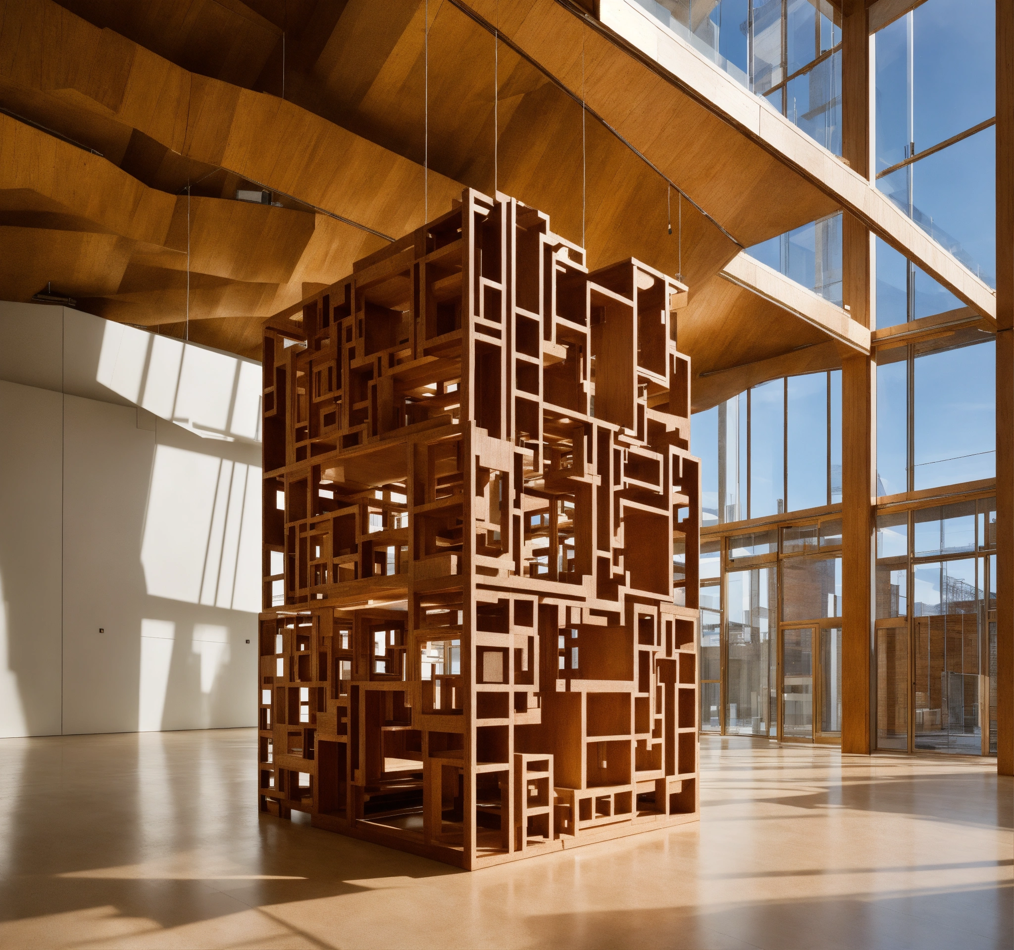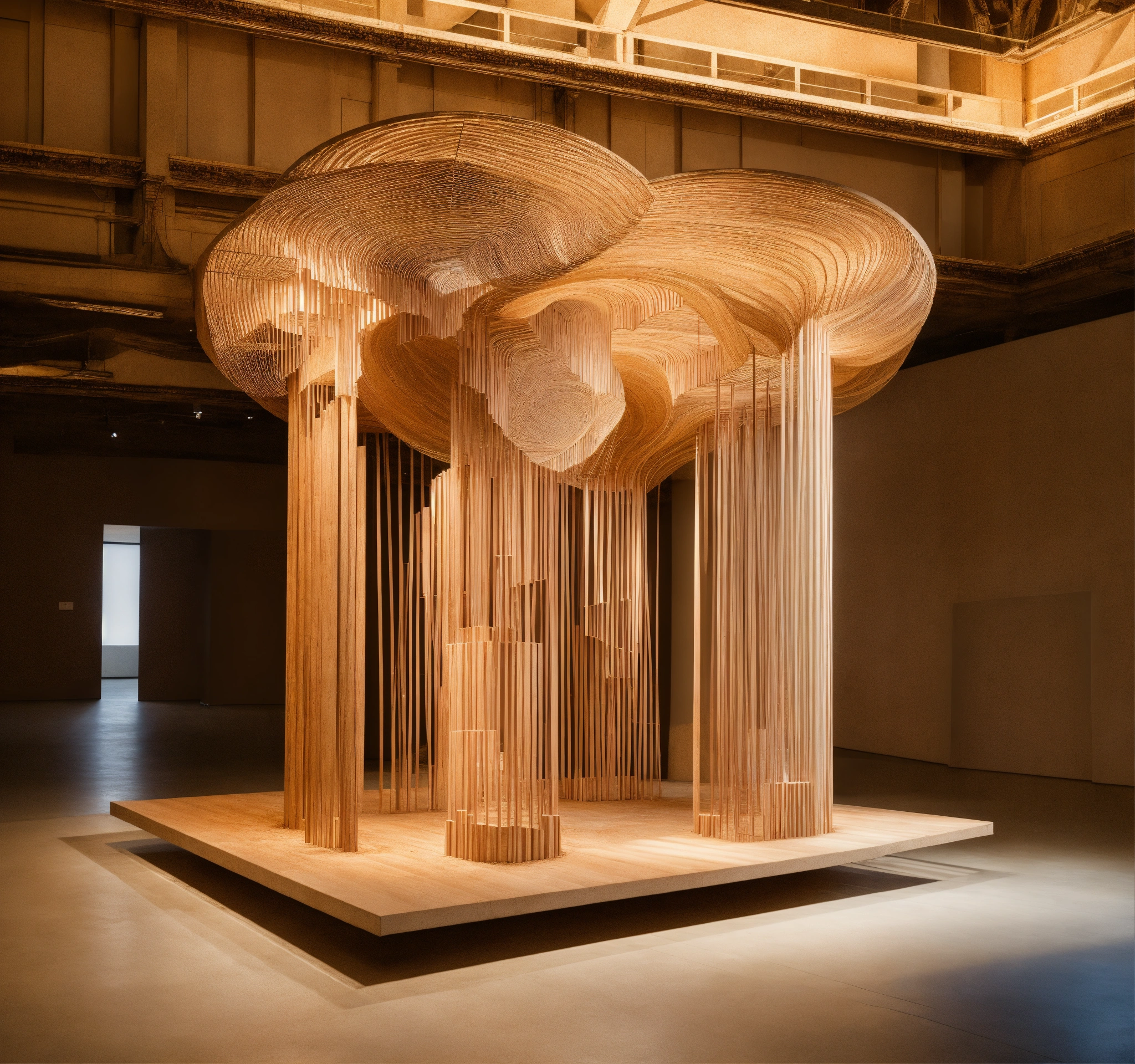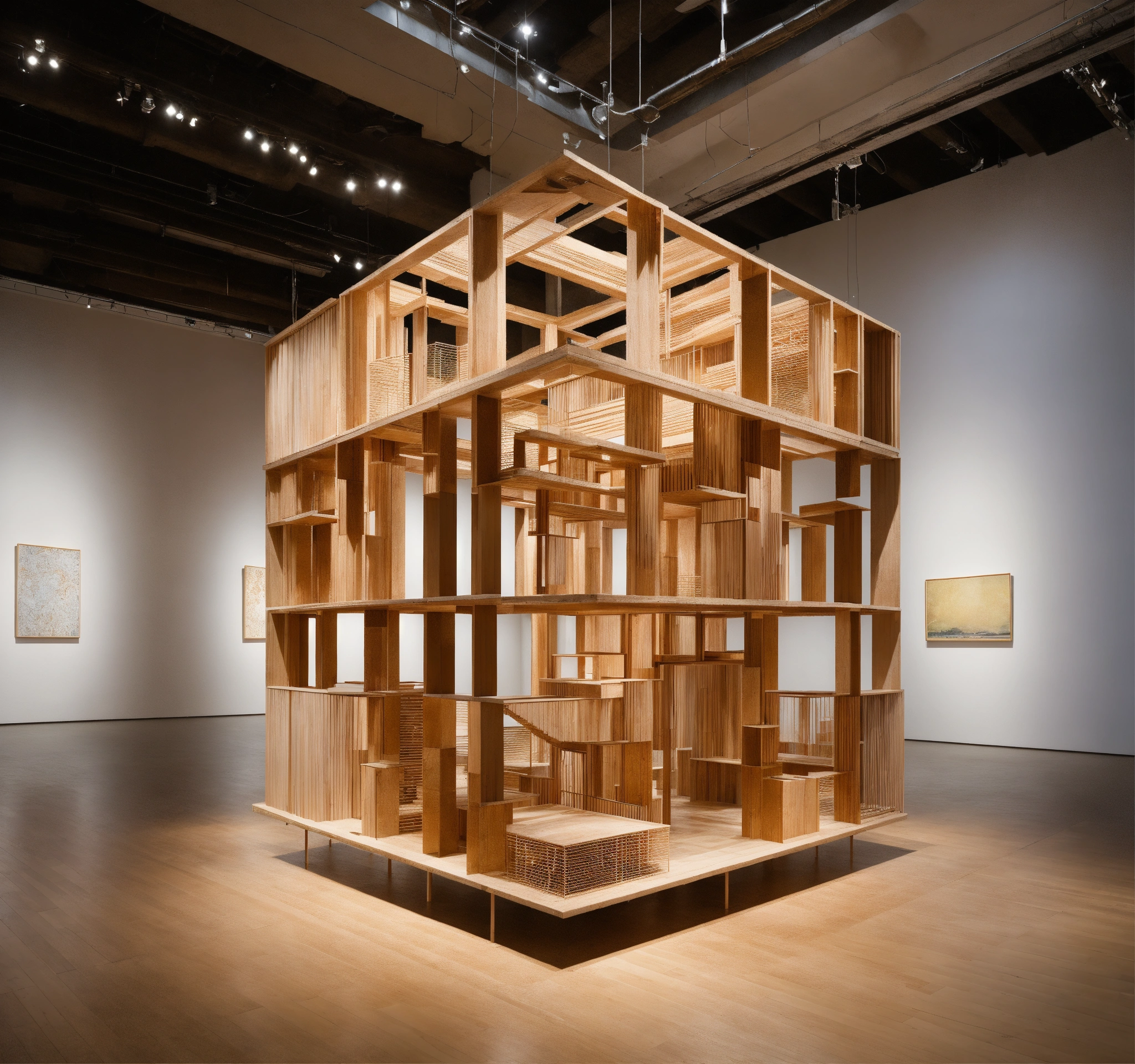 The image showcases an intricate art installation placed in a gallery setting. the central piece of the installation appears to be a suspended, multi-layered architectural structure made of pale materials, possibly wood or a similar medium. the design of the structure is quite abstract, with a myriad of interconnected rooms, platforms, and alcoves. it possesses a cube-like shape overall, but with various sections jutting out asymmetrically, creating an almost maze-like appearance. dramatically flowing from the center of the structure is a cascade of layered material, reminiscent of drapery or perhaps flowing hair. this cascade showcases a beautiful gradient of colors, transitioning from a pale hue at the top to deep, rich tones towards the bottom. the intricate folds and swirls in this flowing element add a dynamic contrast to the rigid, geometric nature of the architectural component above.
