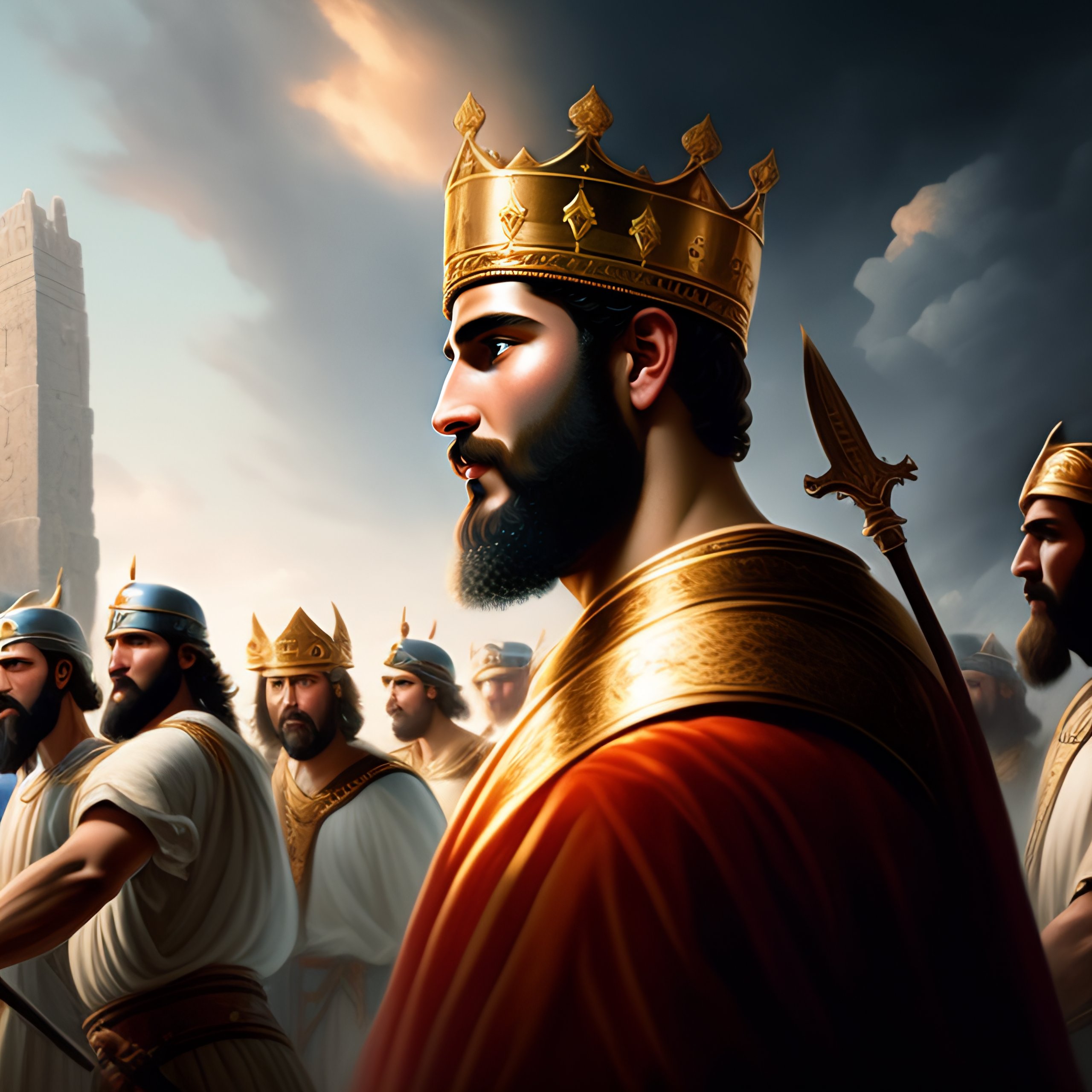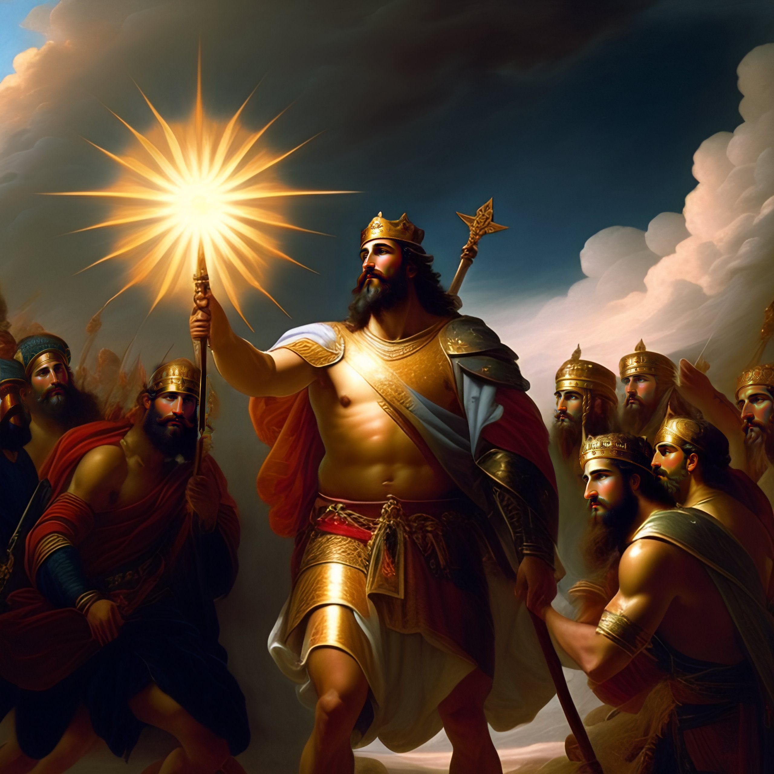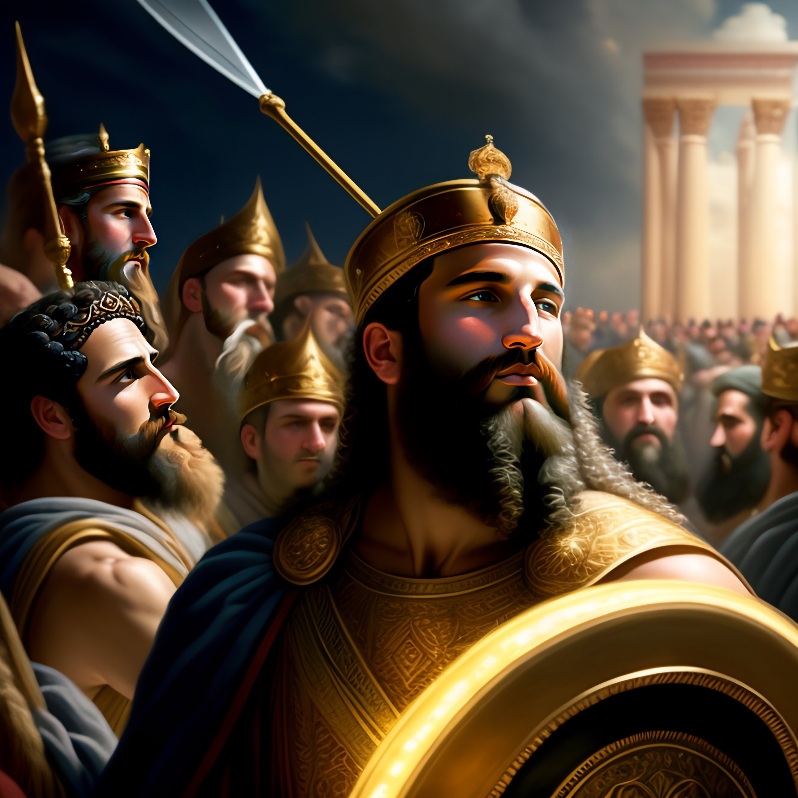 King david of israel, looking up to heaven, holding a glowing shield, with a large army of absalom's rebels in the distance