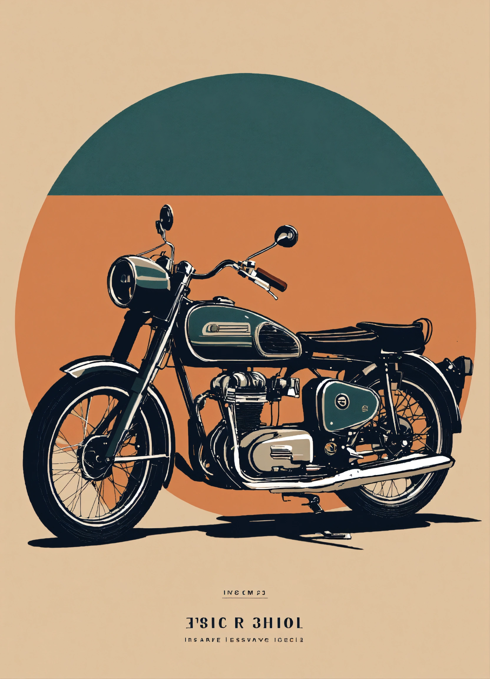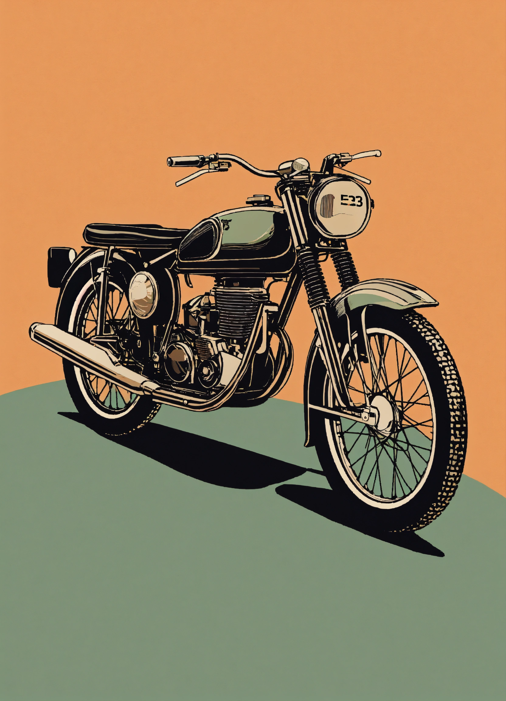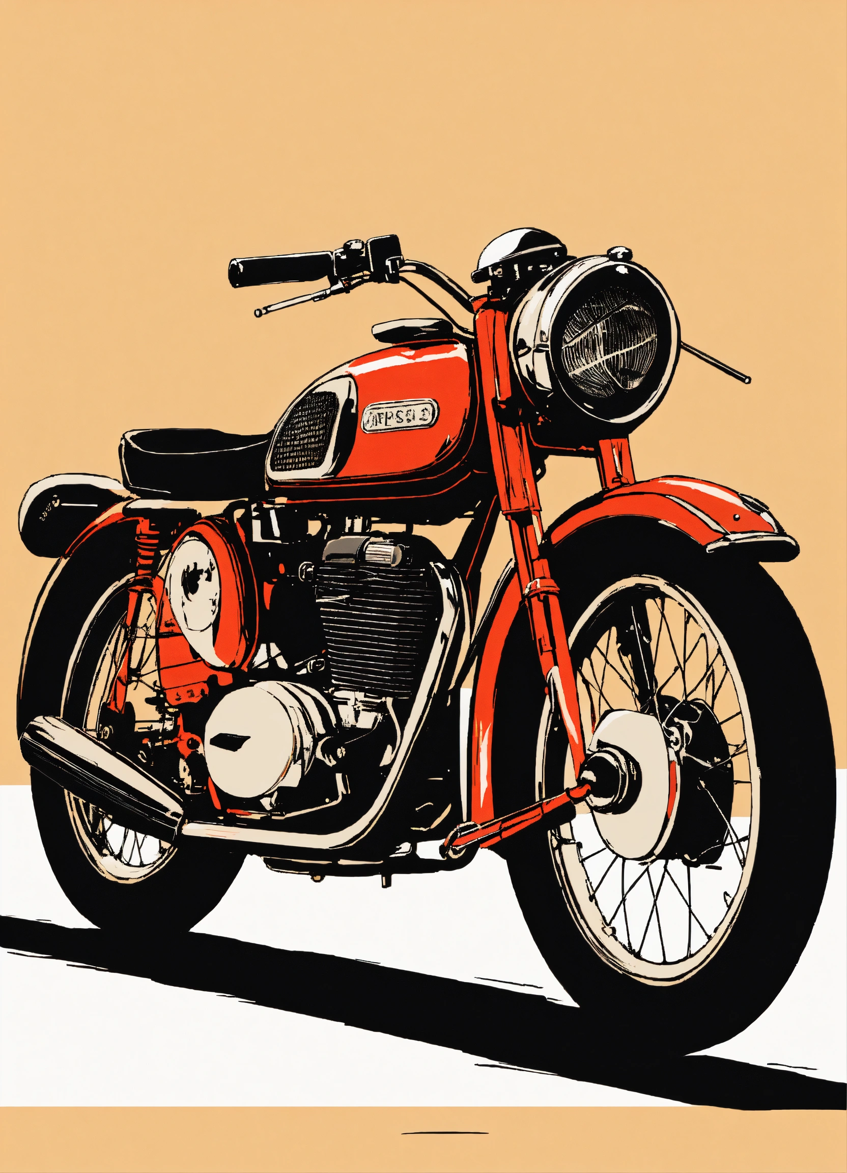 A minimalistic illustration of a vintage motorcycle, capturing its essence with clean lines and simplified forms, perfect for printing on art prints and tote bags. --ar 23