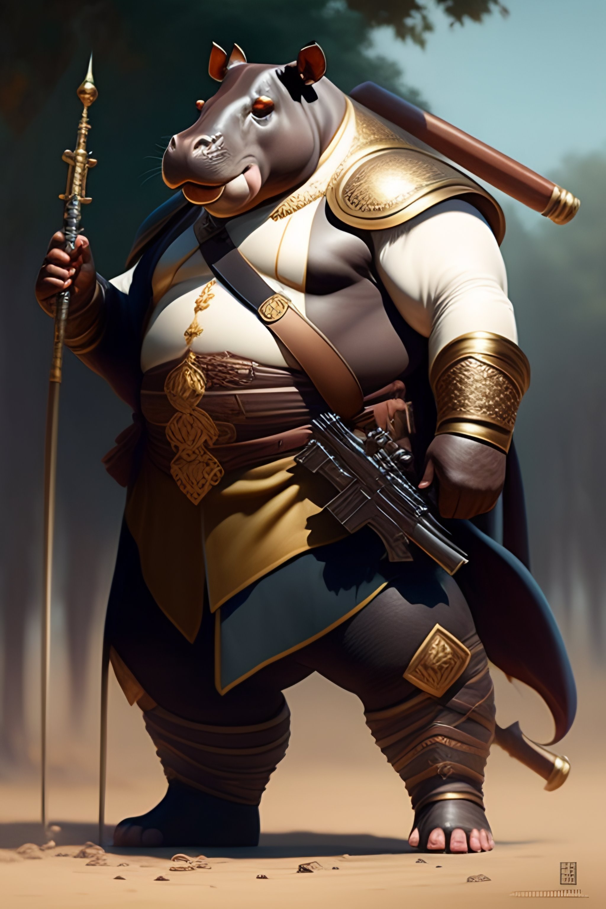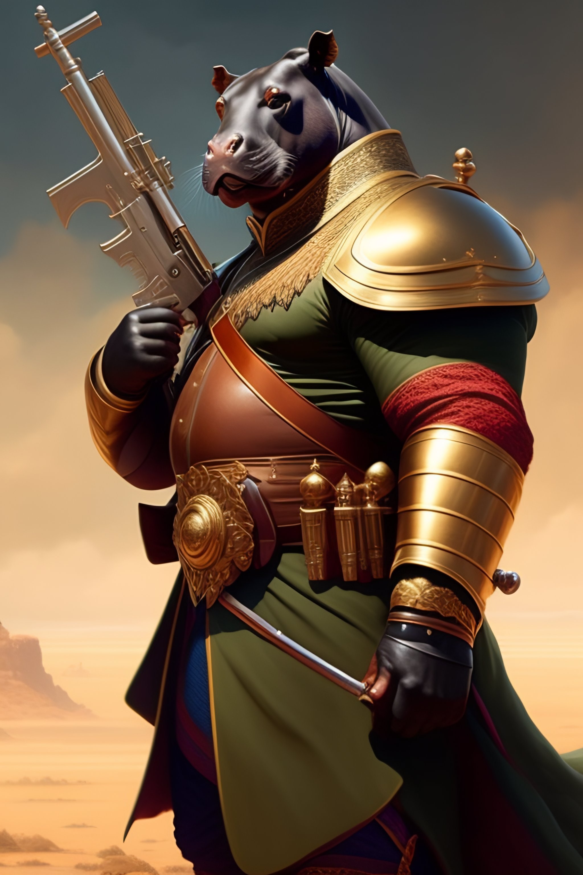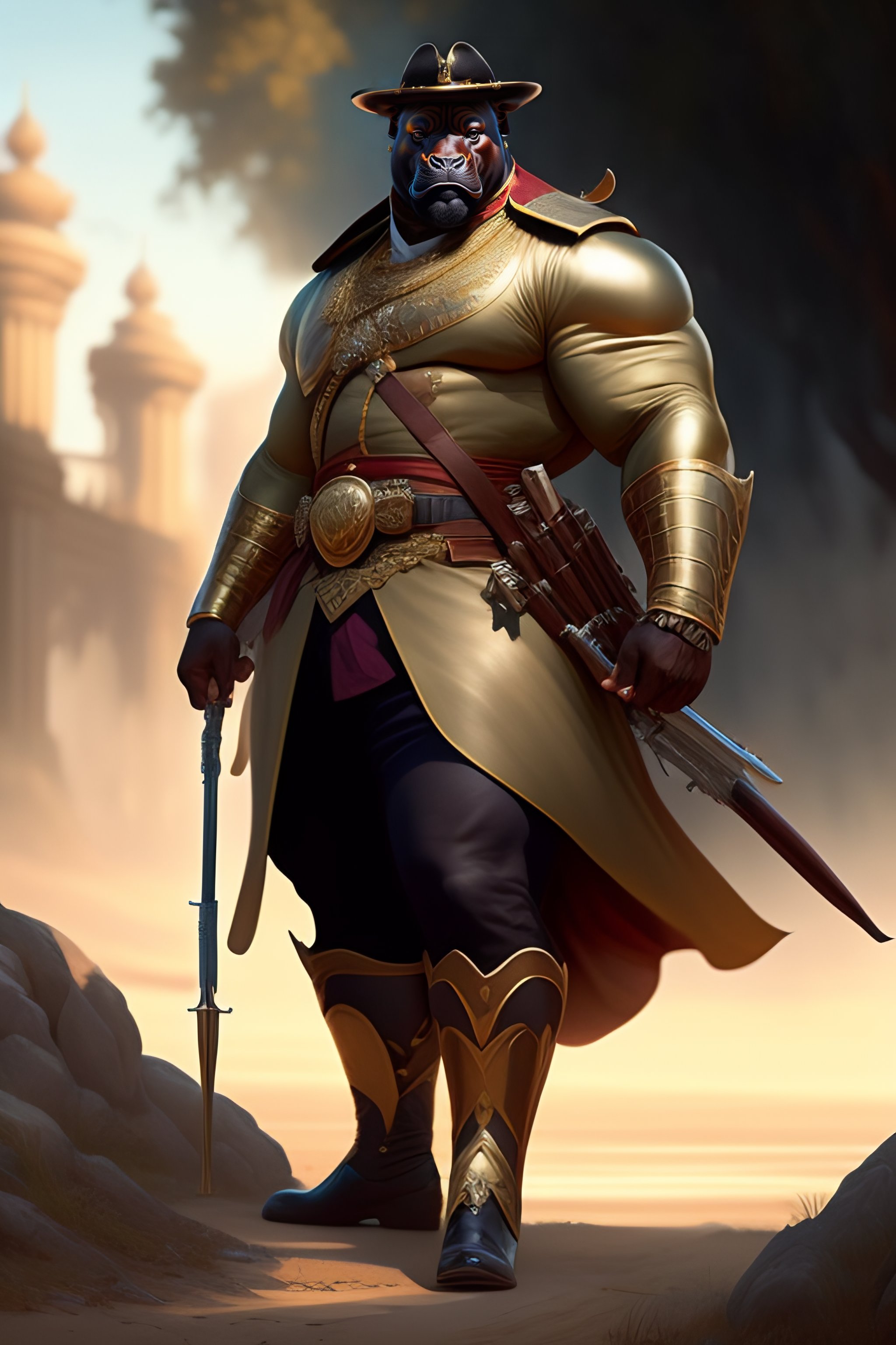 Hippo man with a musket, posing for a fight intricate, elegant, highly detailed, digital painting, artstation, concept art, smooth, sharp focus, illustration, art by artgerm and greg rutkowski and alphonse mucha, 8 k