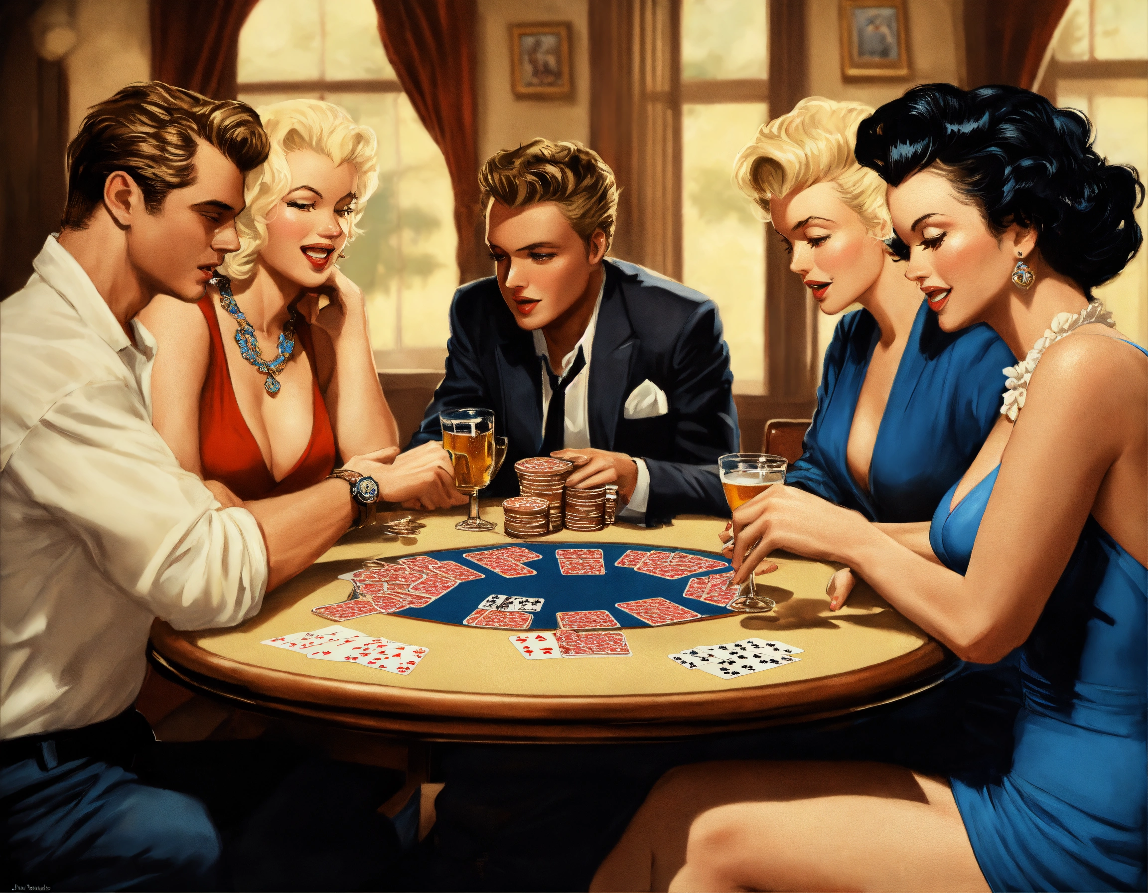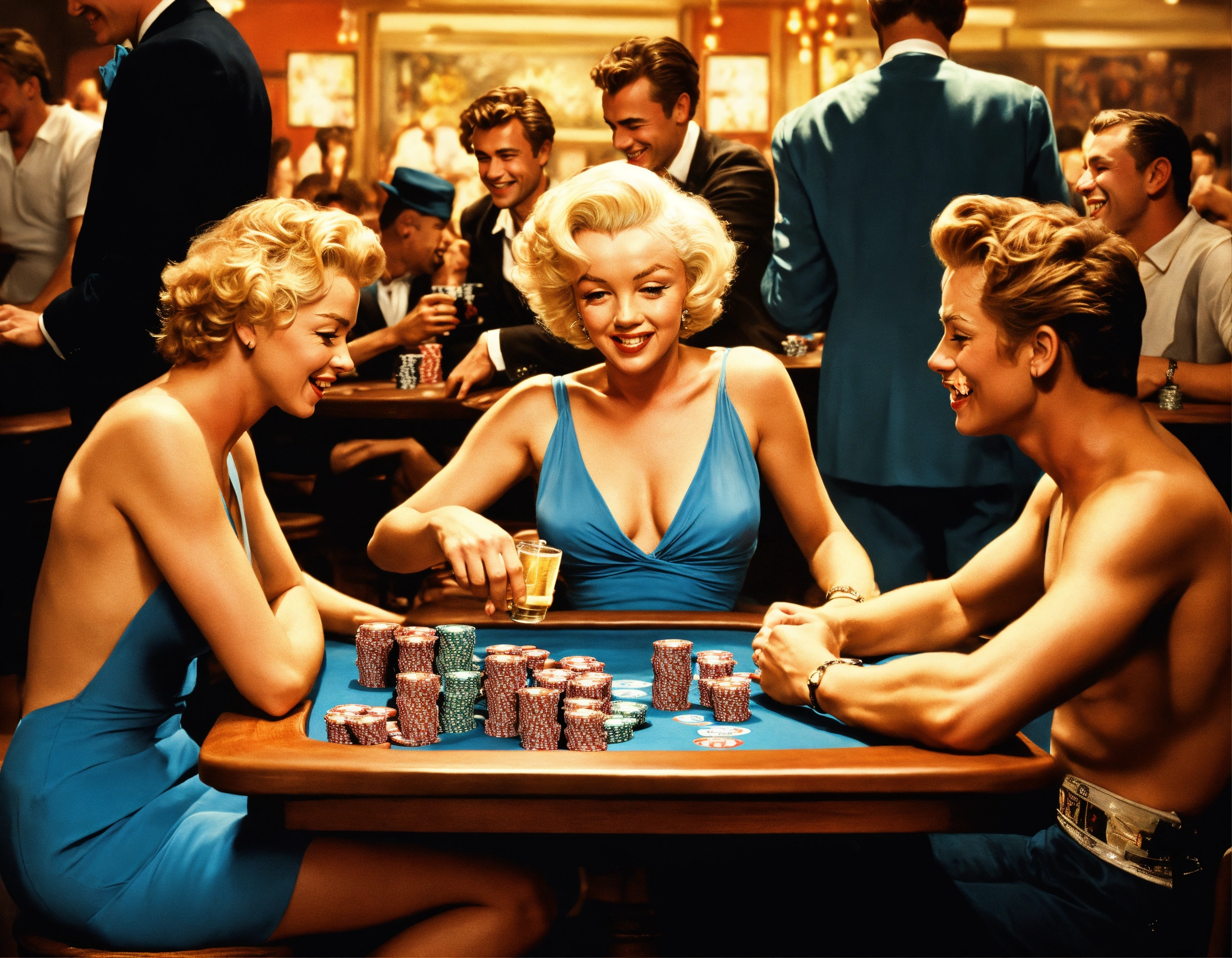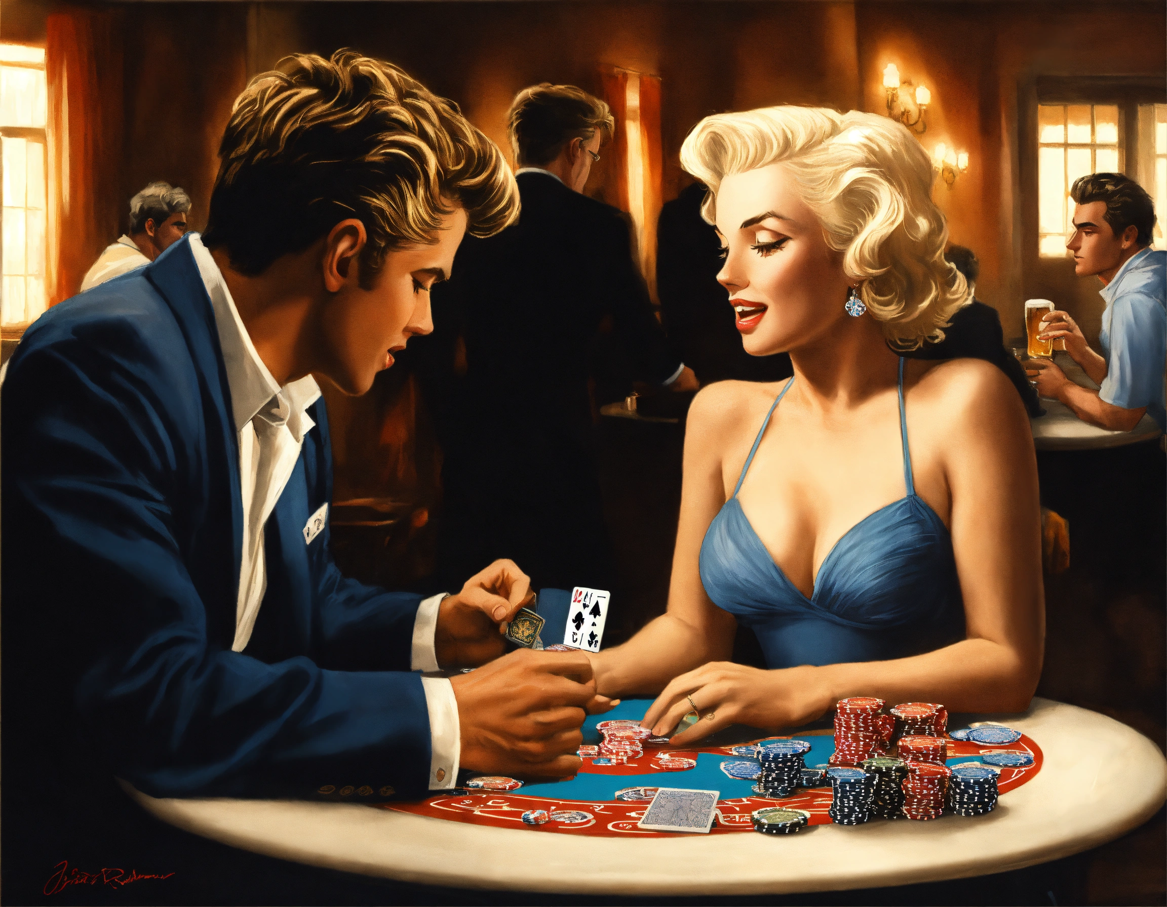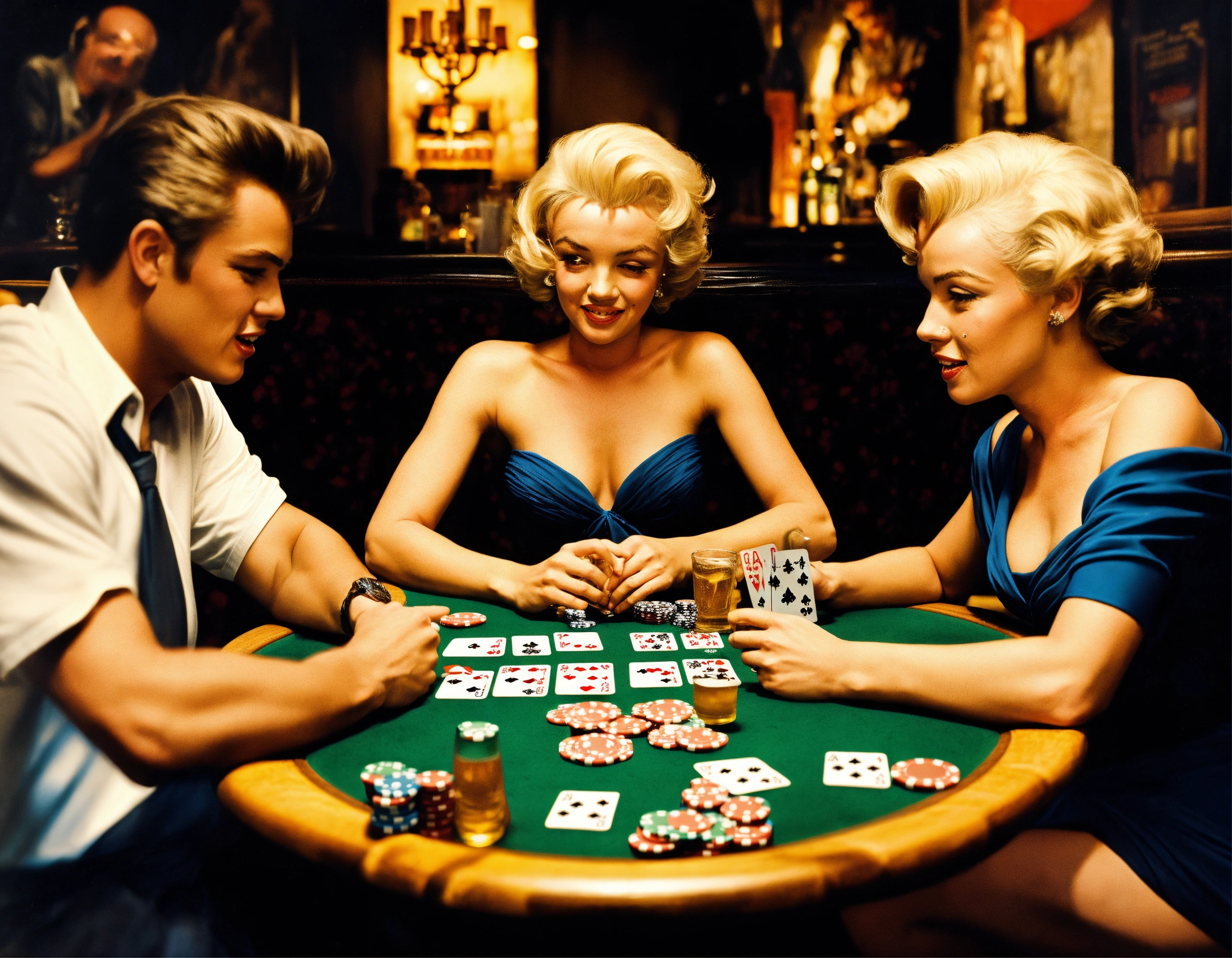 Wide angle view, full color only one marilyn monroe wearing a blue gown and only one james dean wearing a white t-shirt, enhanced hands, detailed anatomically correct hands, symmetrical hands, realistic hands, playing black jack at one table you can see the poker cards in their hands, laughing, drinking beer, detailed anatomically correct hands, anatomically correct faces, symmetrical hands and arms, realistic hands, wide angle camera shot, art by greg rutowski