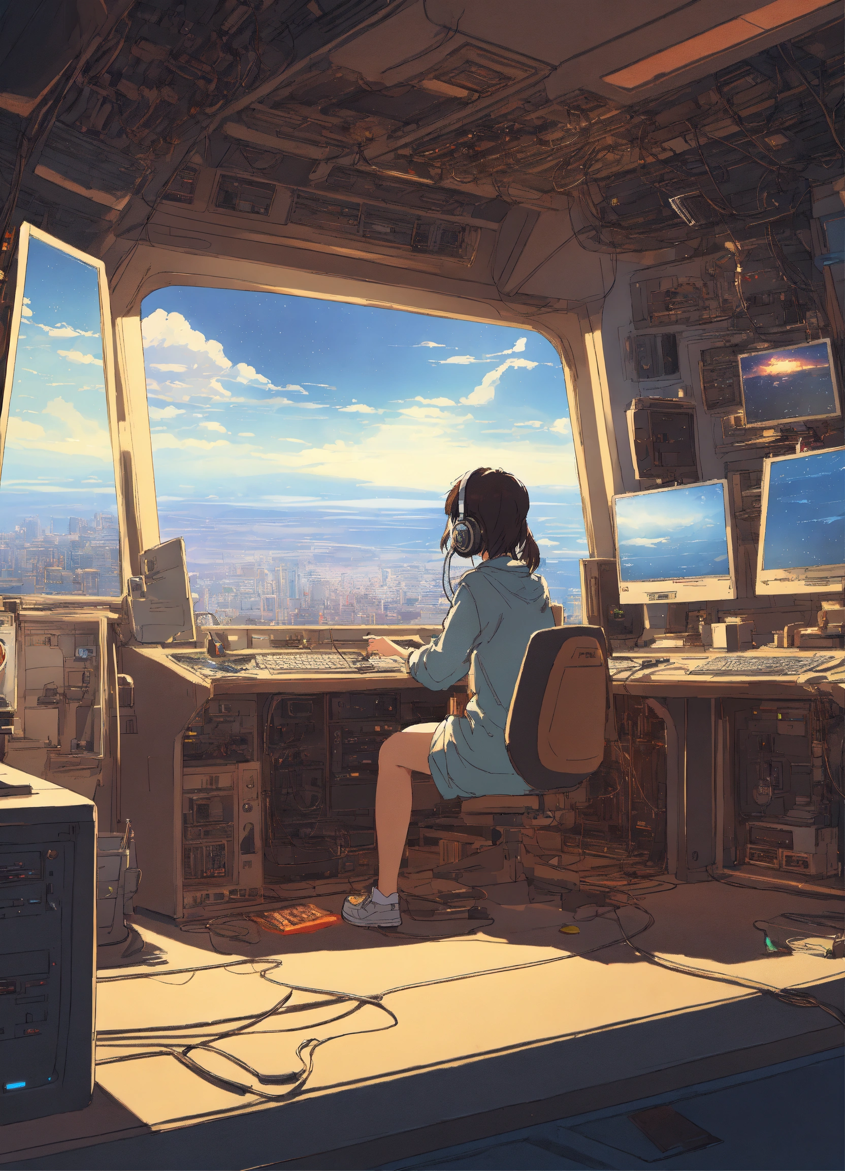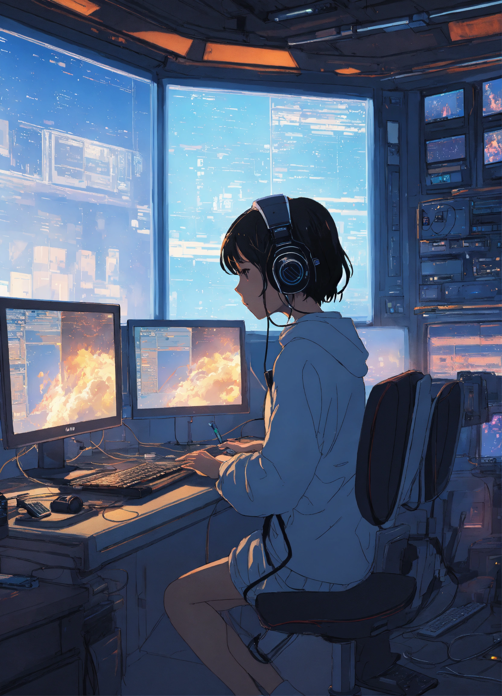 Create a high resolution artwork of lo-fi hip hop, anime girl is programming at a computer in a spaceship, artist, by makoto shinkai and ghibli studio, outlined silhouettes, dramatic lighting, highly detailed, incredible quality, trending on artstation, masterpiece, 8k, 2 monitors, book and a pen.
