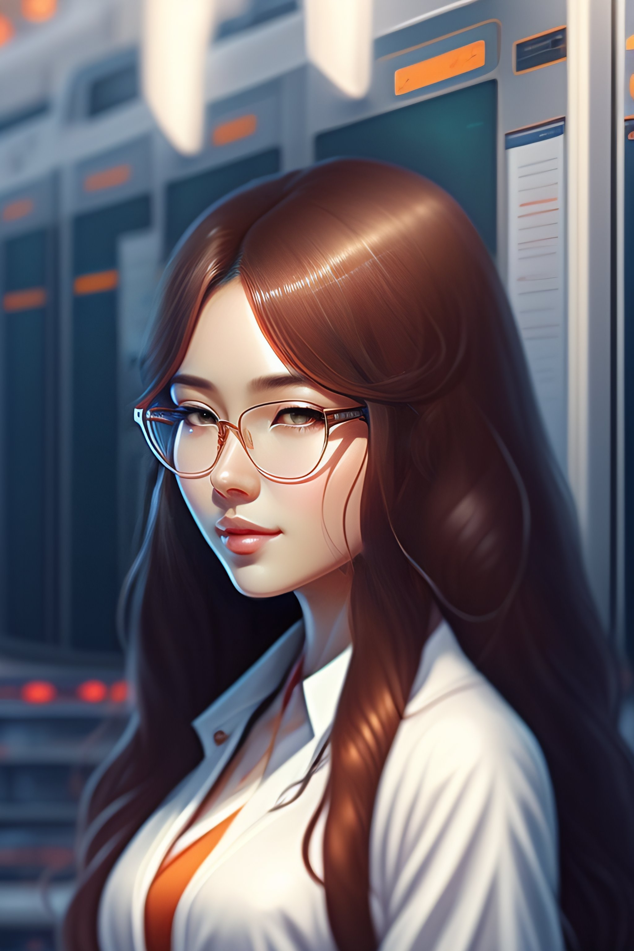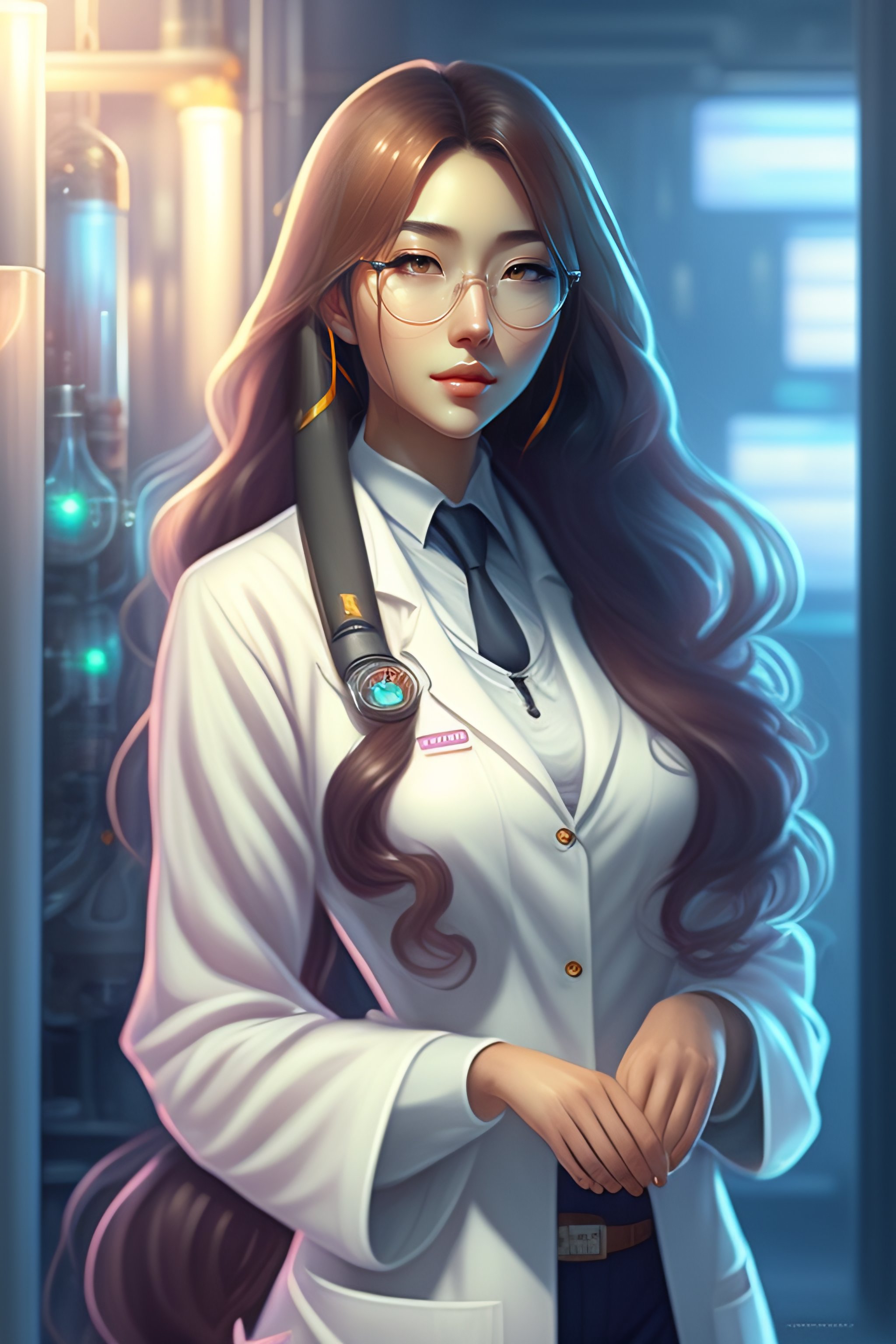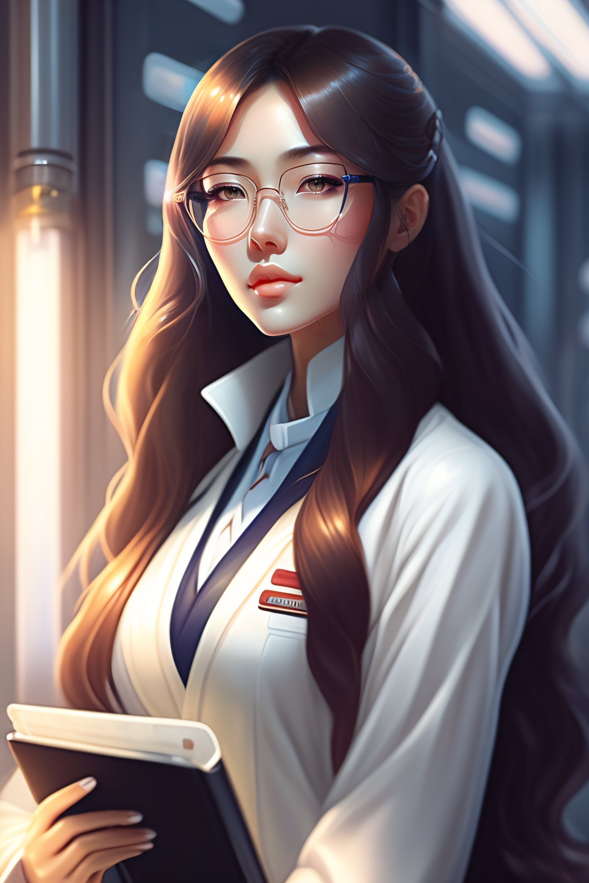 Beautiful anime girl with long hair, wearing lab coat and glasses, holding a clipboard, standing inside a research facility, character portrait, long hair, intricate, elegant, highly detailed, digital painting, artstation, concept art, smooth, sharp focus, illustration, art by wlop, charlie bowater and alexandra fomina