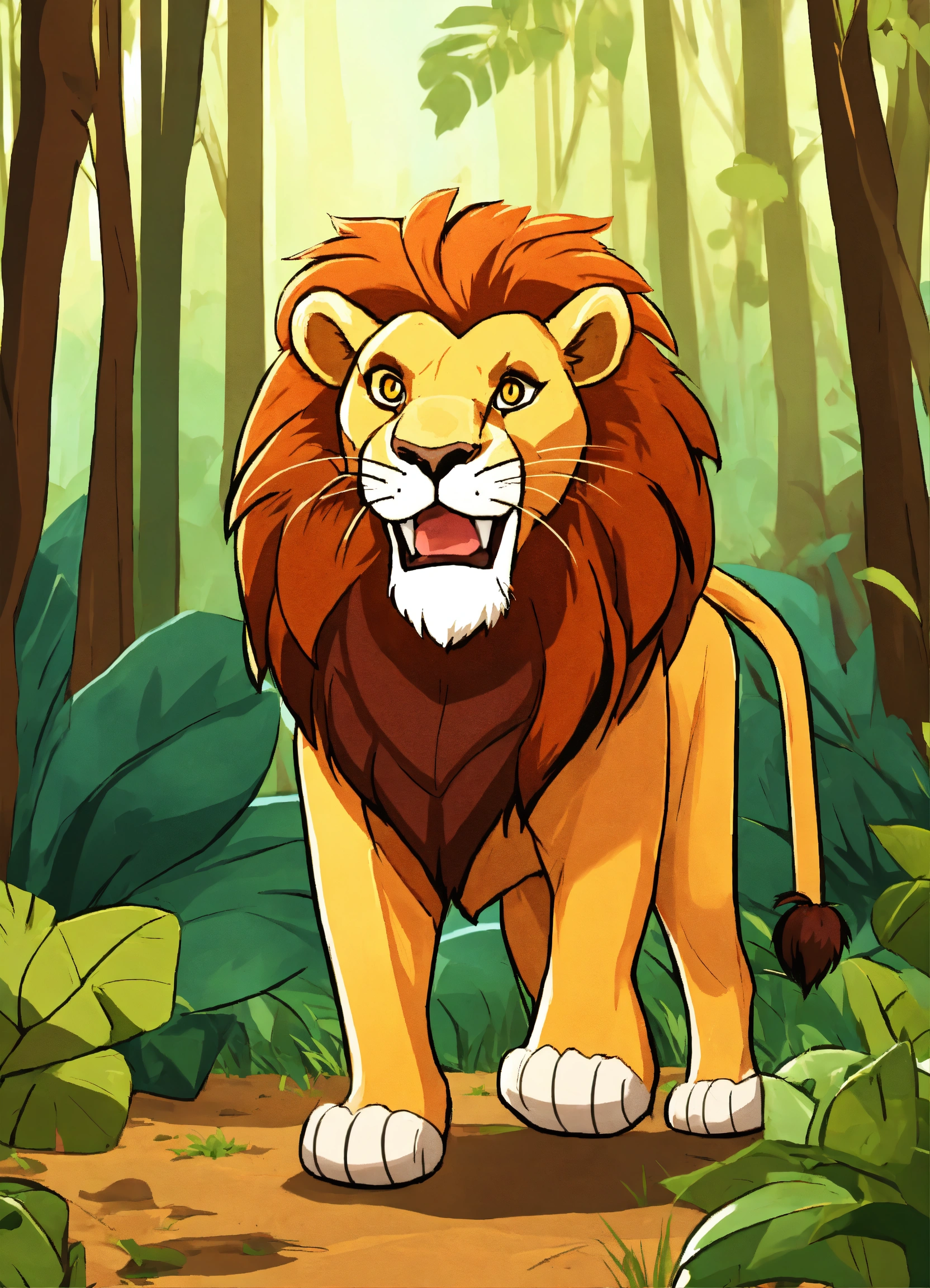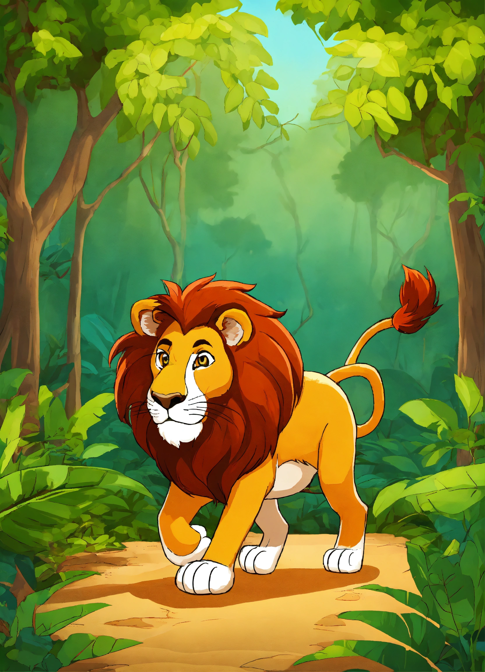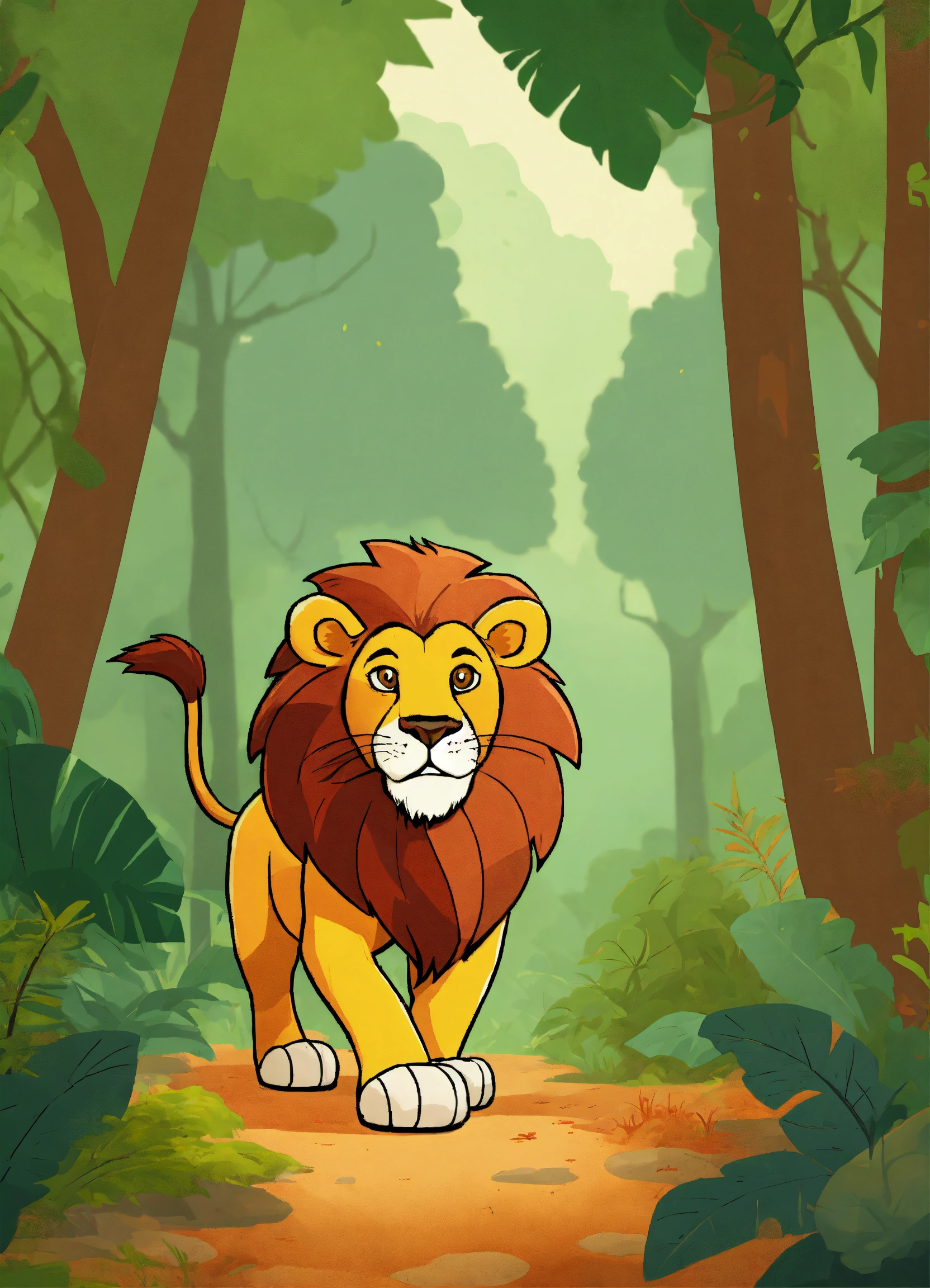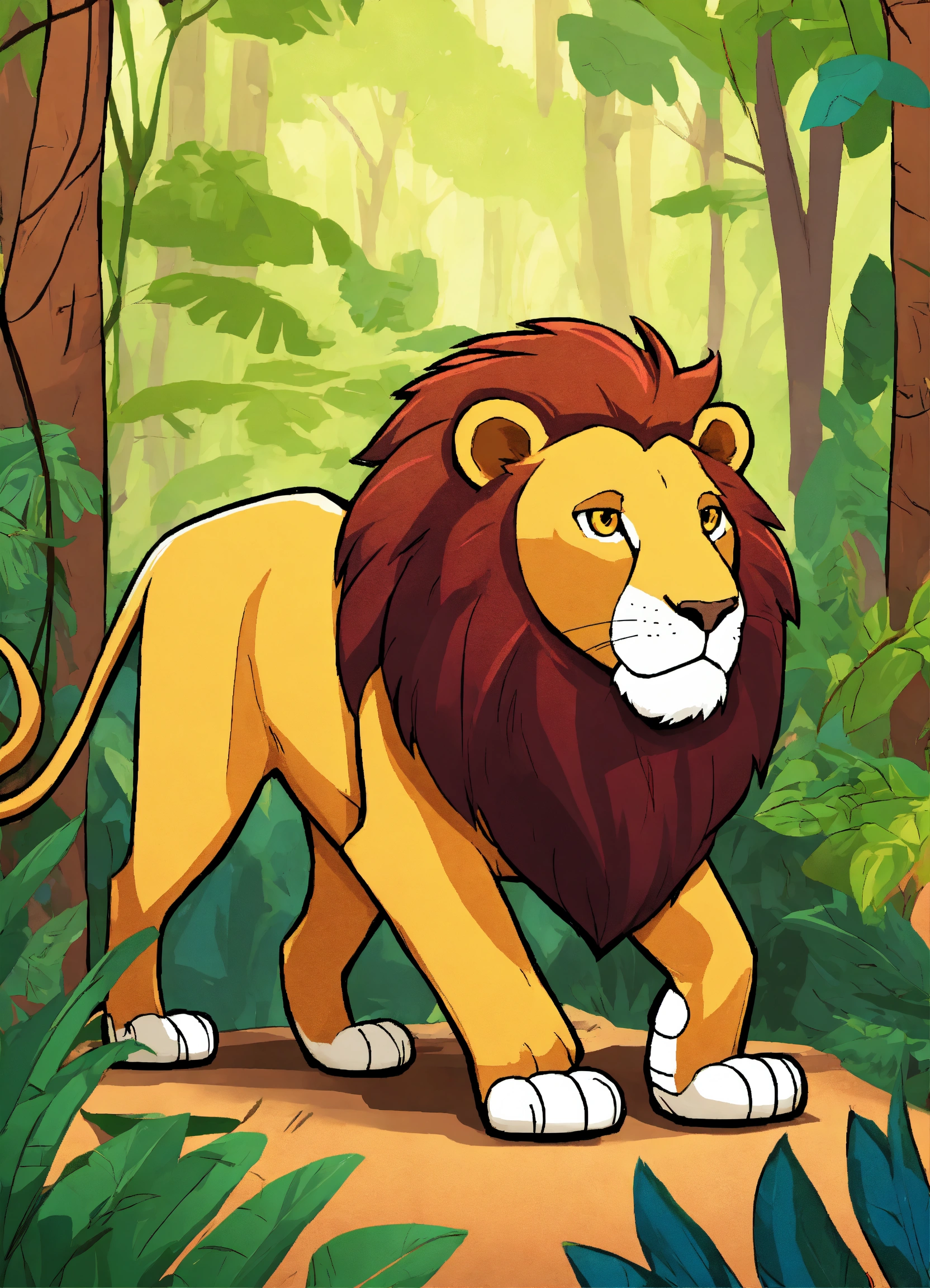 Cartoon lion walking in dense jungle