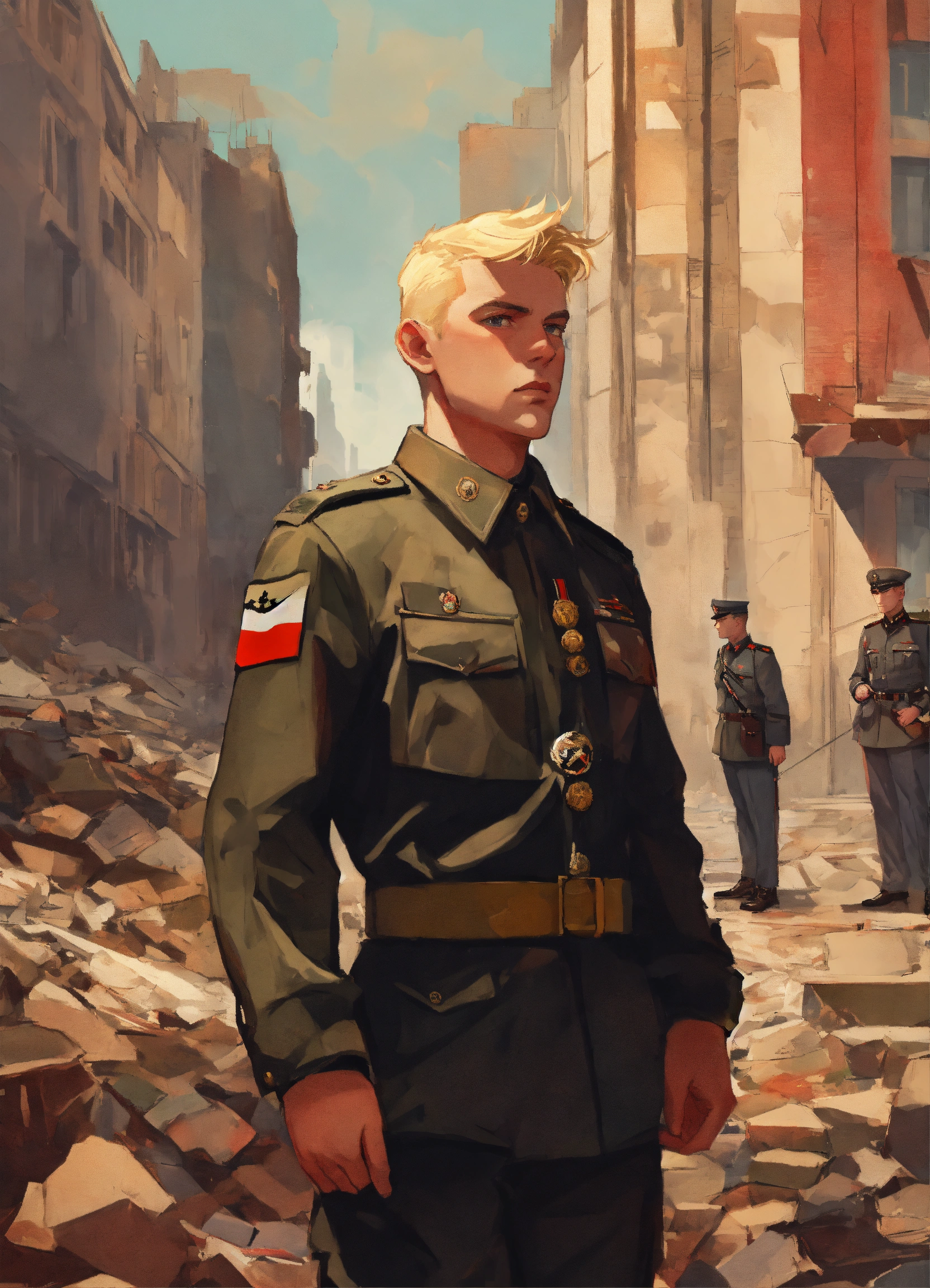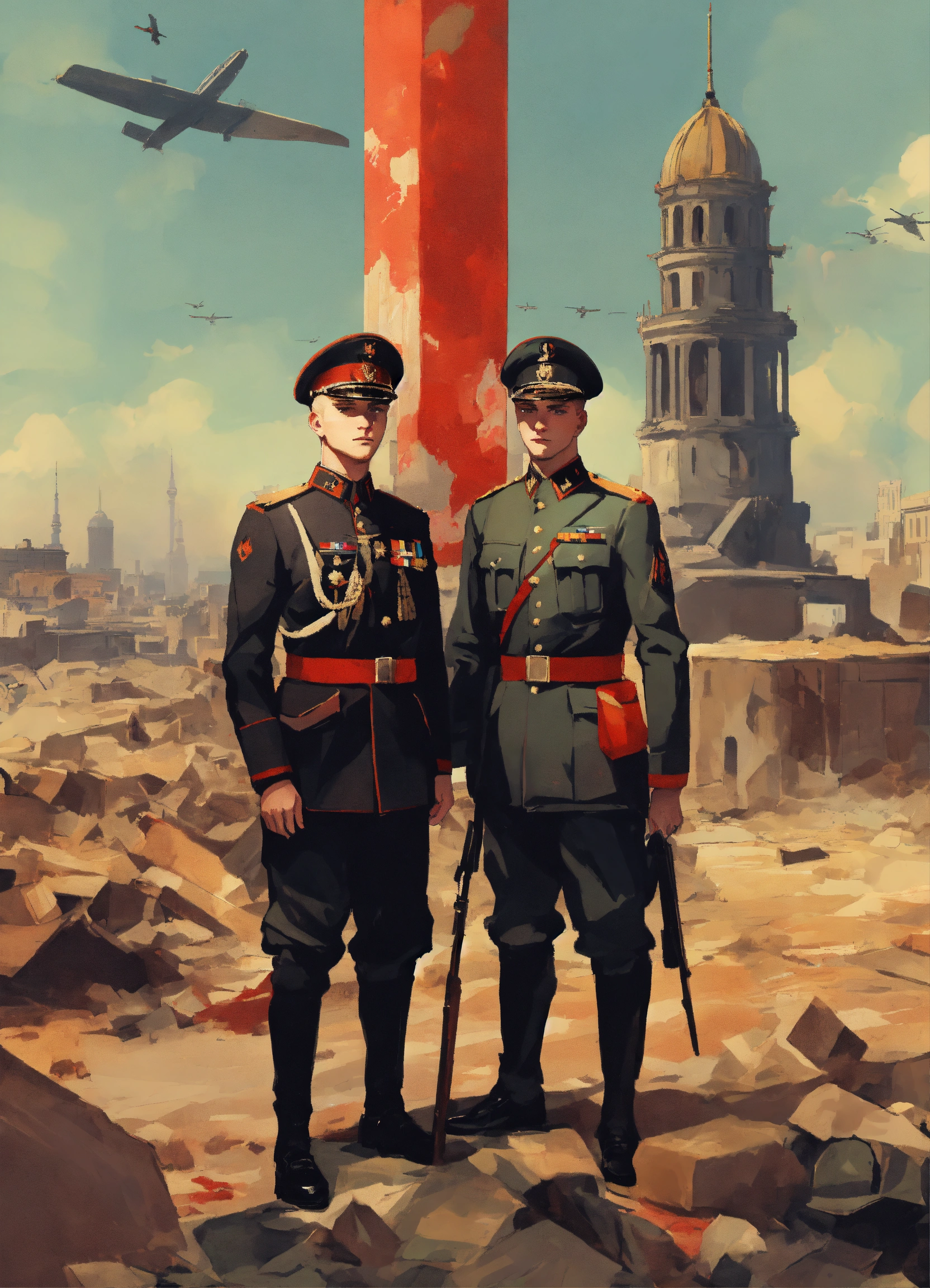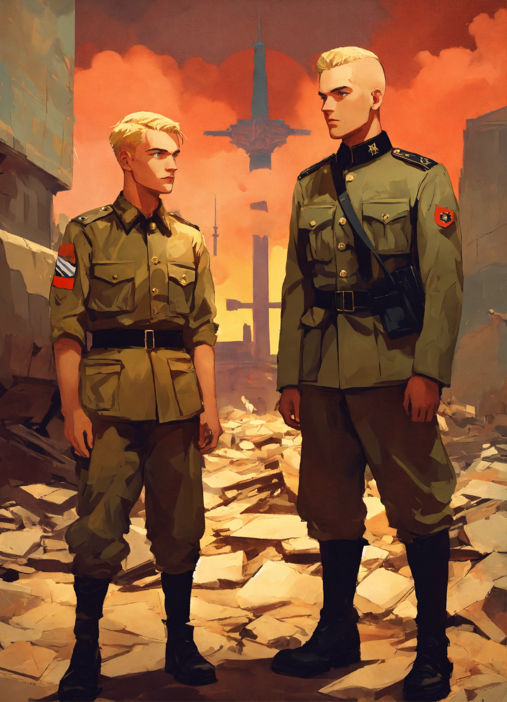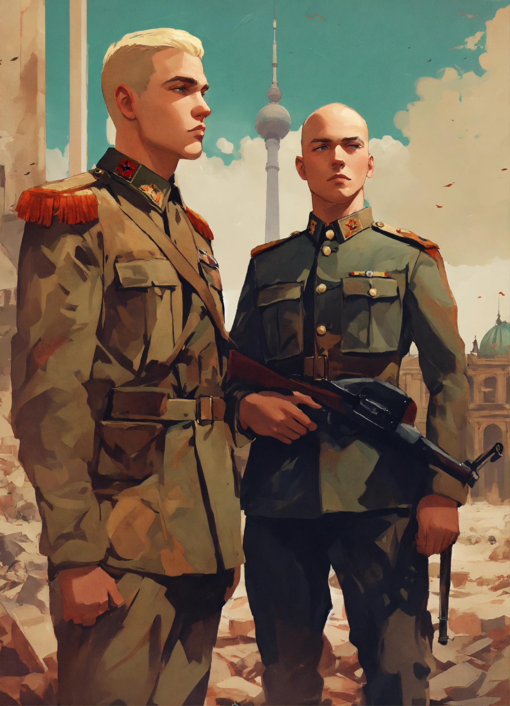 Grimdark, 1945, on the left side a serious male 21 year old world war 2 german soldier wearing a black uniform with blonde hair staring at you, a serious bald 24 year old world war 2 male soviet soldier with on the right side staring at you, hd, abstract, cartoon, by sachin teng x supreme, world war 2, ruins of berlin in the background, grunge
