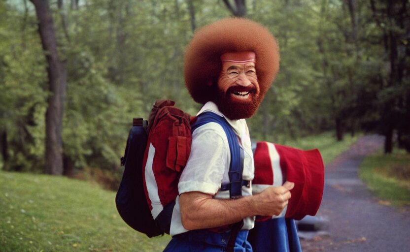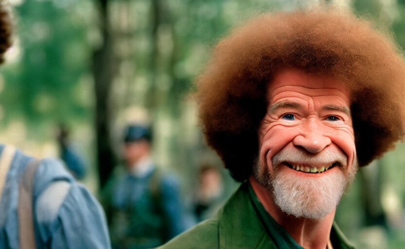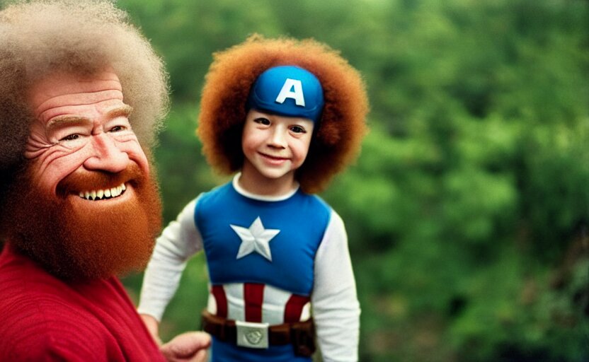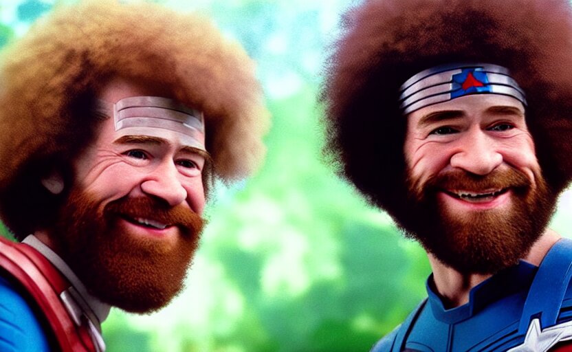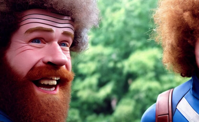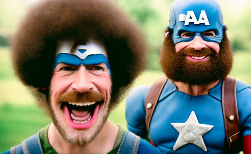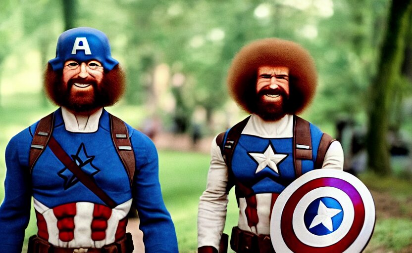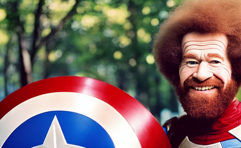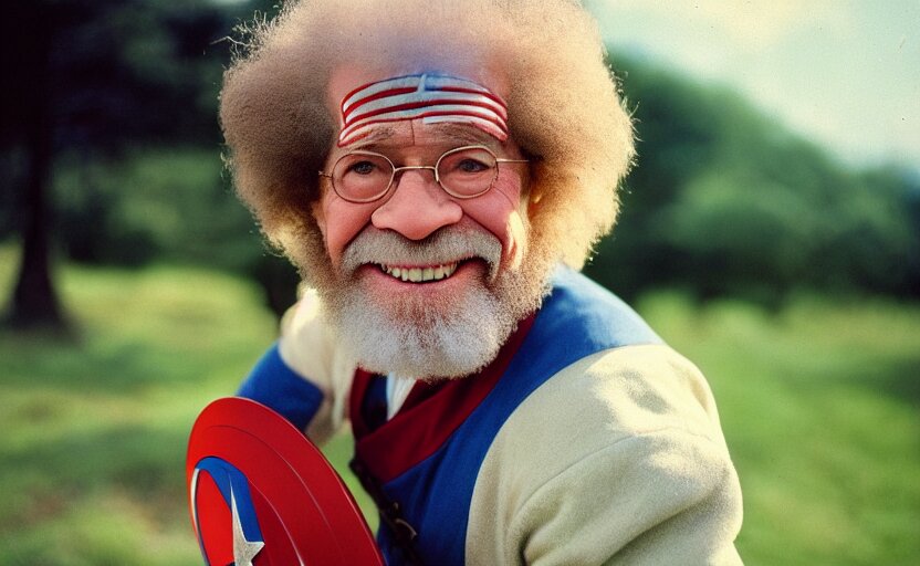 Cinestill 5 0 d candid photographic portrait by helen levitt of a smiling bob ross as captain america, modern, bright, emotional cinematic, on a green hill, 8 k, hd, high resolution, 3 5 mm, f / 3 2, ultra realistic faces, ex machina