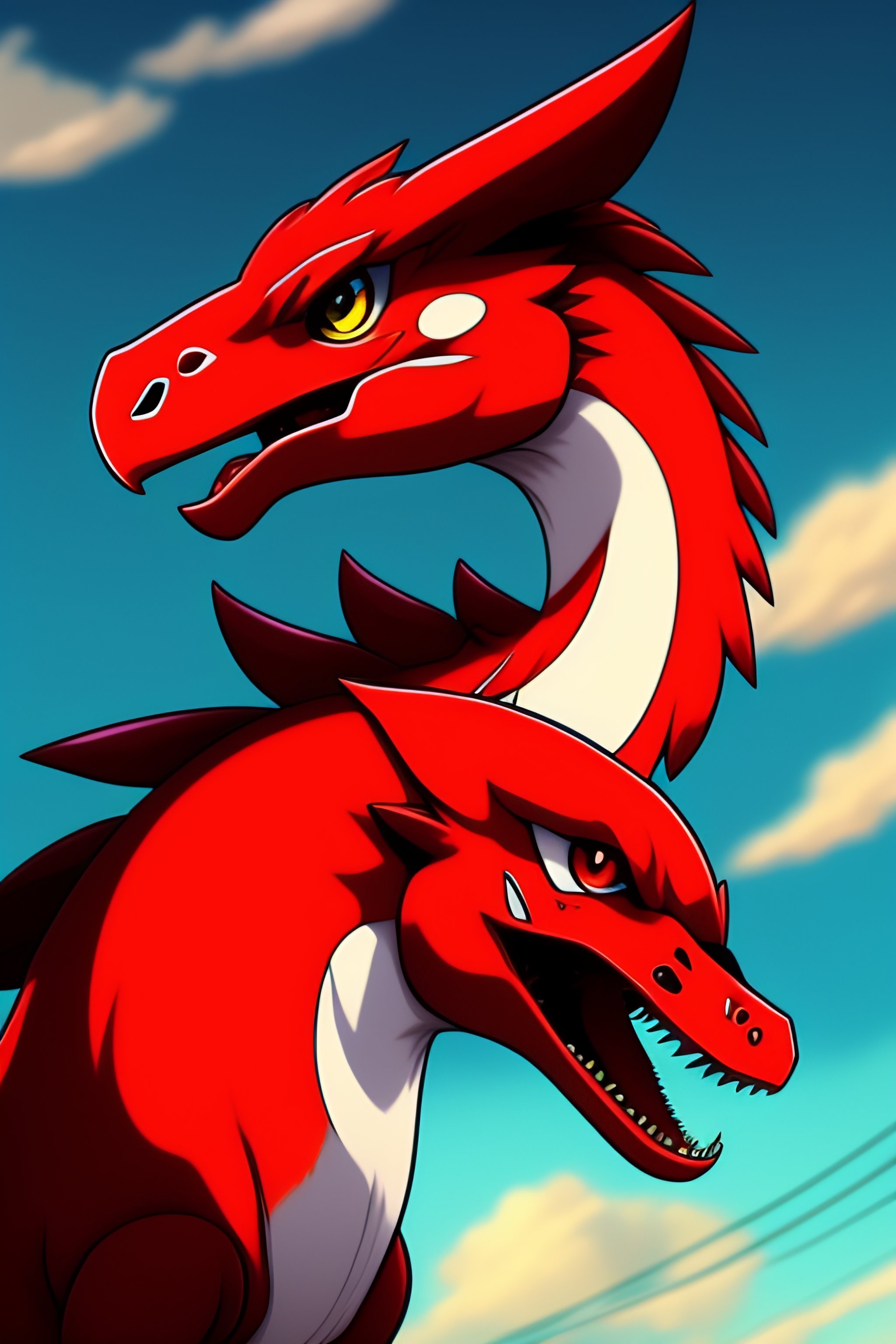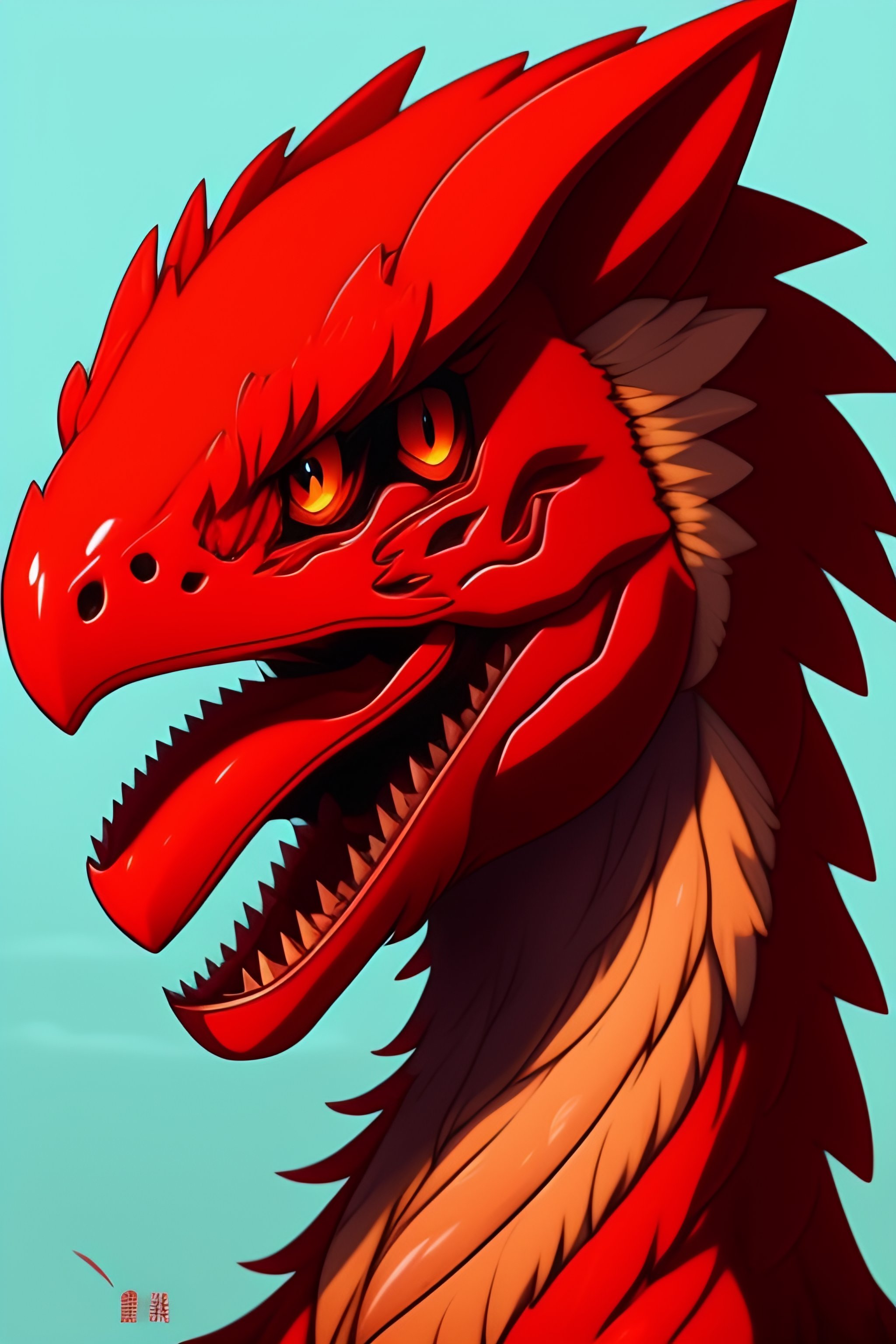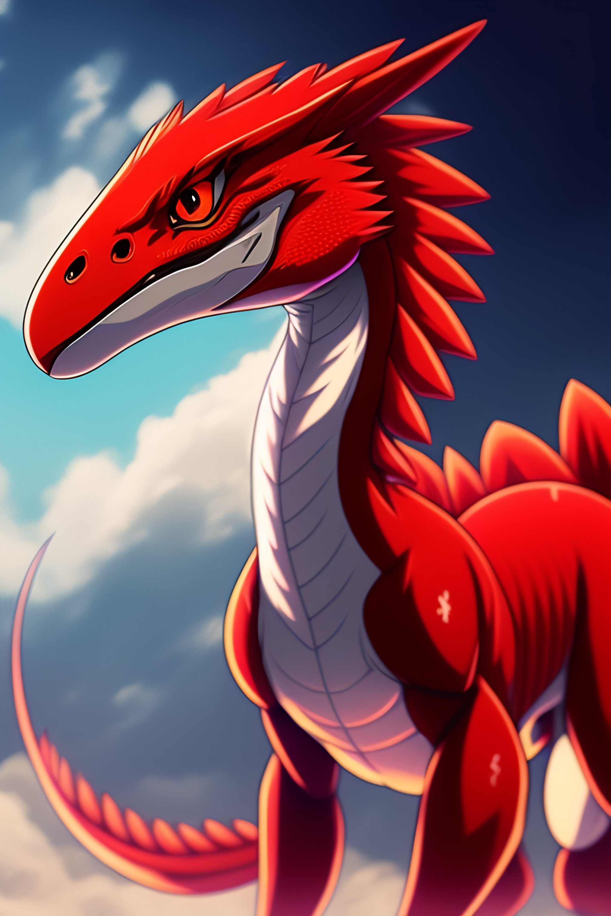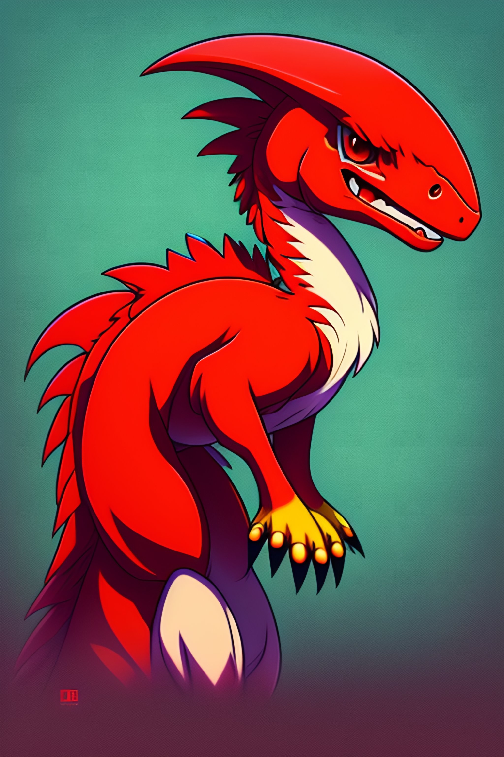 Anime illustration of a cute red velociraptor like pokemon with a v crest on it's head
