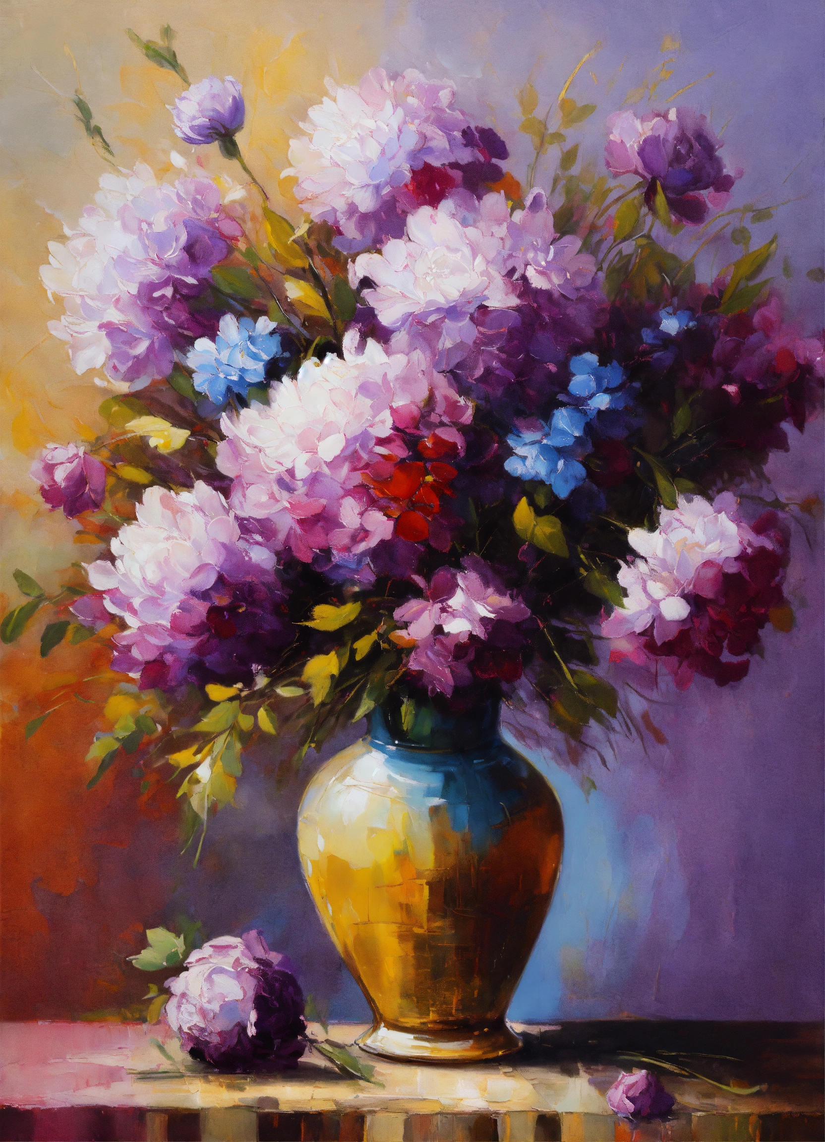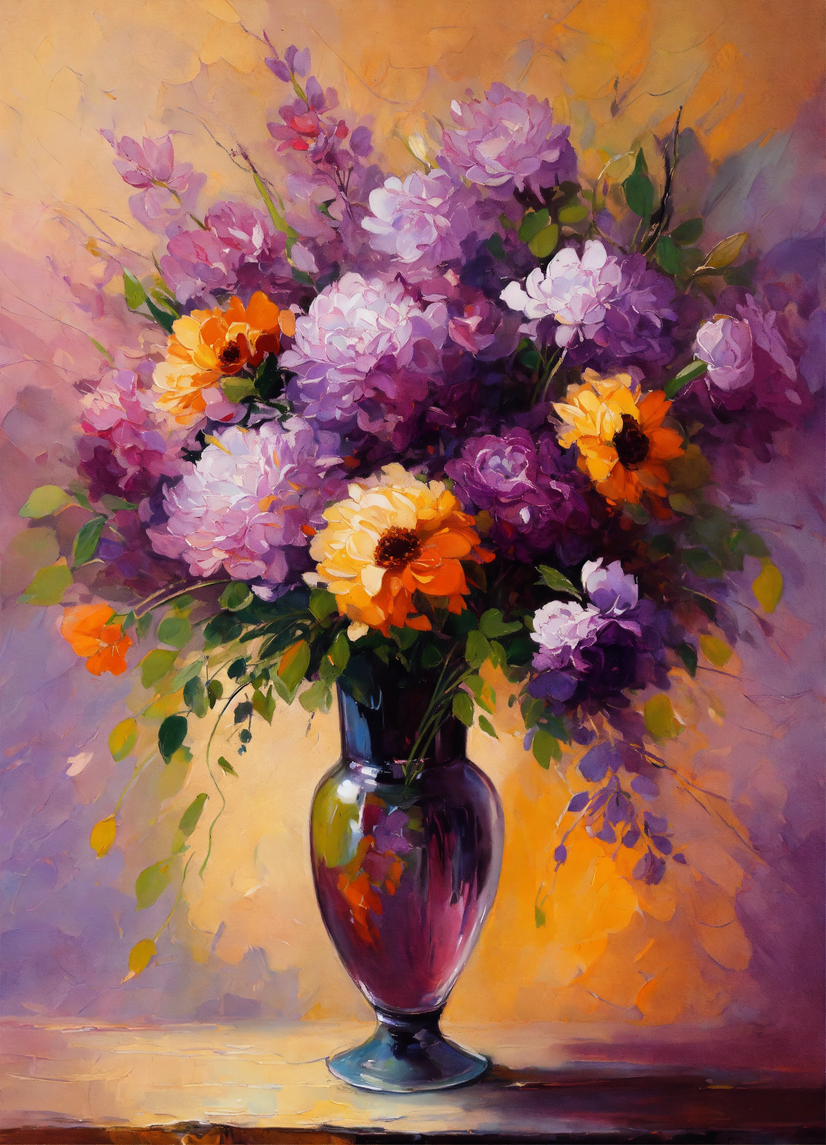 Abstract impressionistic oil painting beautiful purple floral bouquet in a vase, very detailed, the master's strokes, sharp colors, and very charming, high resolution, pastel background
