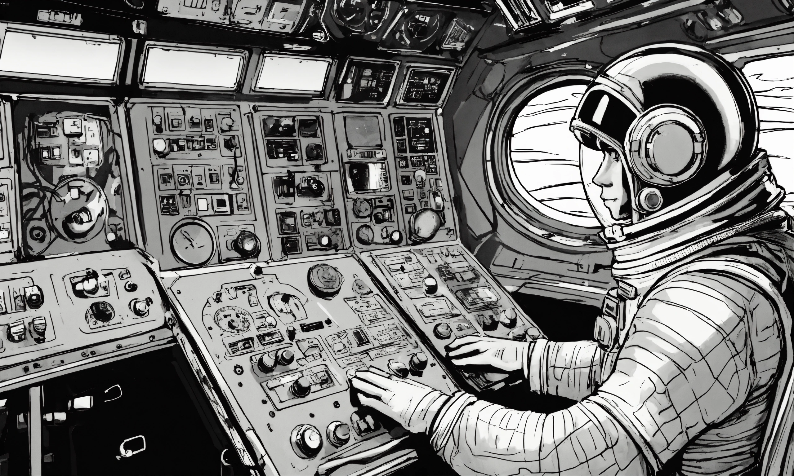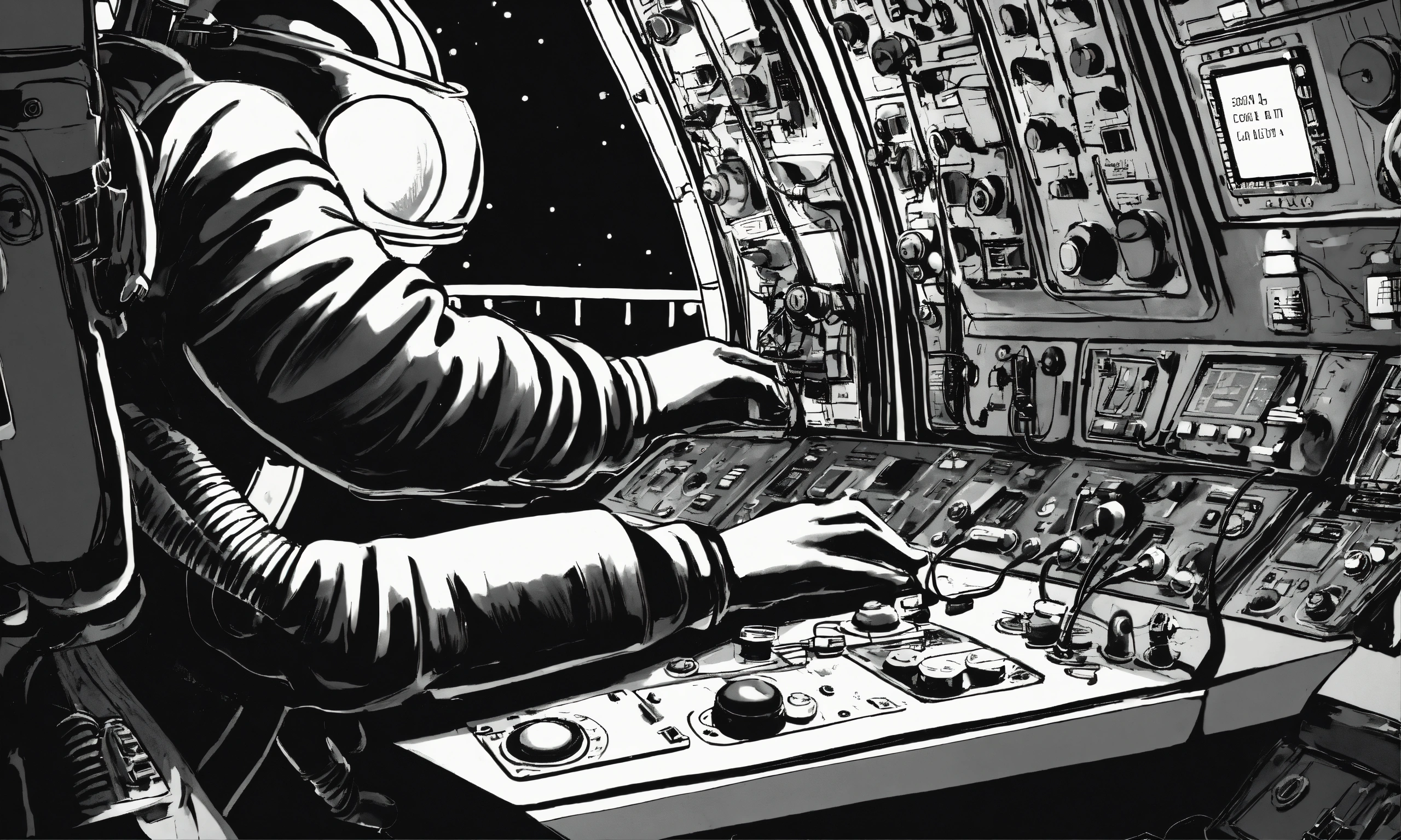 Astronaut about to press launch button on spaceship control panel, comic, surrealism, american, black and white, extreme closeup