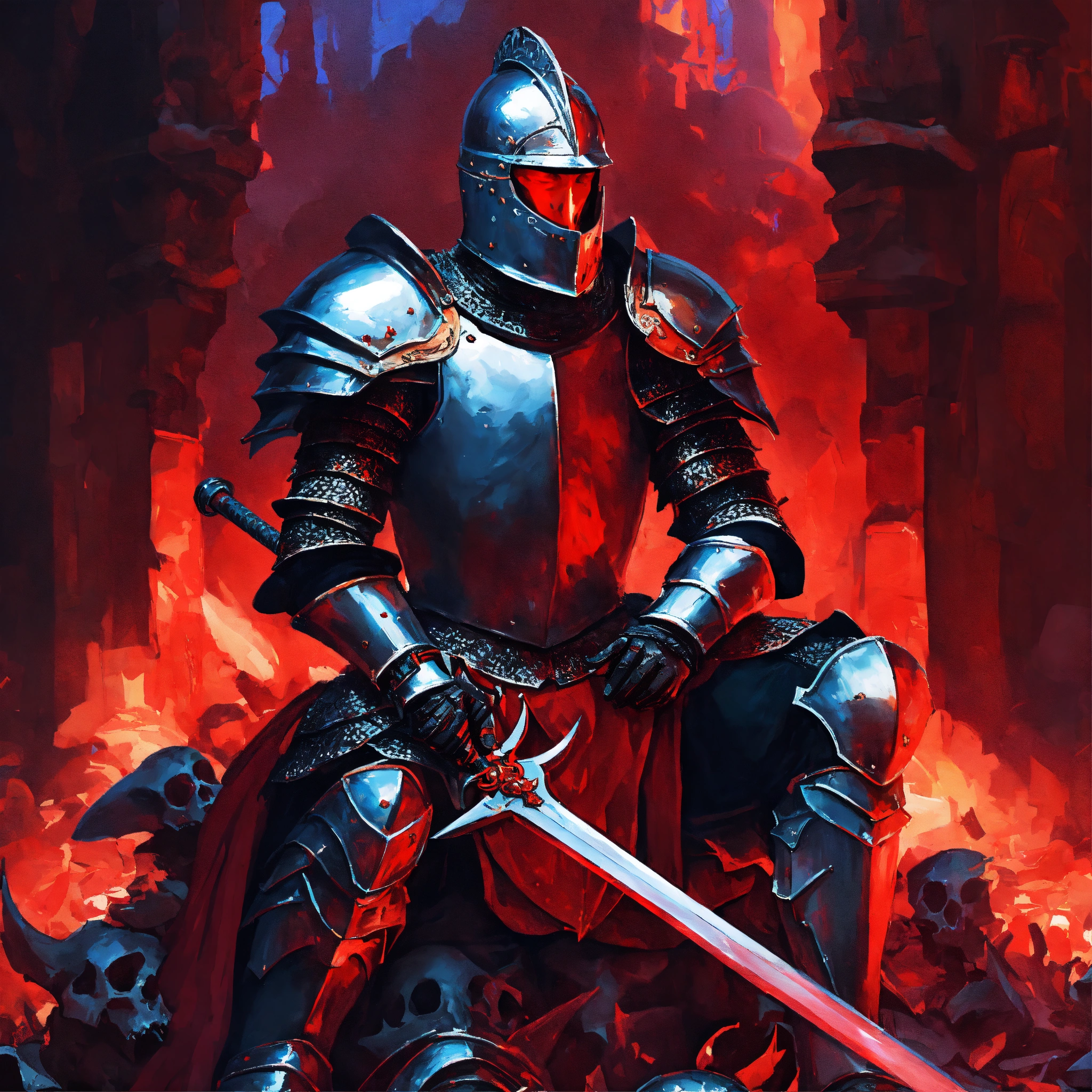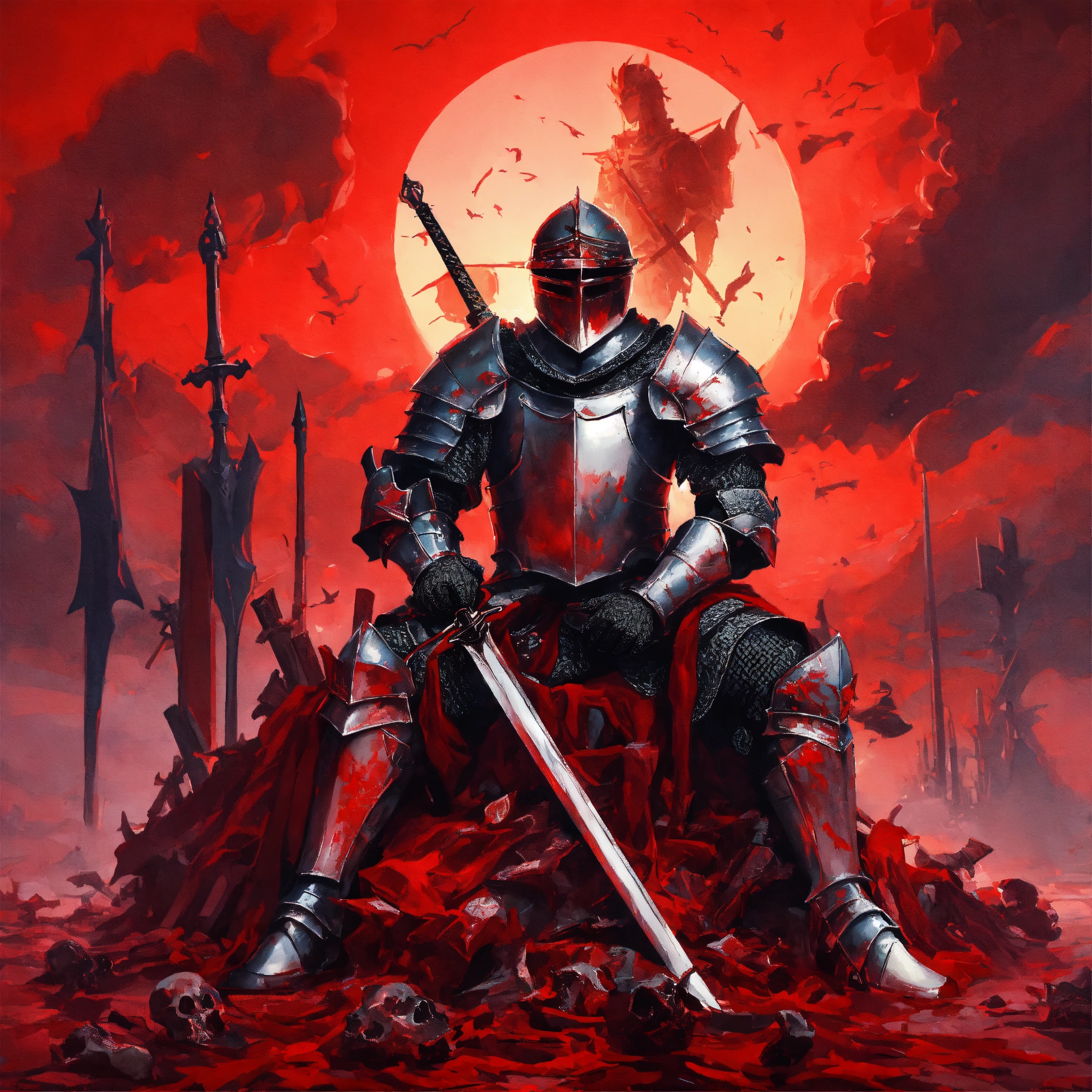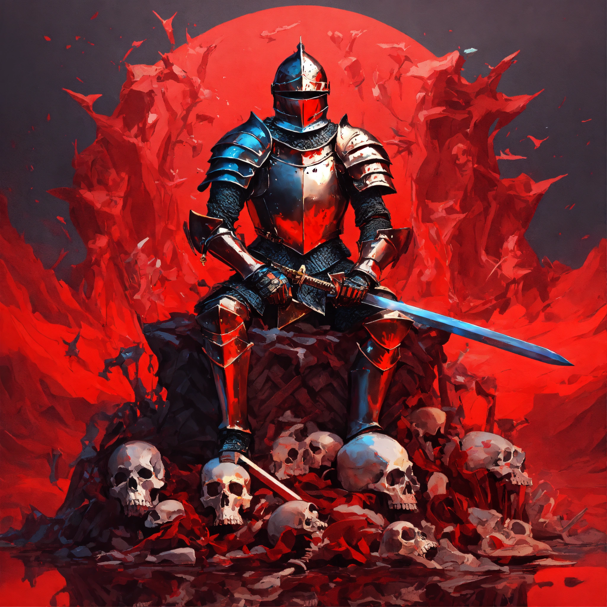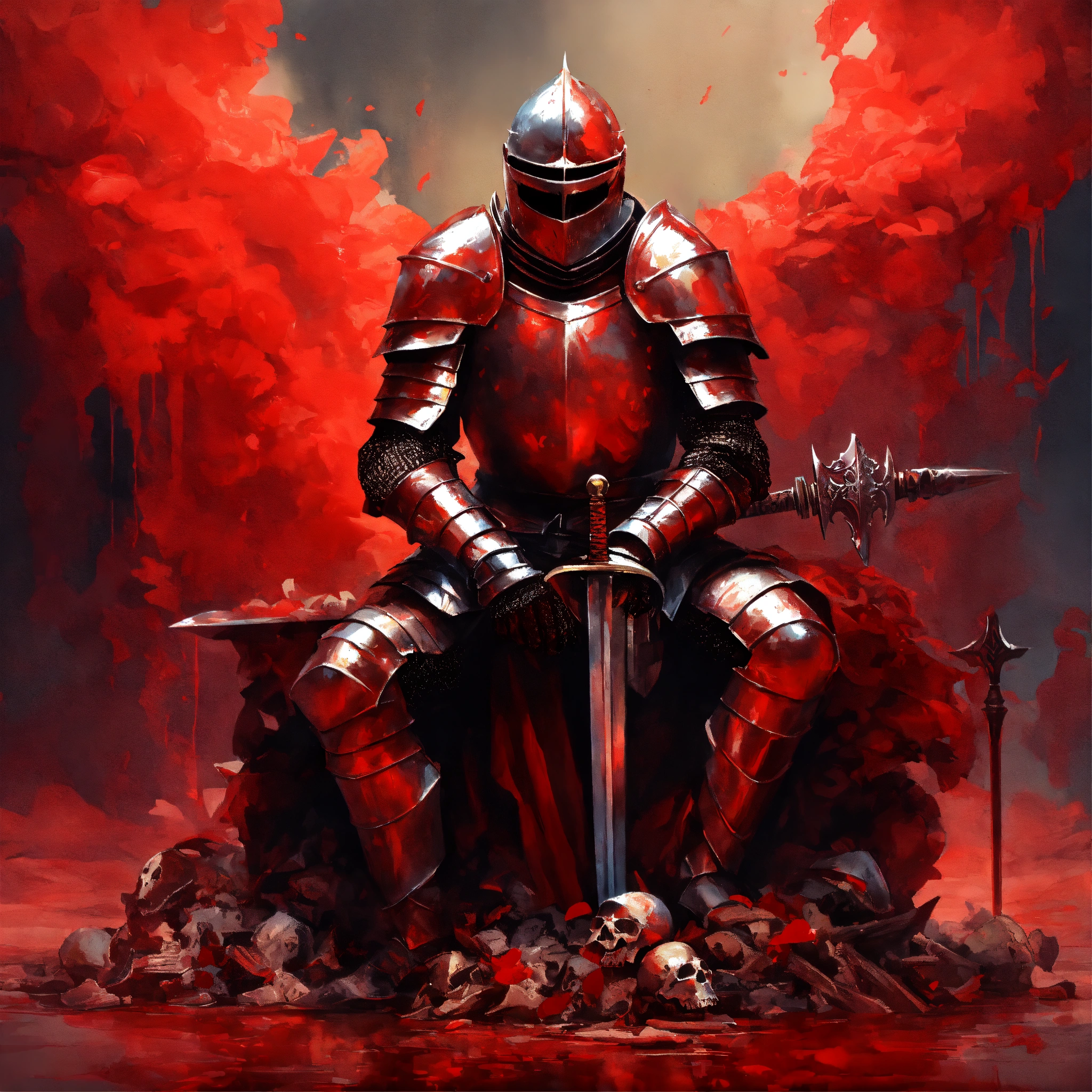Genre abstract art, a knight dressed in plate armor sits on a pile of bones and clutches his sword in his hands, everything around him is covered with scarlet water