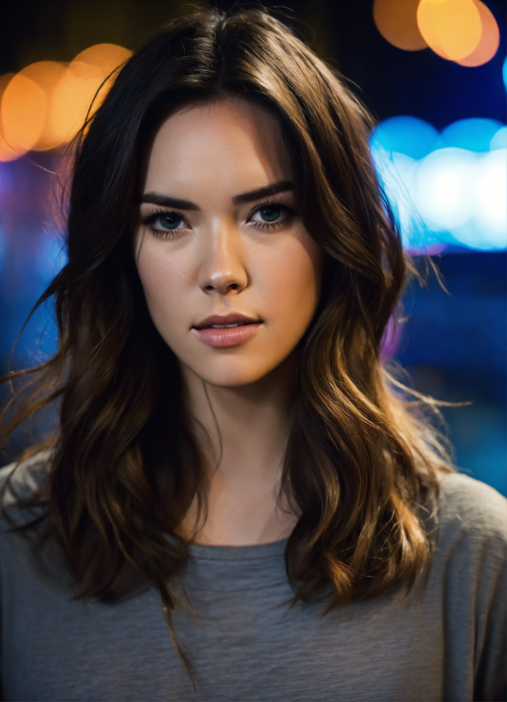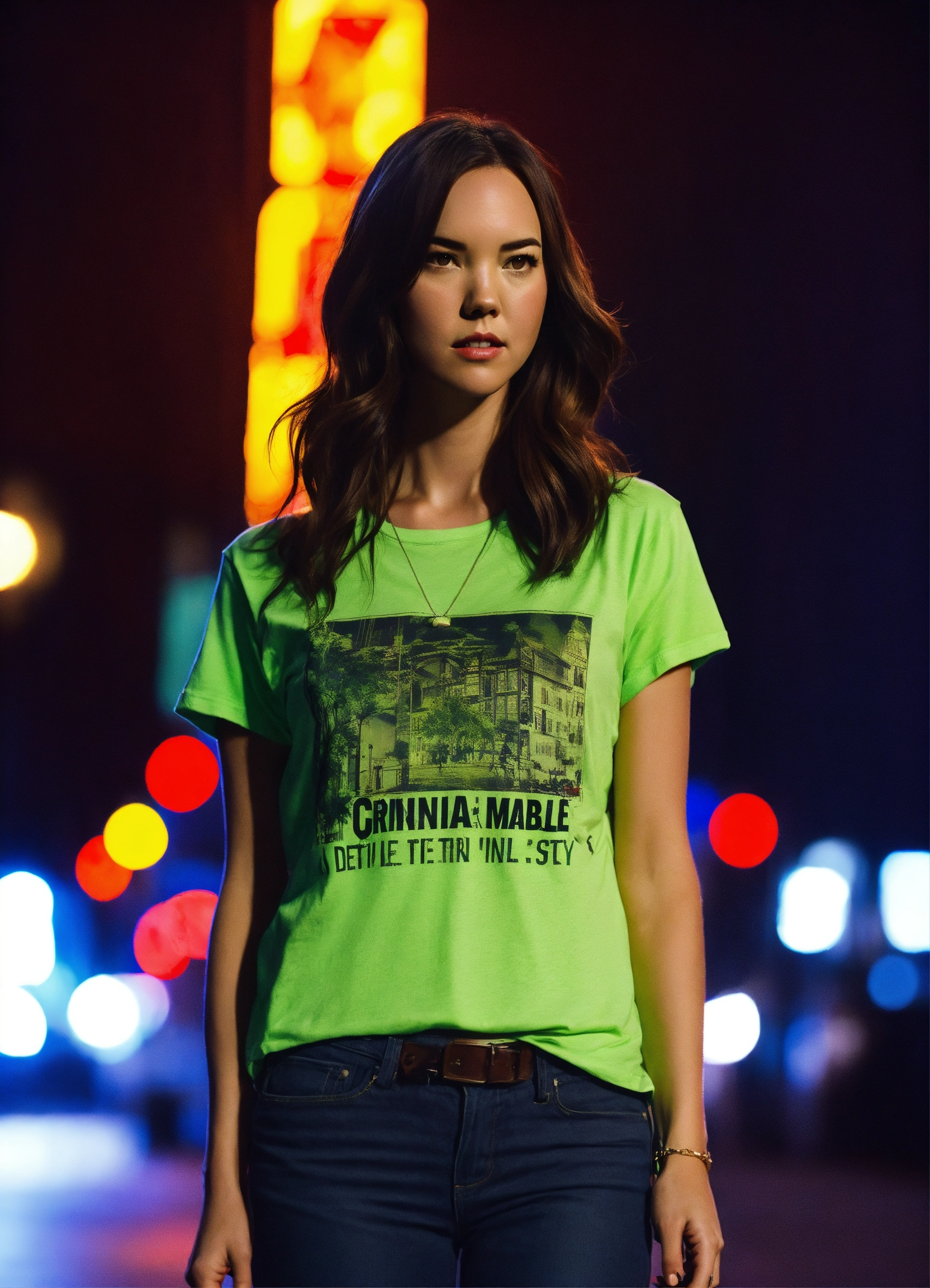 Beautiful young odette annable, big eyes with chestnut hair, walk, criminal mind style, danger, detective story, scared, night, cinematic, neon, t-shirt