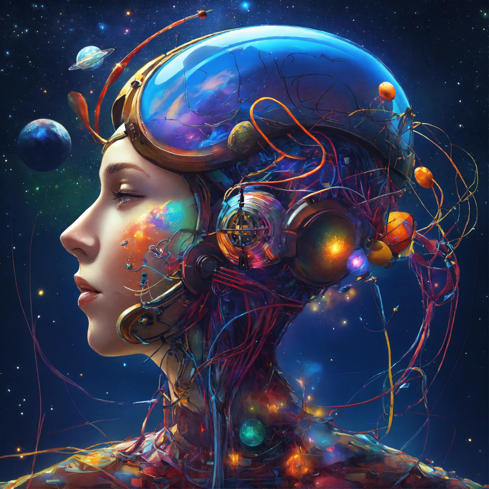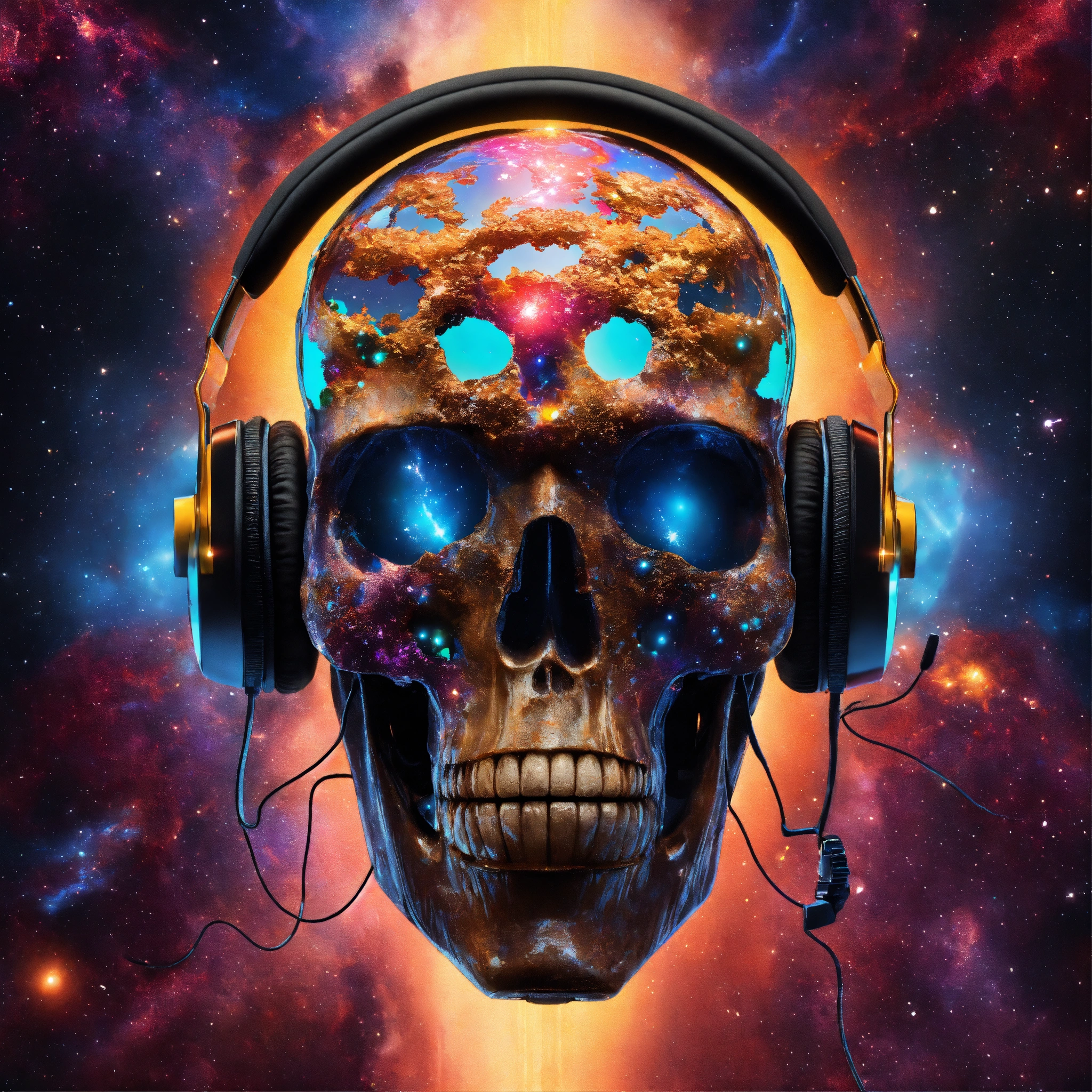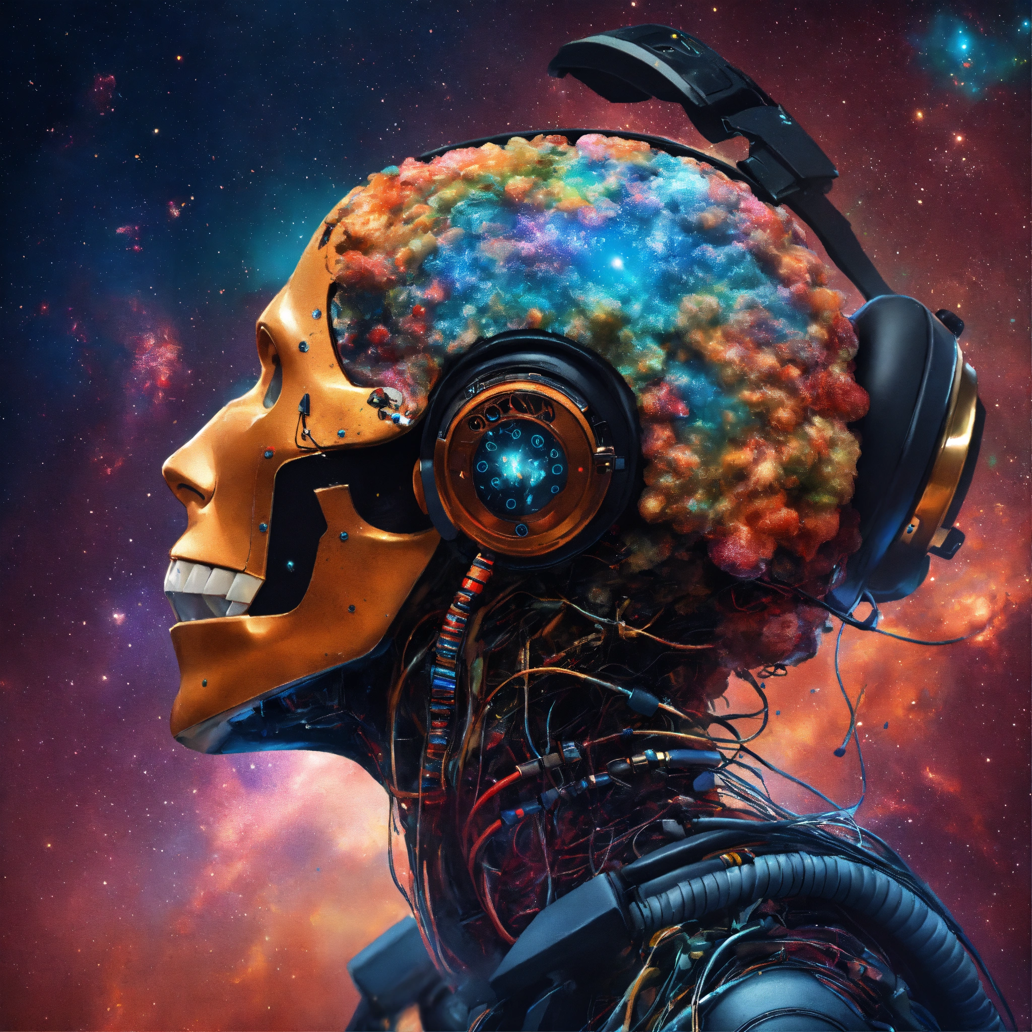 Un cerveau qui bug au milieu d'un univers galactique, comme une expérience musicale et un casque autour du cerveau.