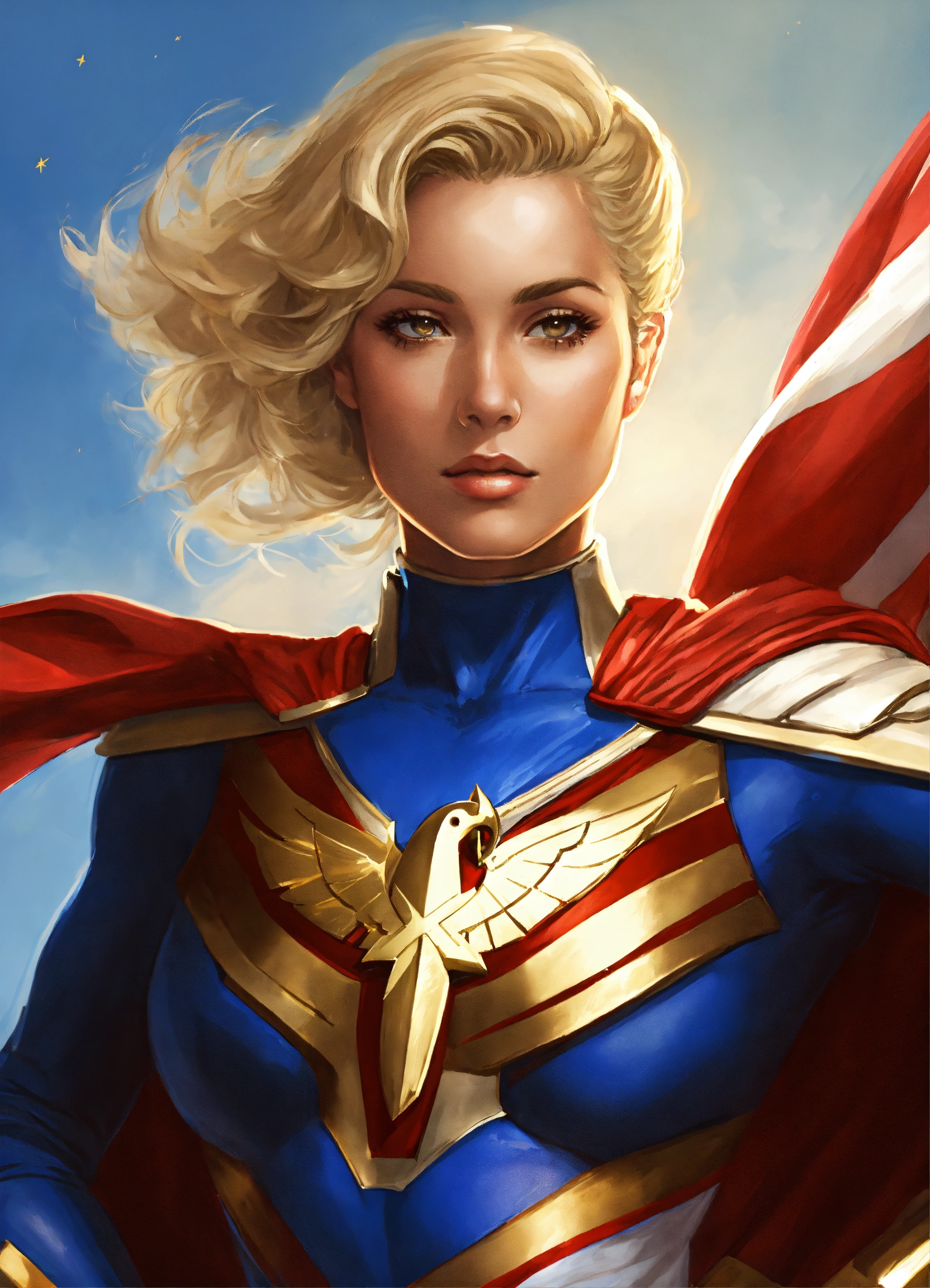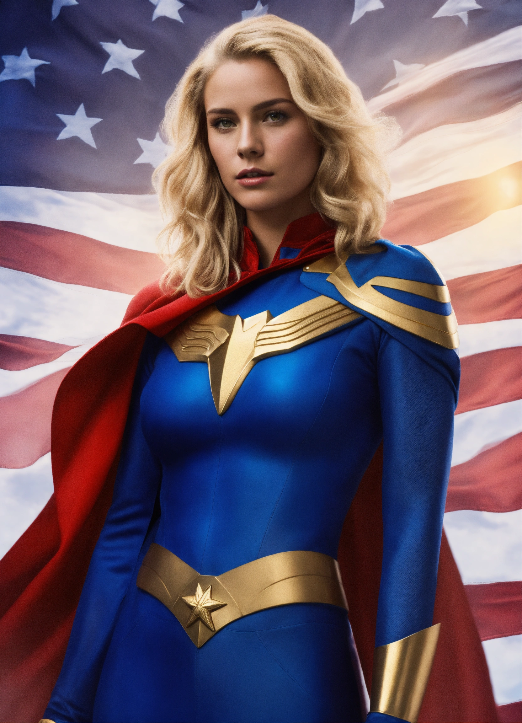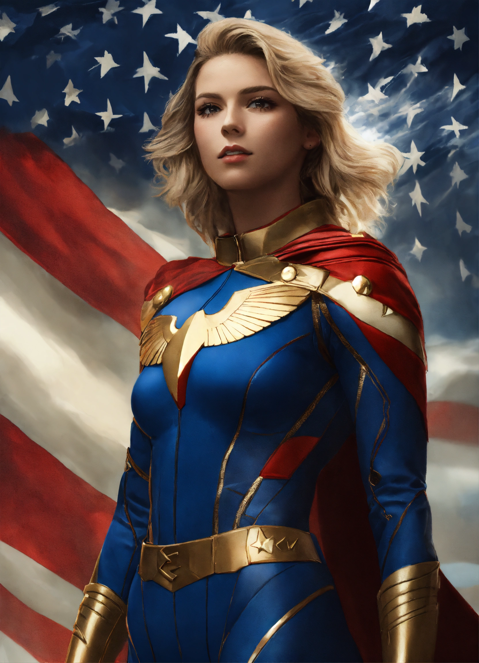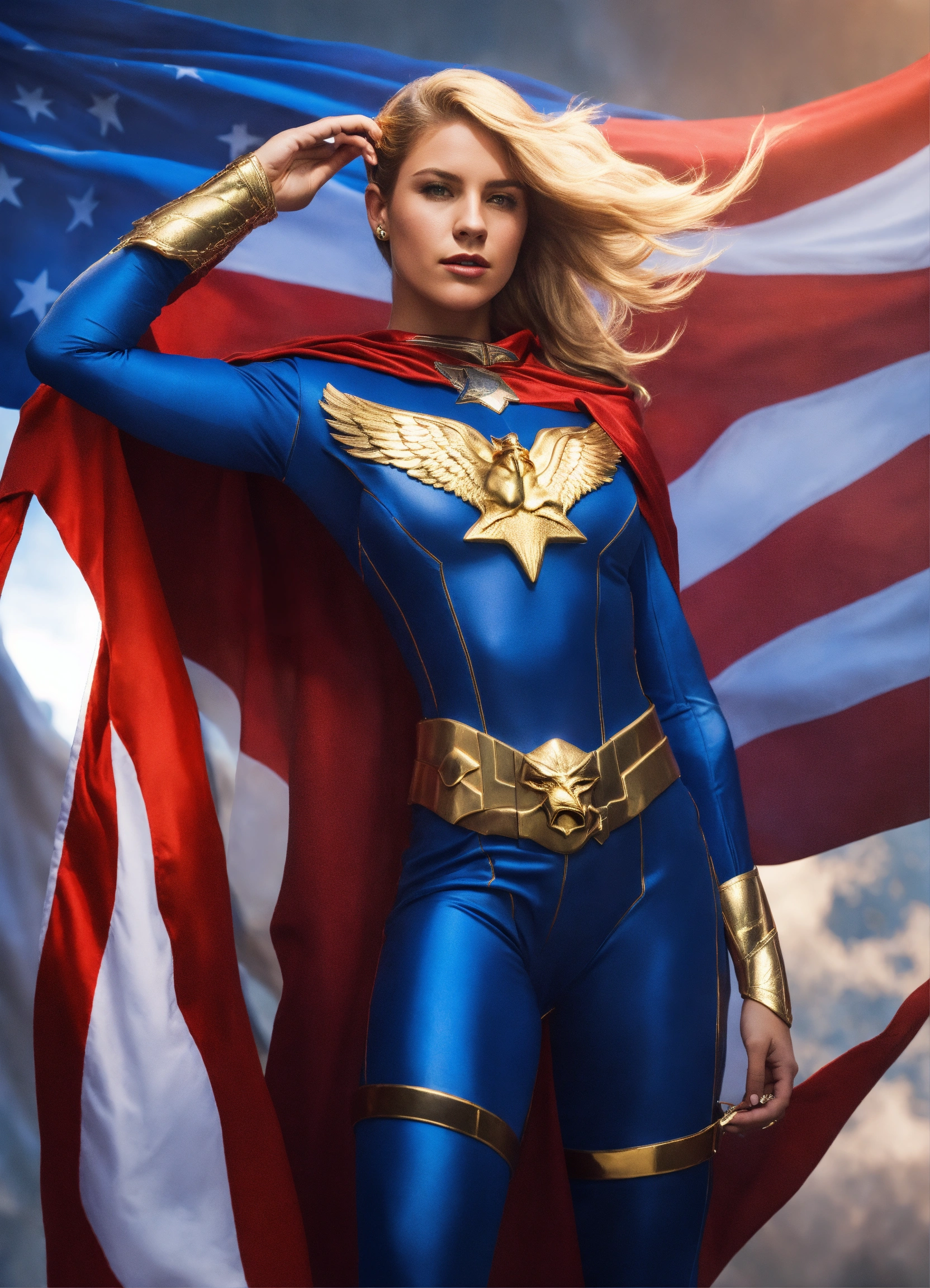 Female version of homelander from the boys, she is wearing a blue super suit with an american flag cape, one shoulder has a gold eagle's head as a pauldron, done in a photographic style