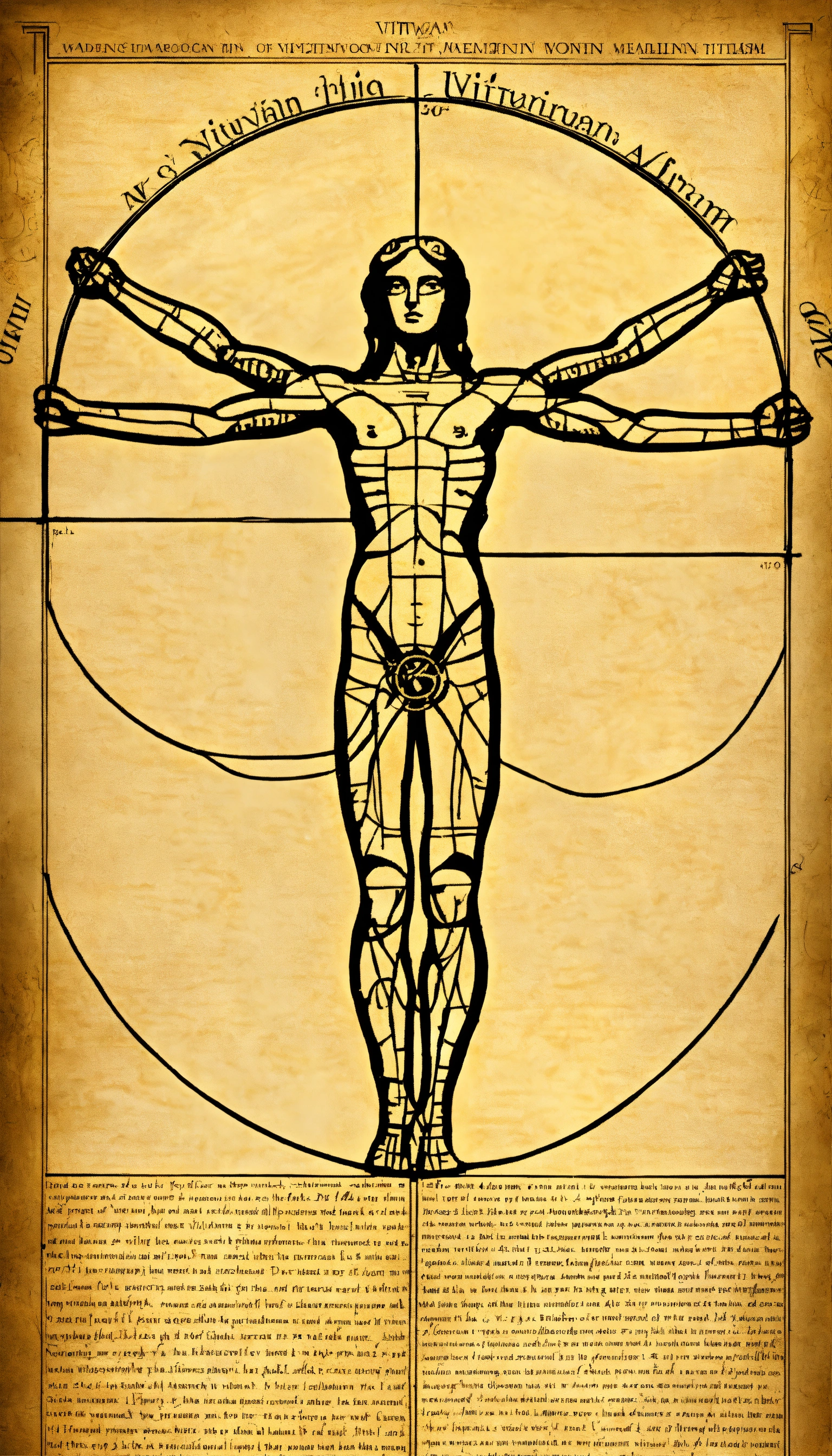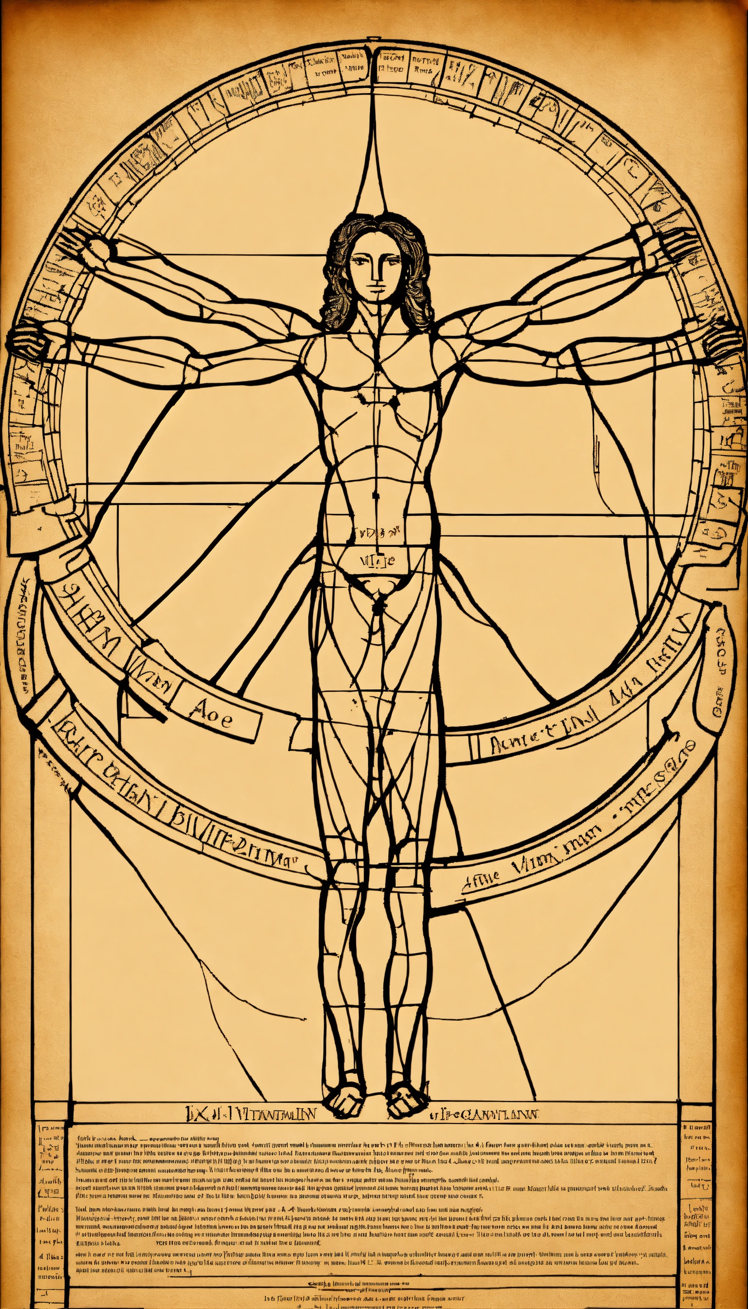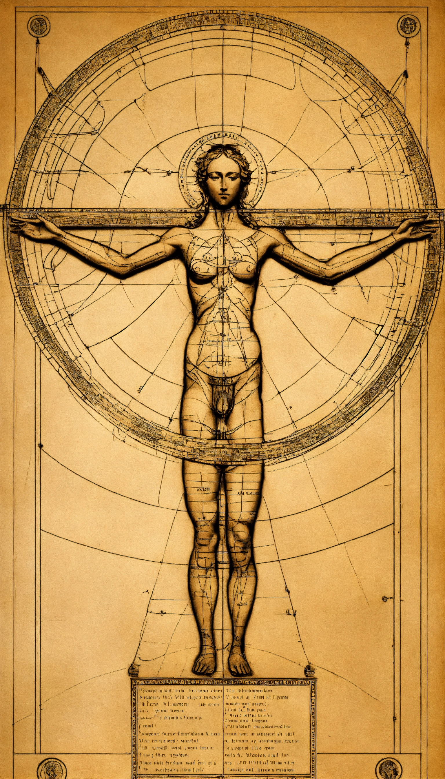 Text feminin version of the vitruvian man, intricate, with graceful curves, 4 arms, 4 legs, almost identical to the original vitruvian men.
