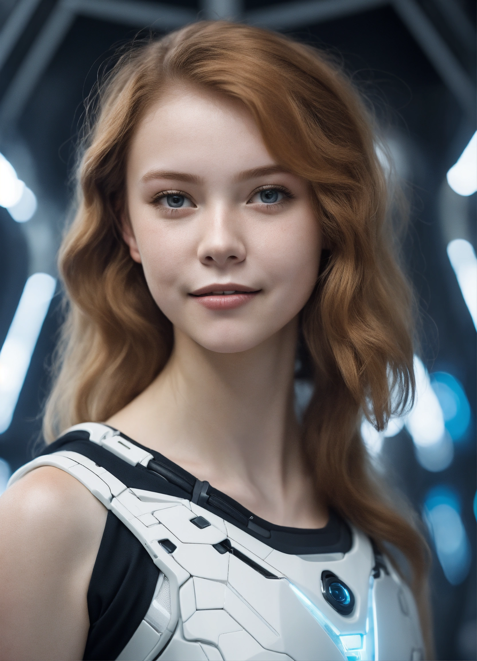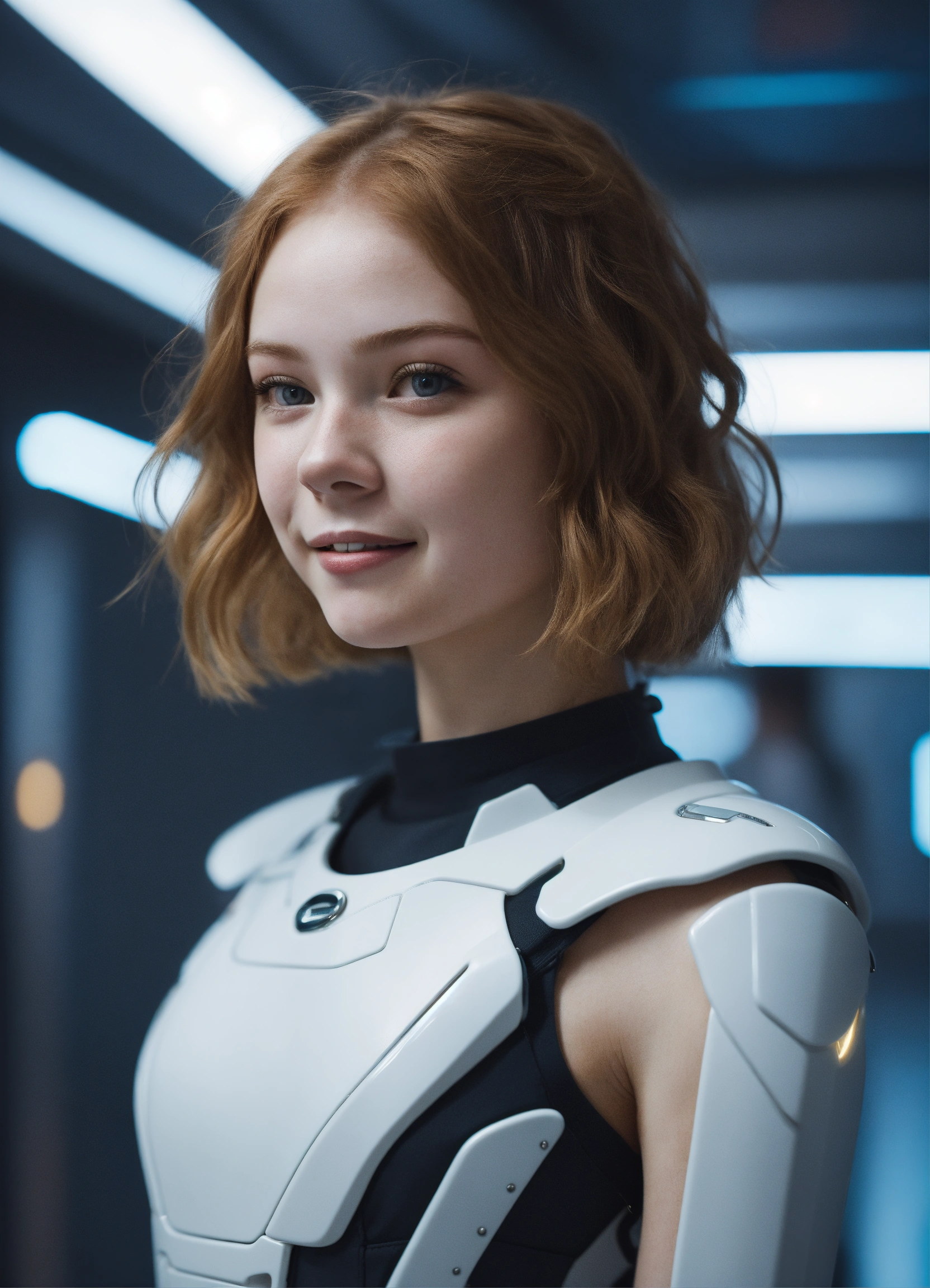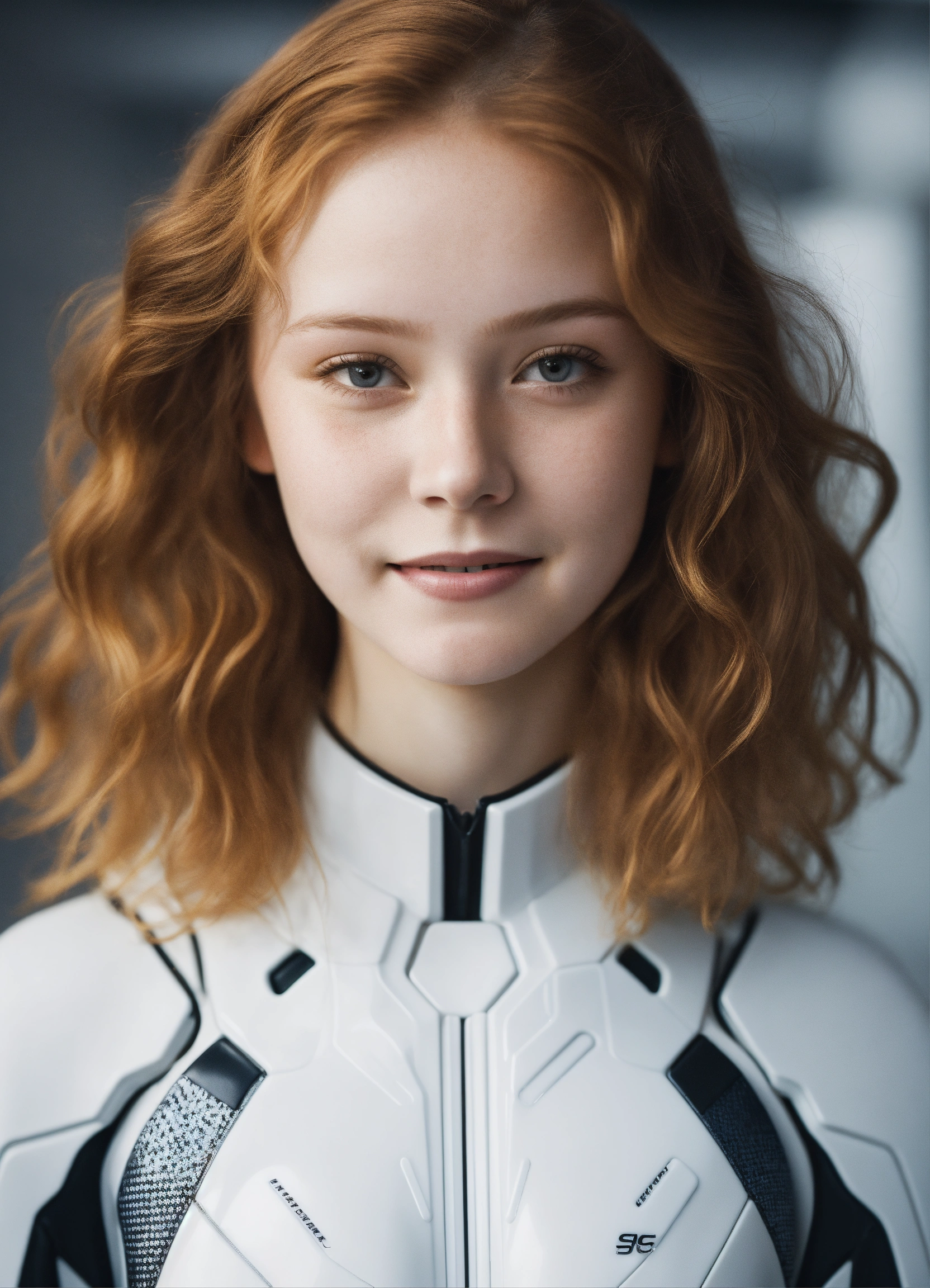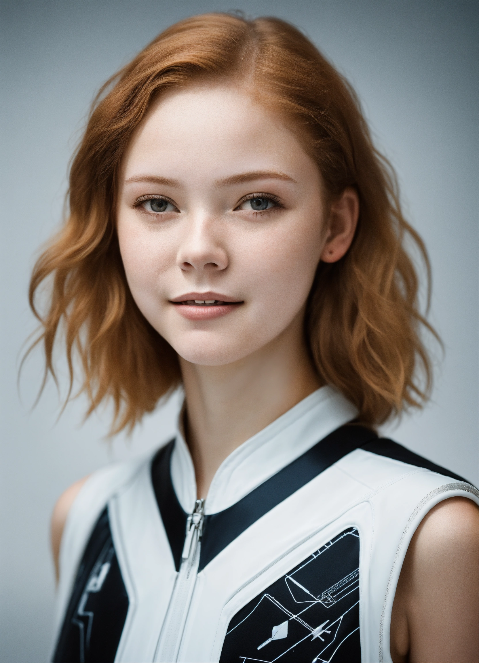An ultra detailed photo of a 15-year-old white ginger girl, with a loose mid-long, with cute traits, cheerful expression, fit body, wearing a black and white futuristic elegant dress, in a sci-fi white background.