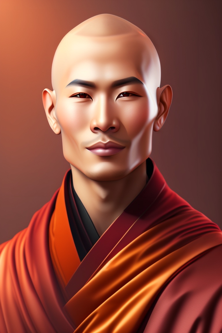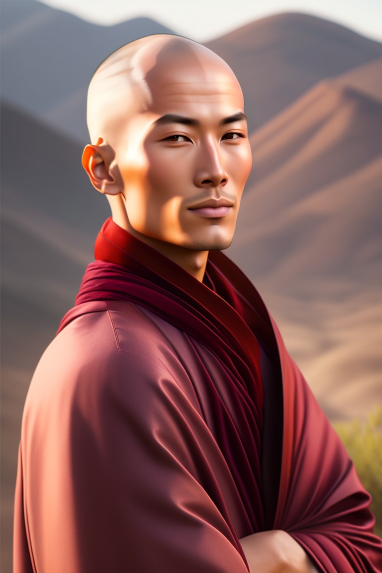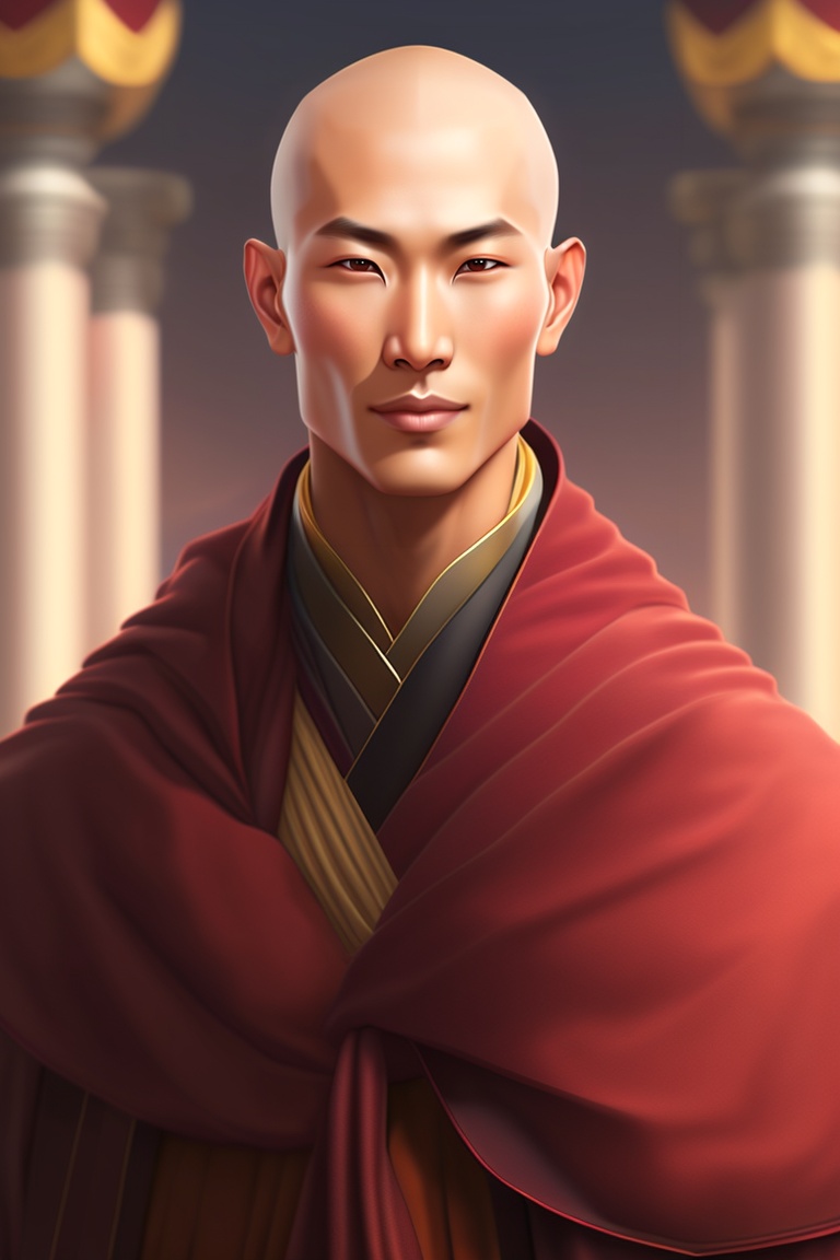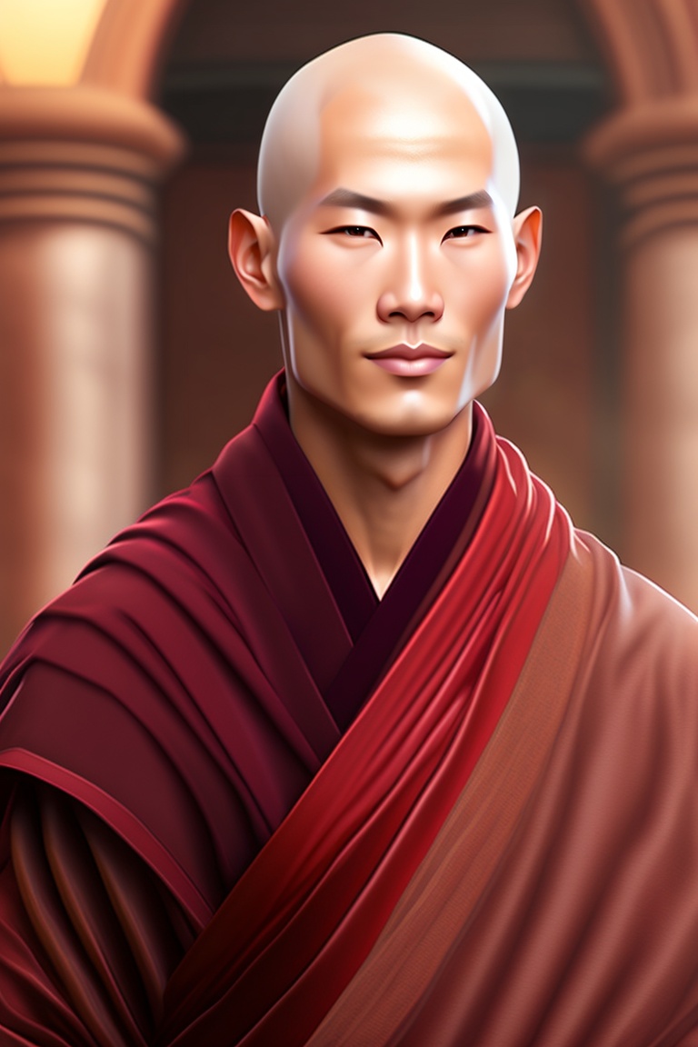 Handsome buddhist monk, bald, calm, without eyebrow tall man, slim man, extremely wheatish skin, snakelike appearance, wearing maroon robe, snake nose, snake eyes, bald, malevolent, dark