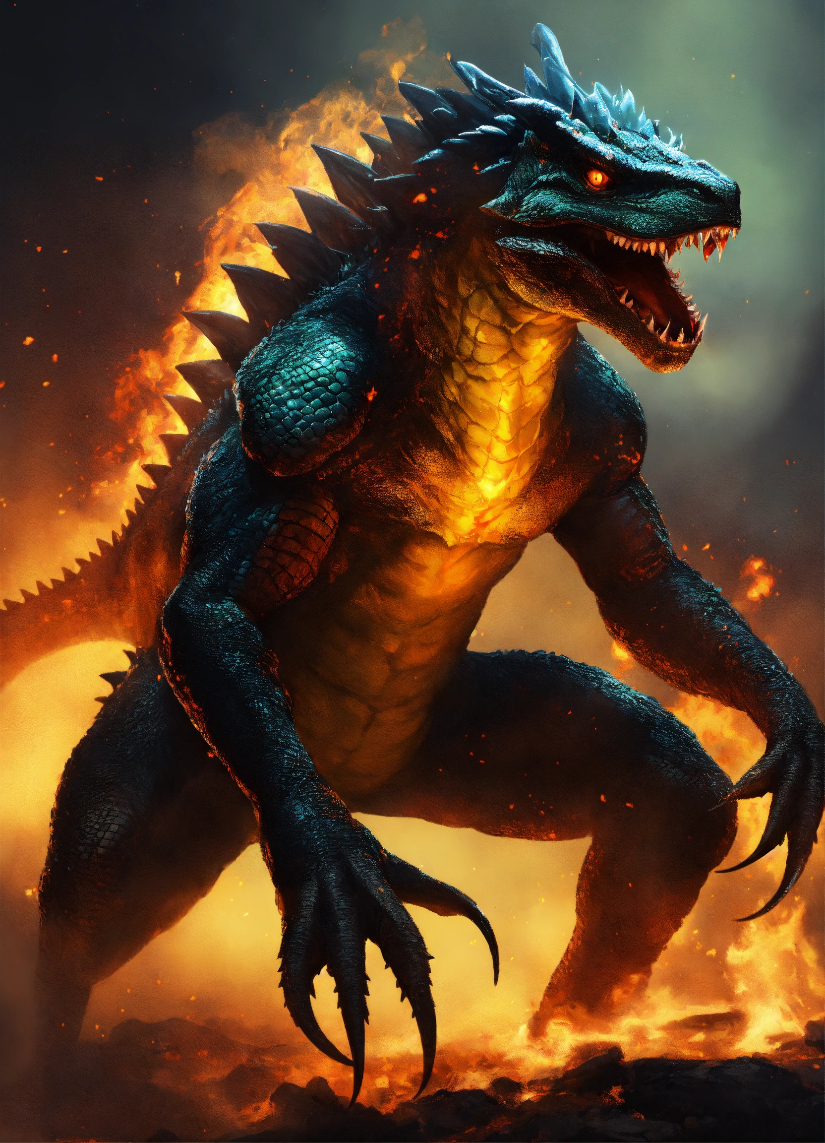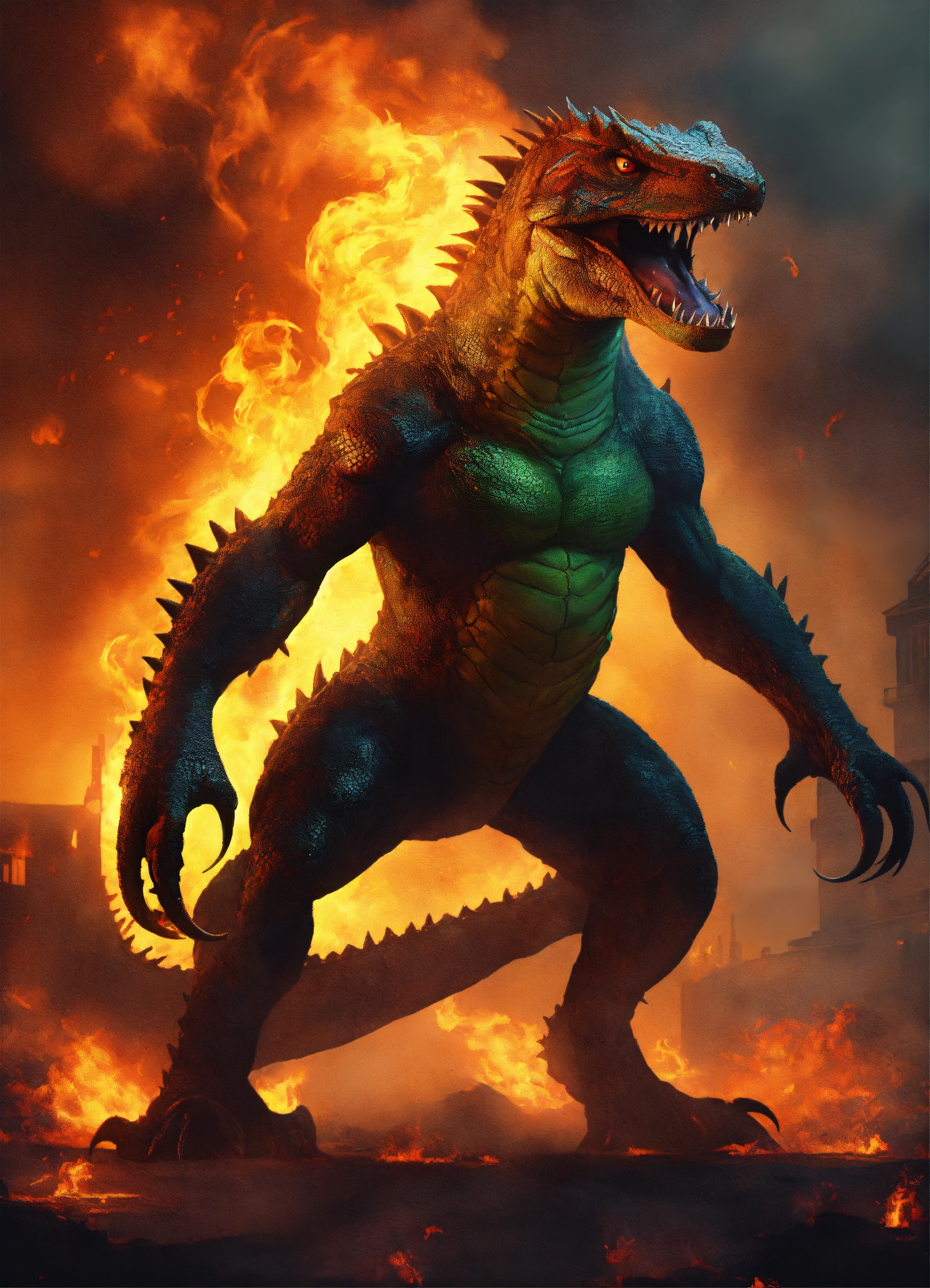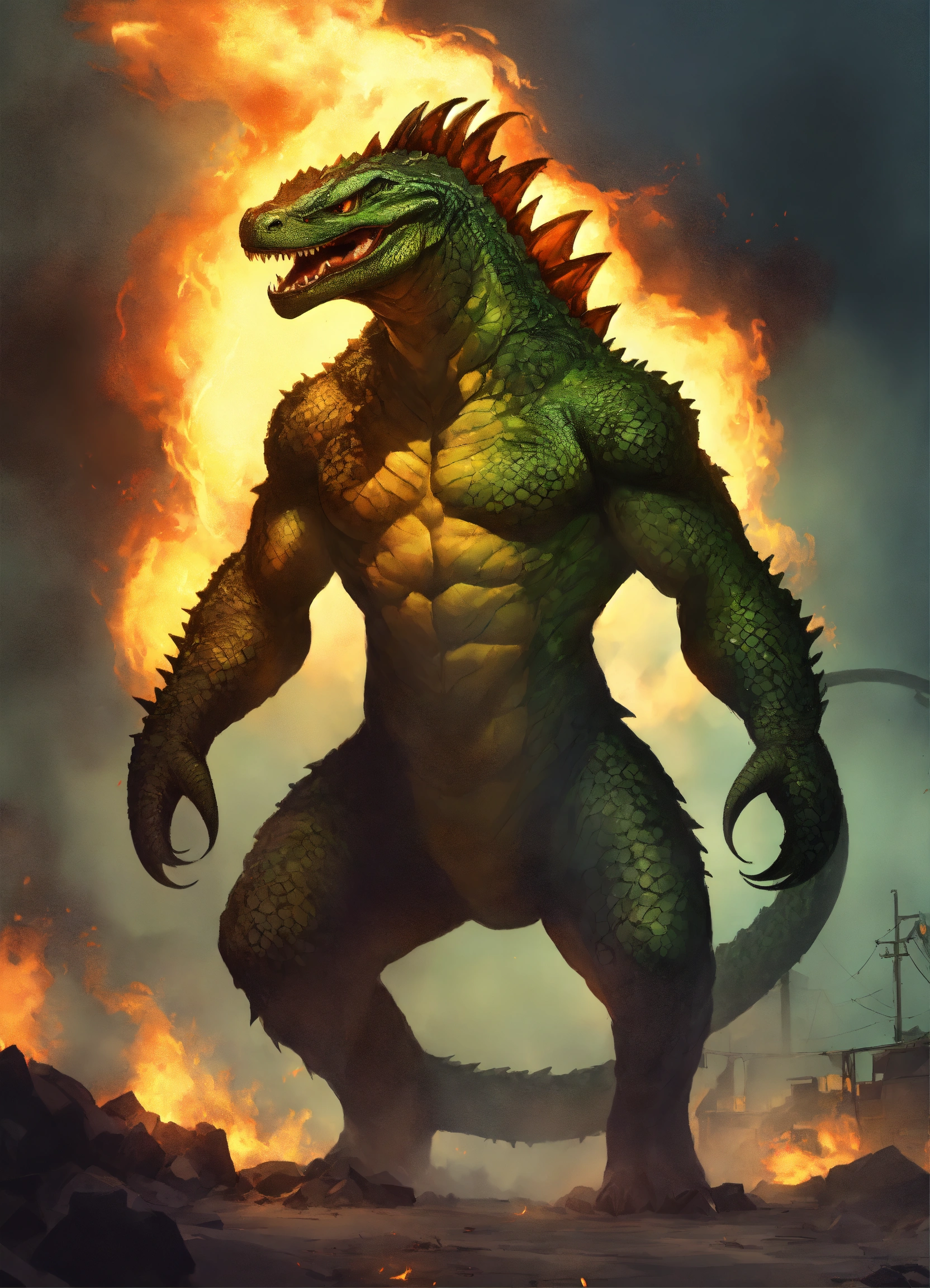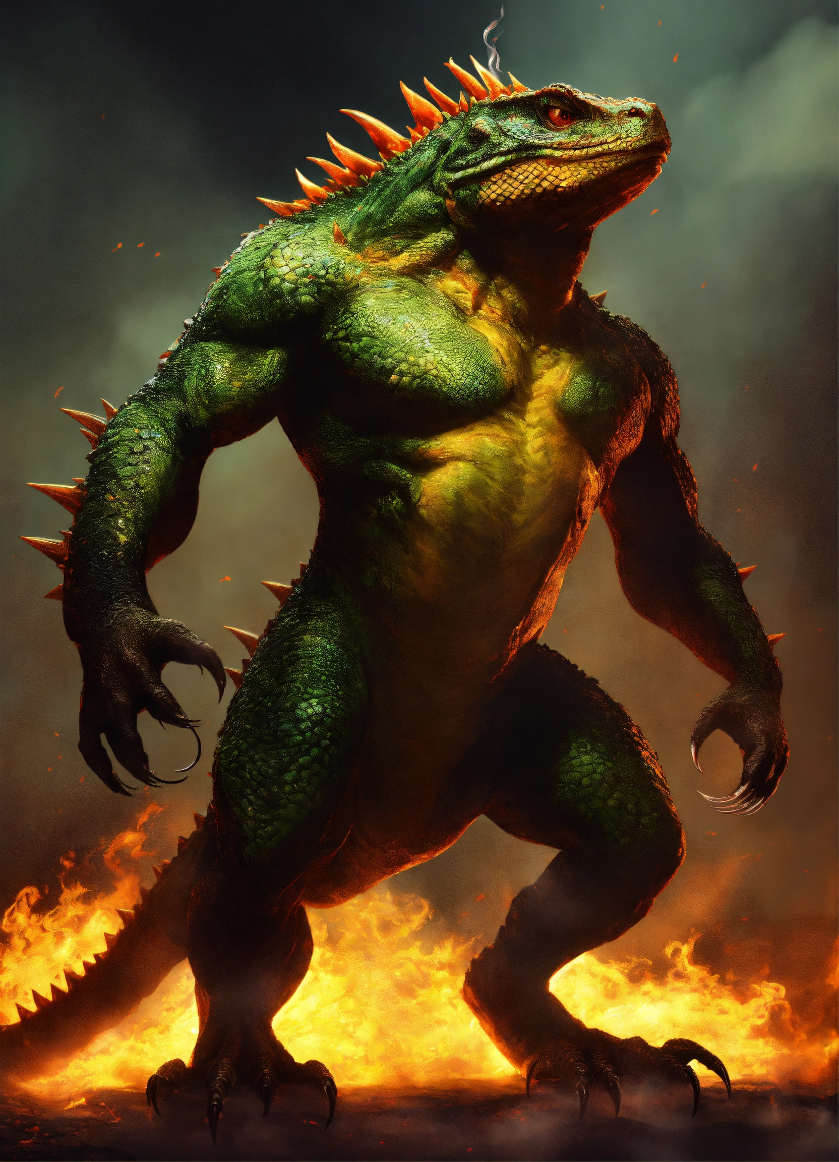 Create me a huge giant mutant lizard with claws, full body, cartoon look, smoke and fire around it, evil