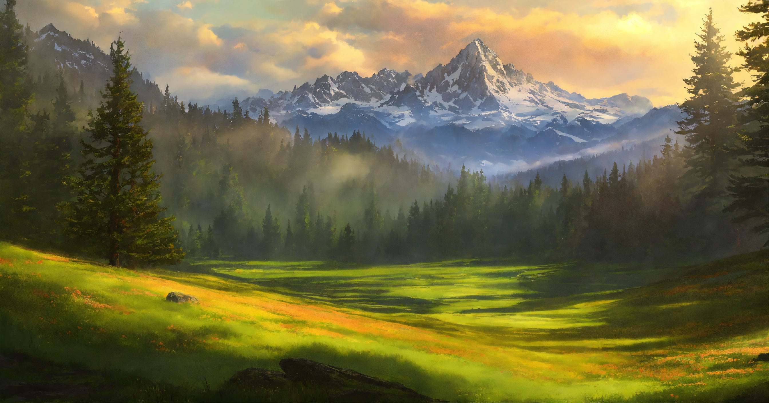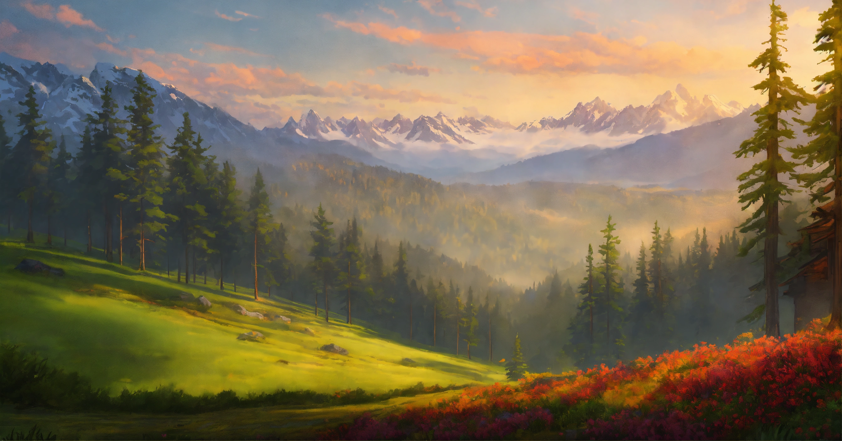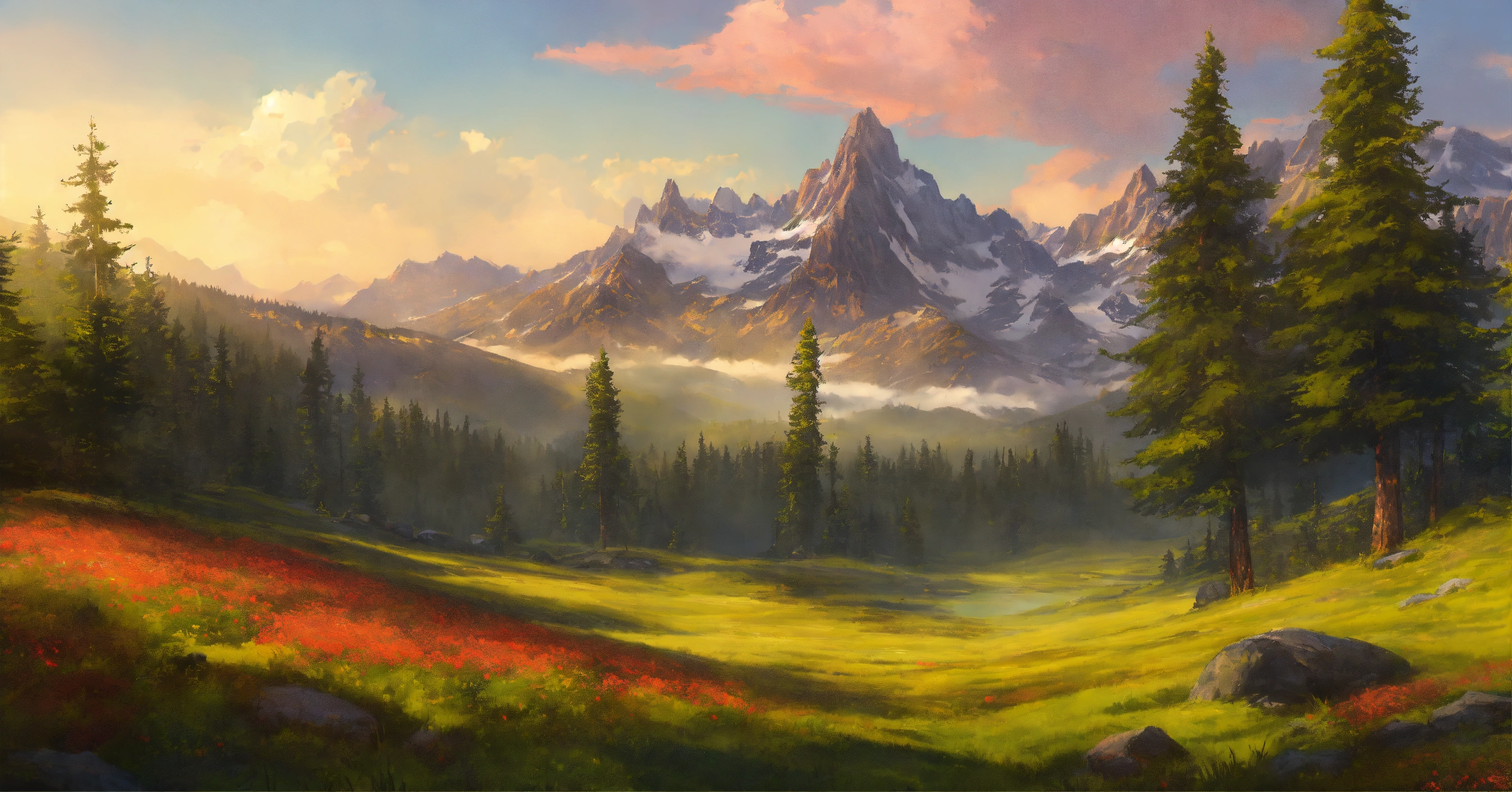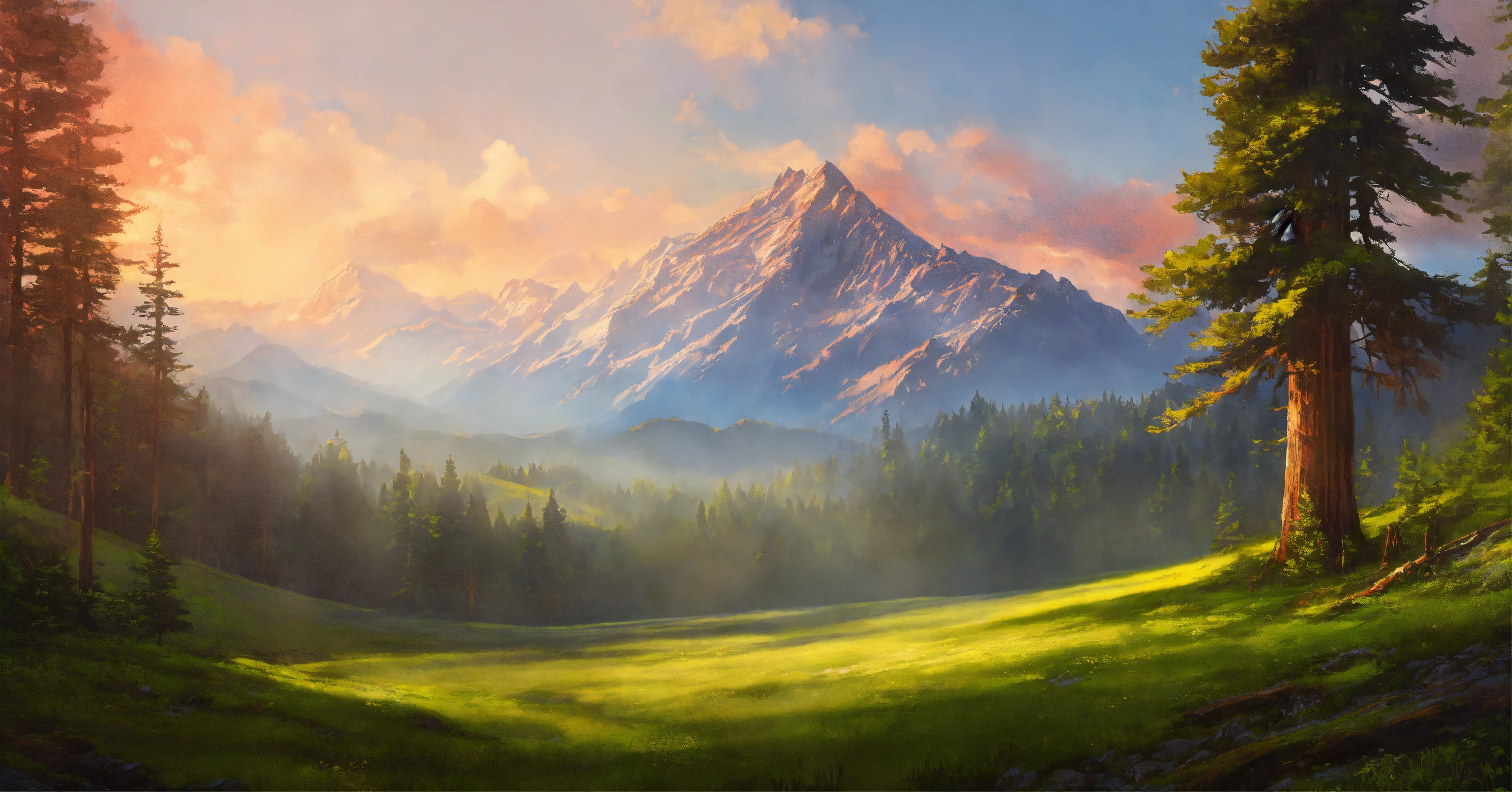 Concept art of a picturesque mountain range with evergreen redwood forests and open grassland
