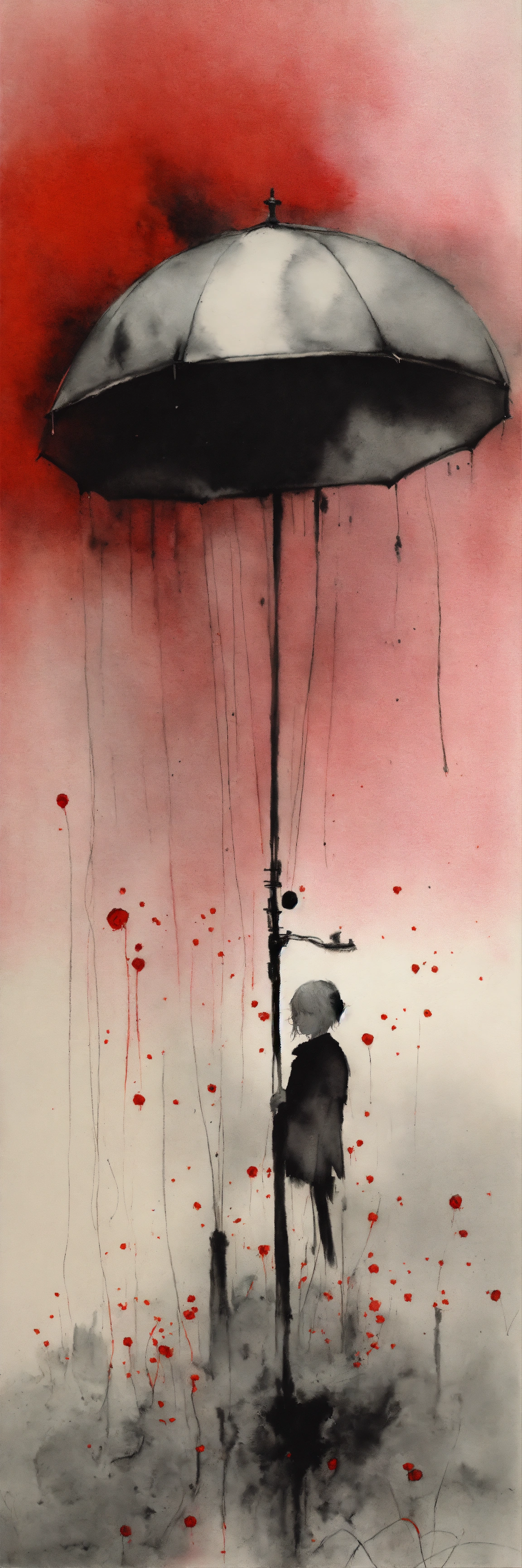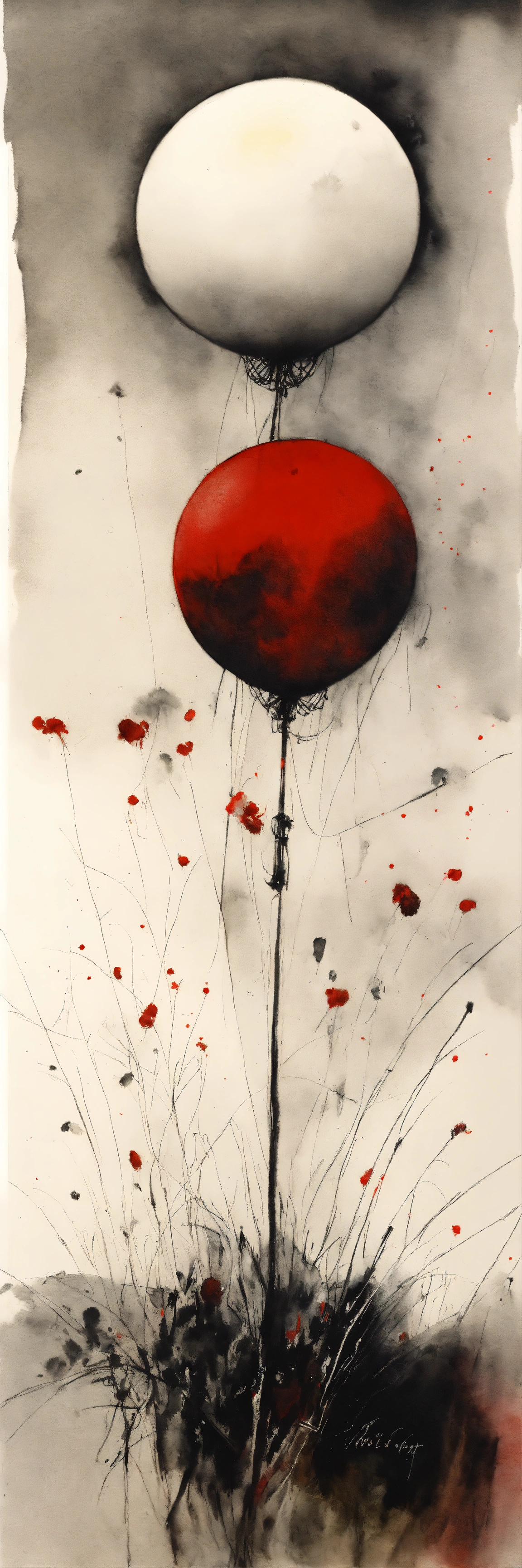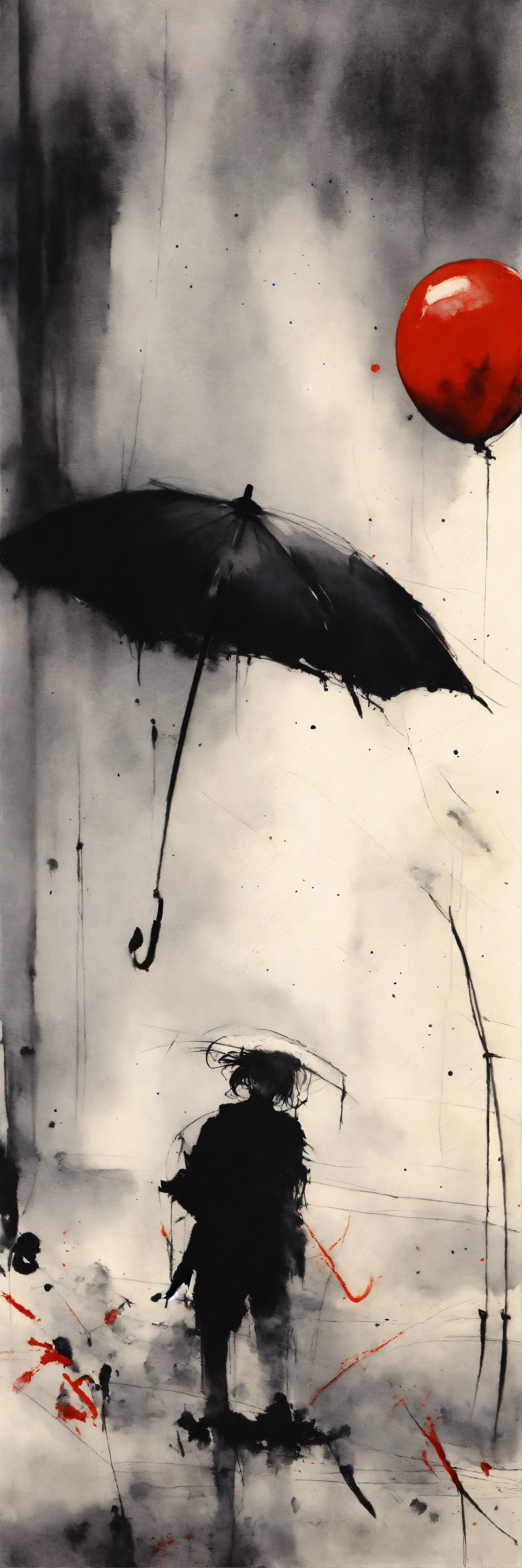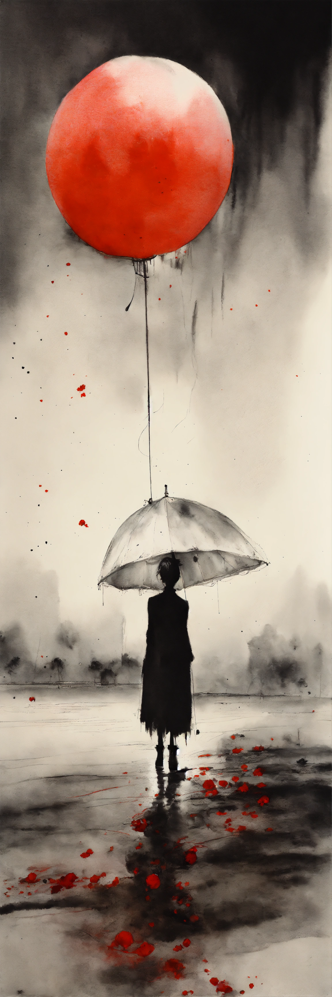Stephen gammell style, dessin, aquarelle, aquarelles, noir et blanc, de marais, de sombres créatures, dégoulinant, infecté, un parasol, un retardateur et un ballon rouge