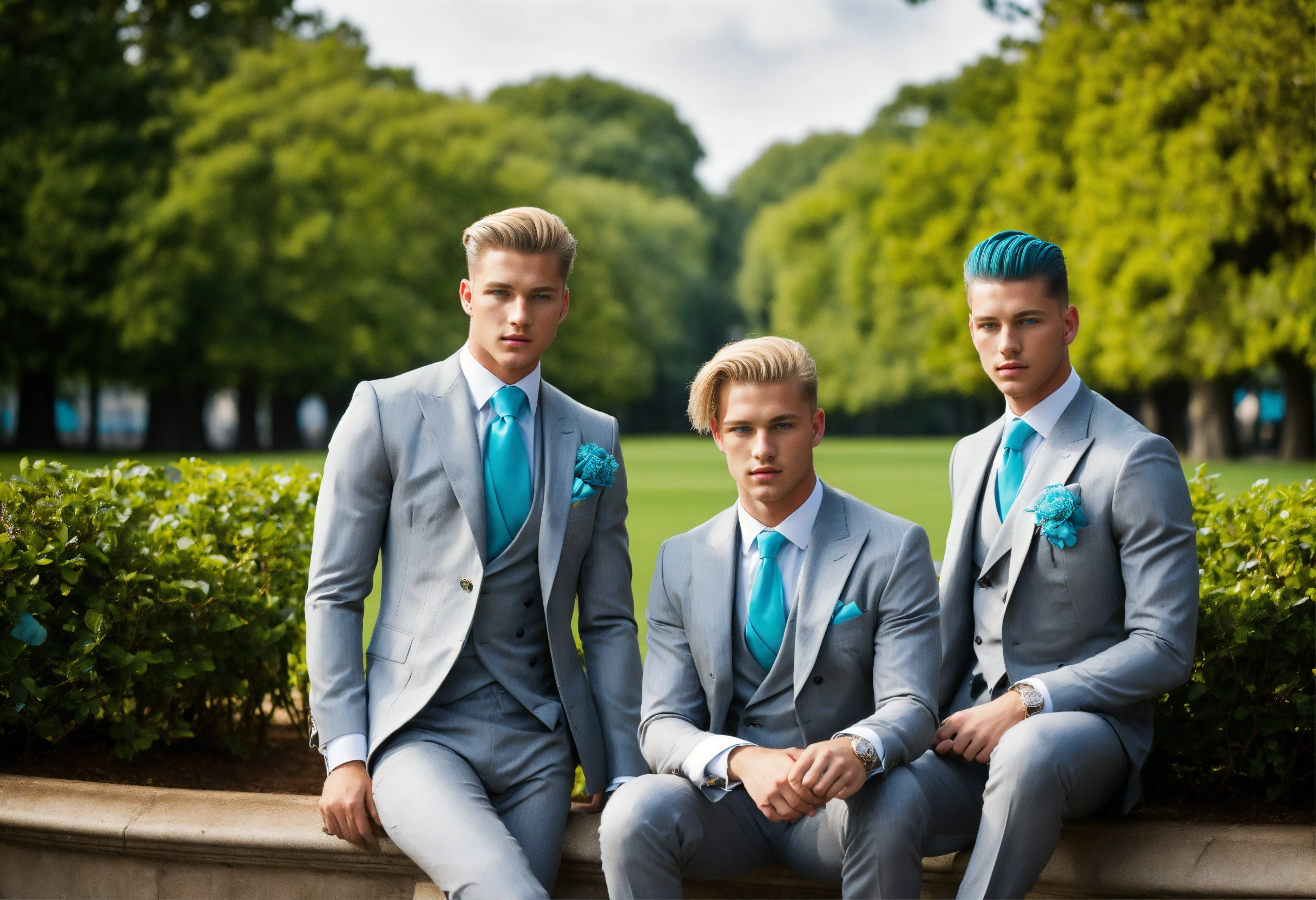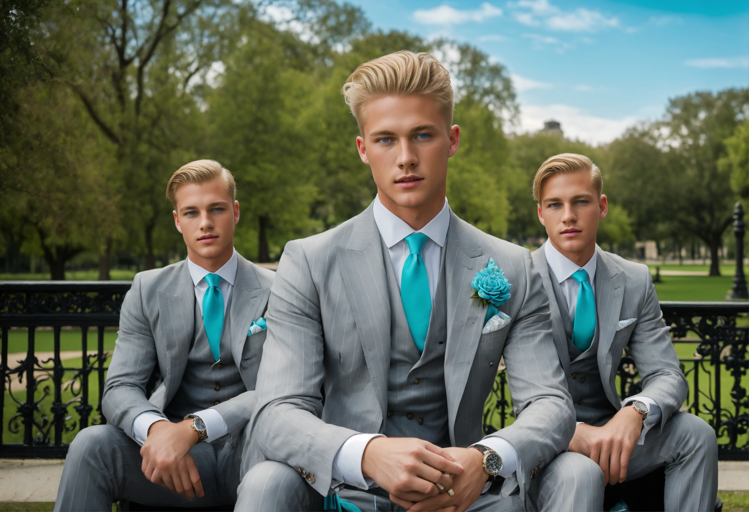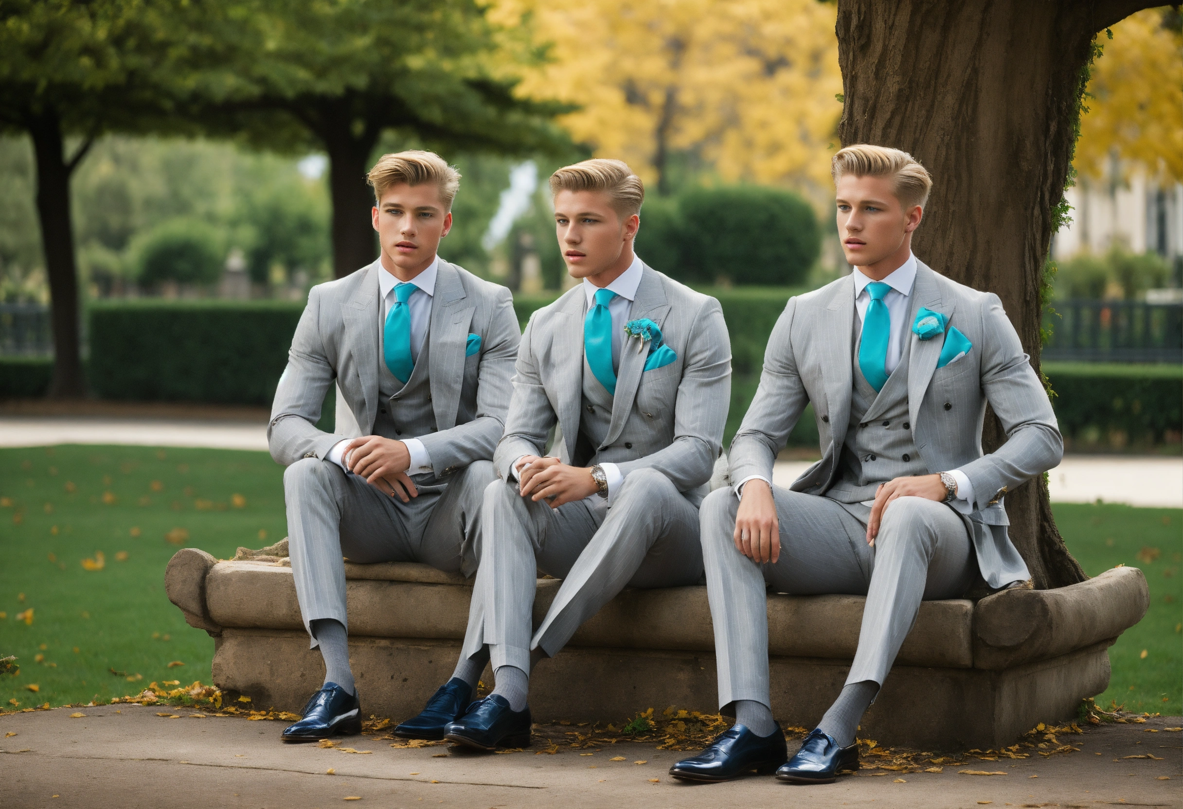 Three young blonde gentlemen in light grey pinstripe double breasted suit and turquoise tie, blue eyes and pompadour long haircut, seating in a baroque park