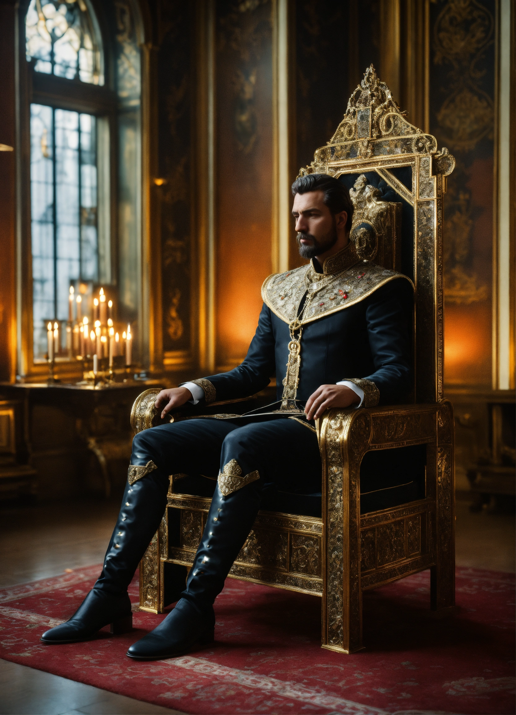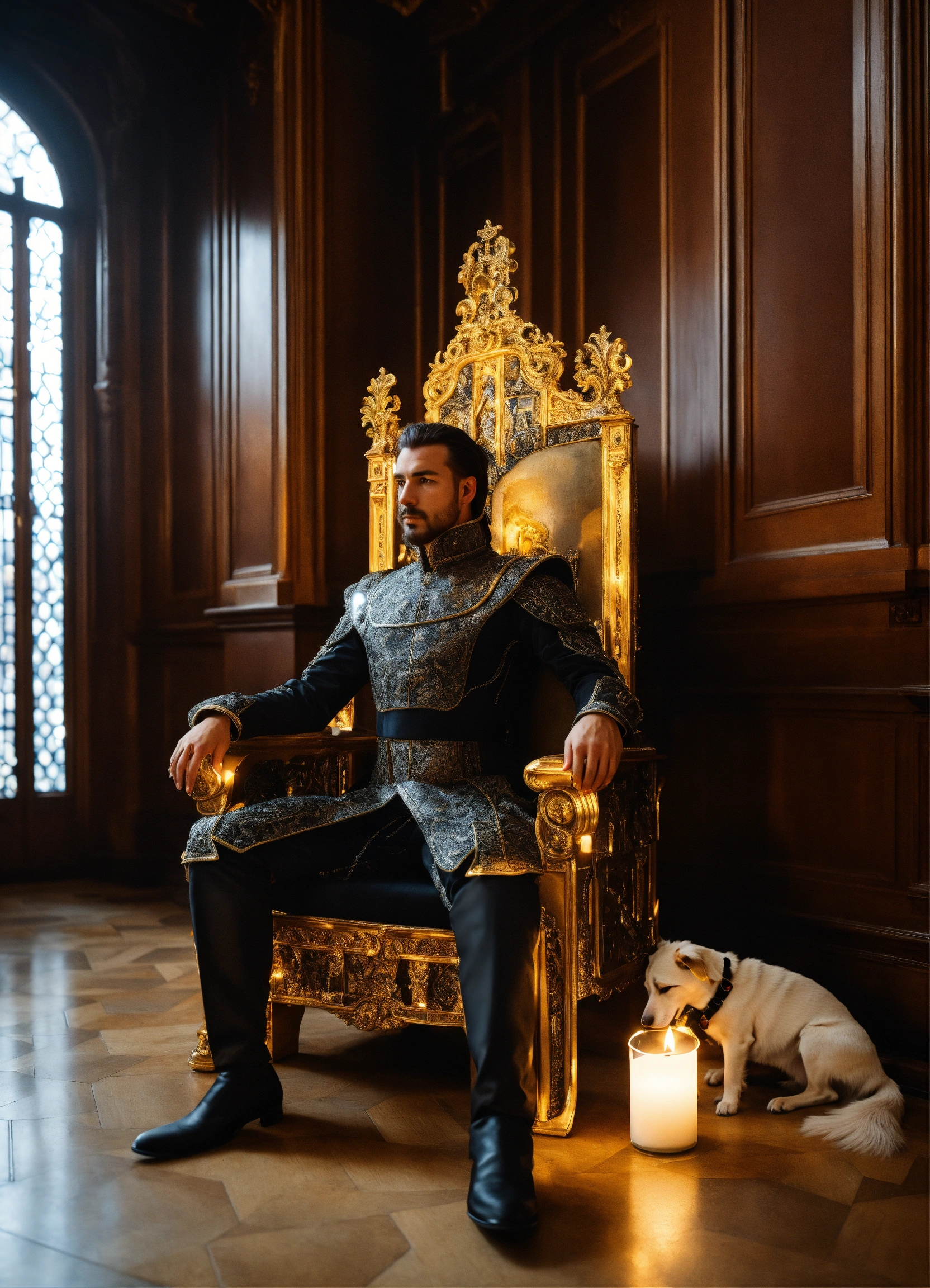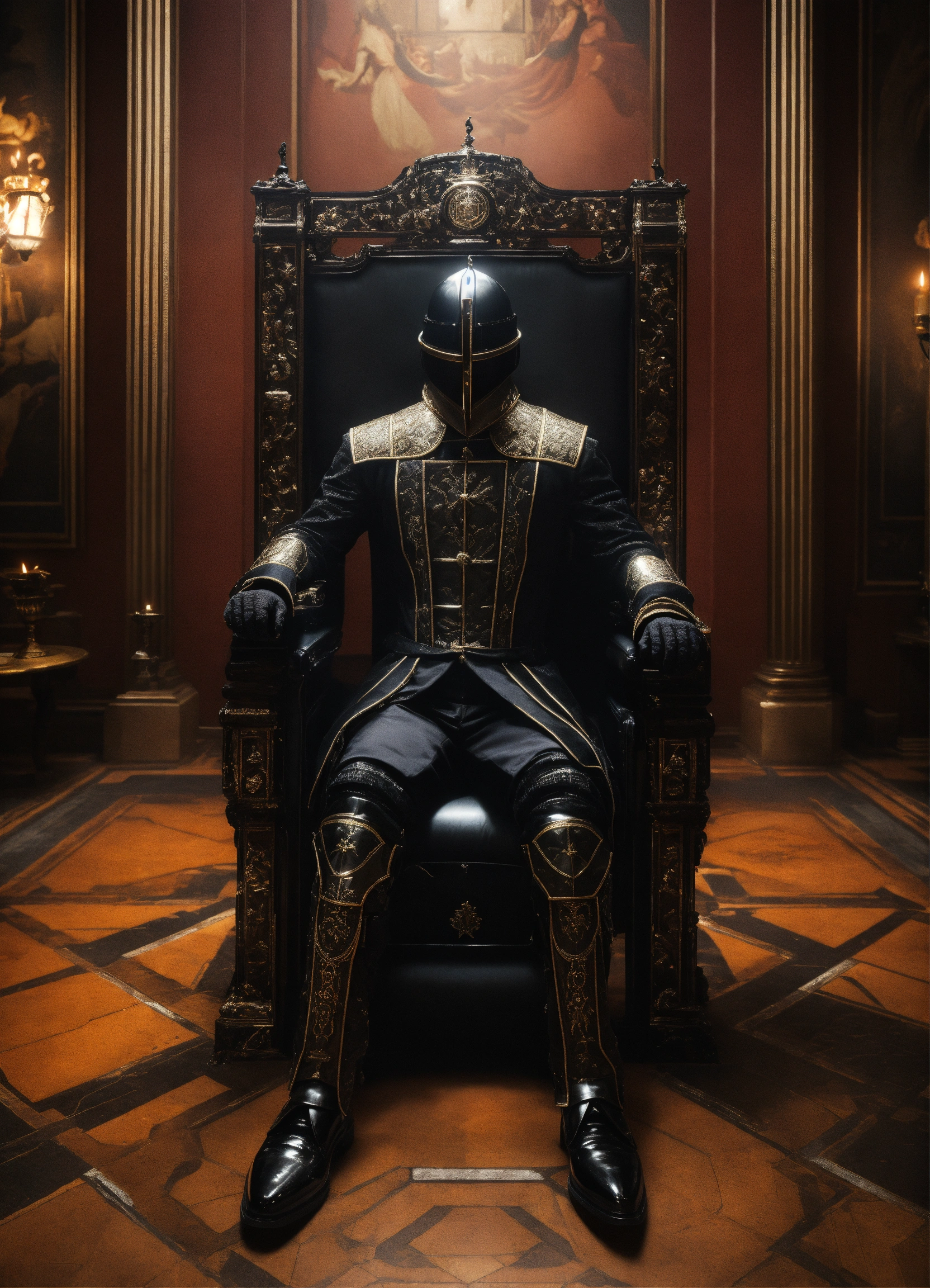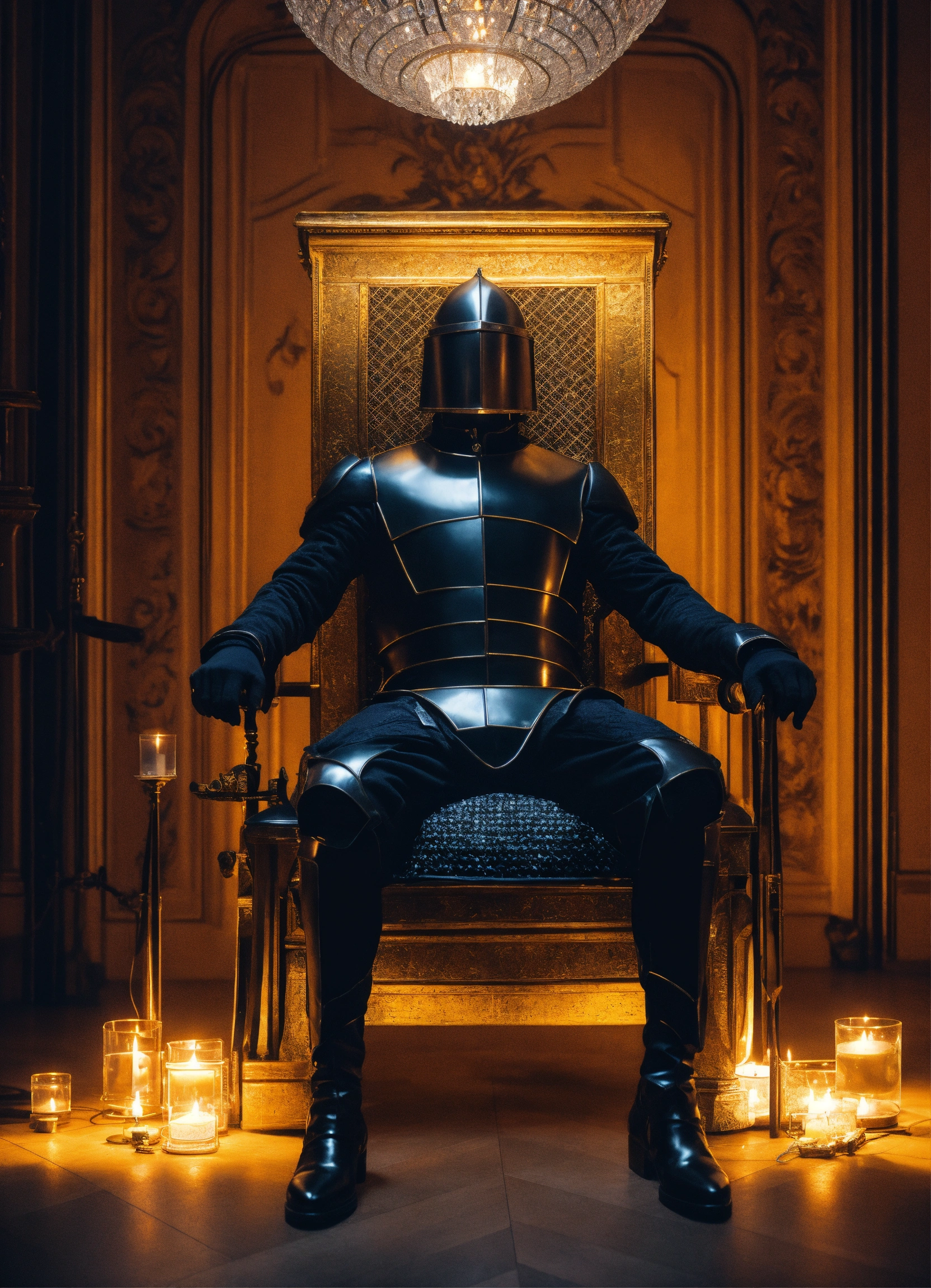 An ultrarrealistic distant photograph of a futuristic medieval king style power suit, made of black mate metal and polymer, full crystal hull, for a man, visible wires, sitting in a throne, two dogs sleeping in the floor, squared floor, imposing, modern minimalism, elegant, dystopia, mysterious, godlike, scary, in a victorian era large palace room whit candle lights, 8k
