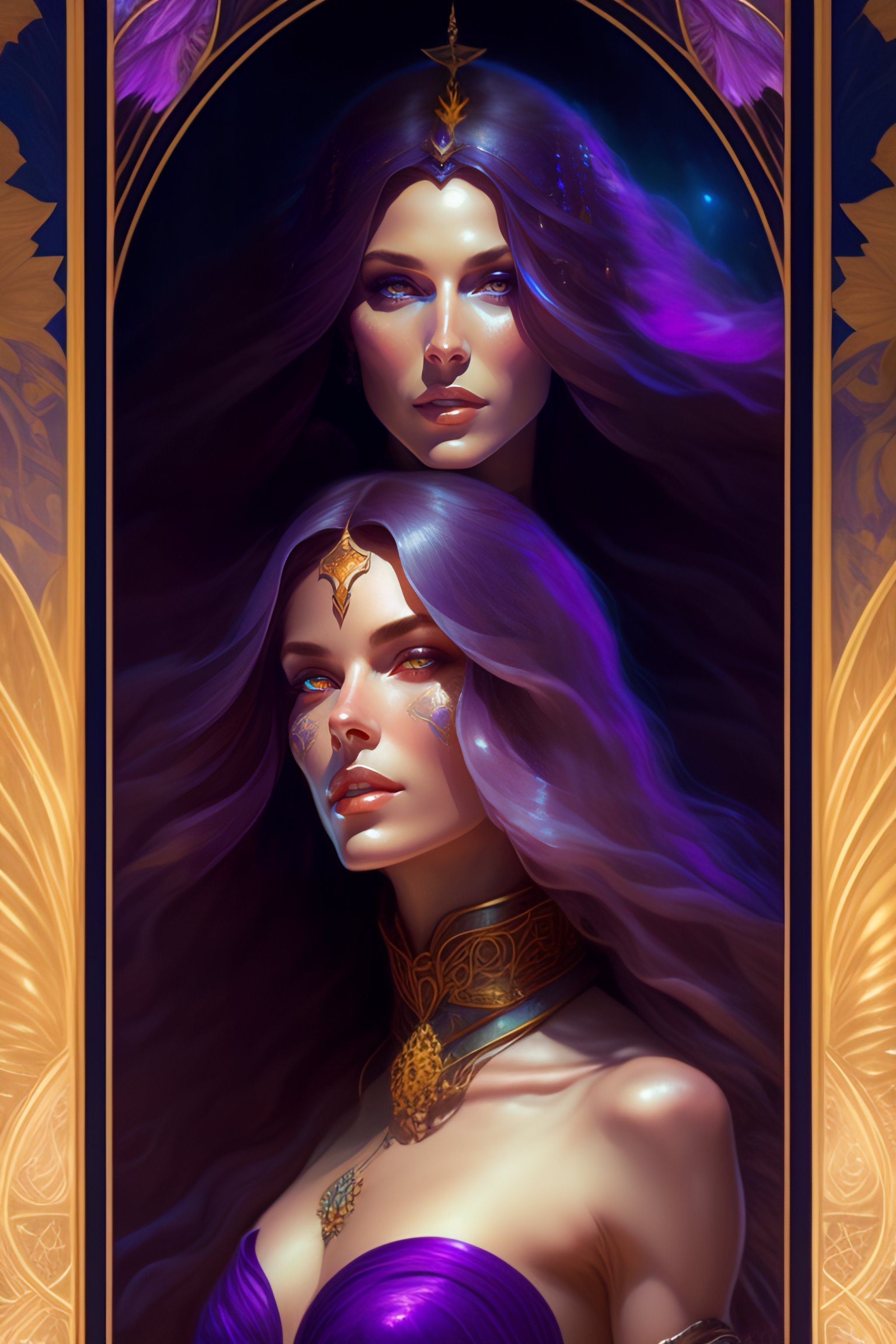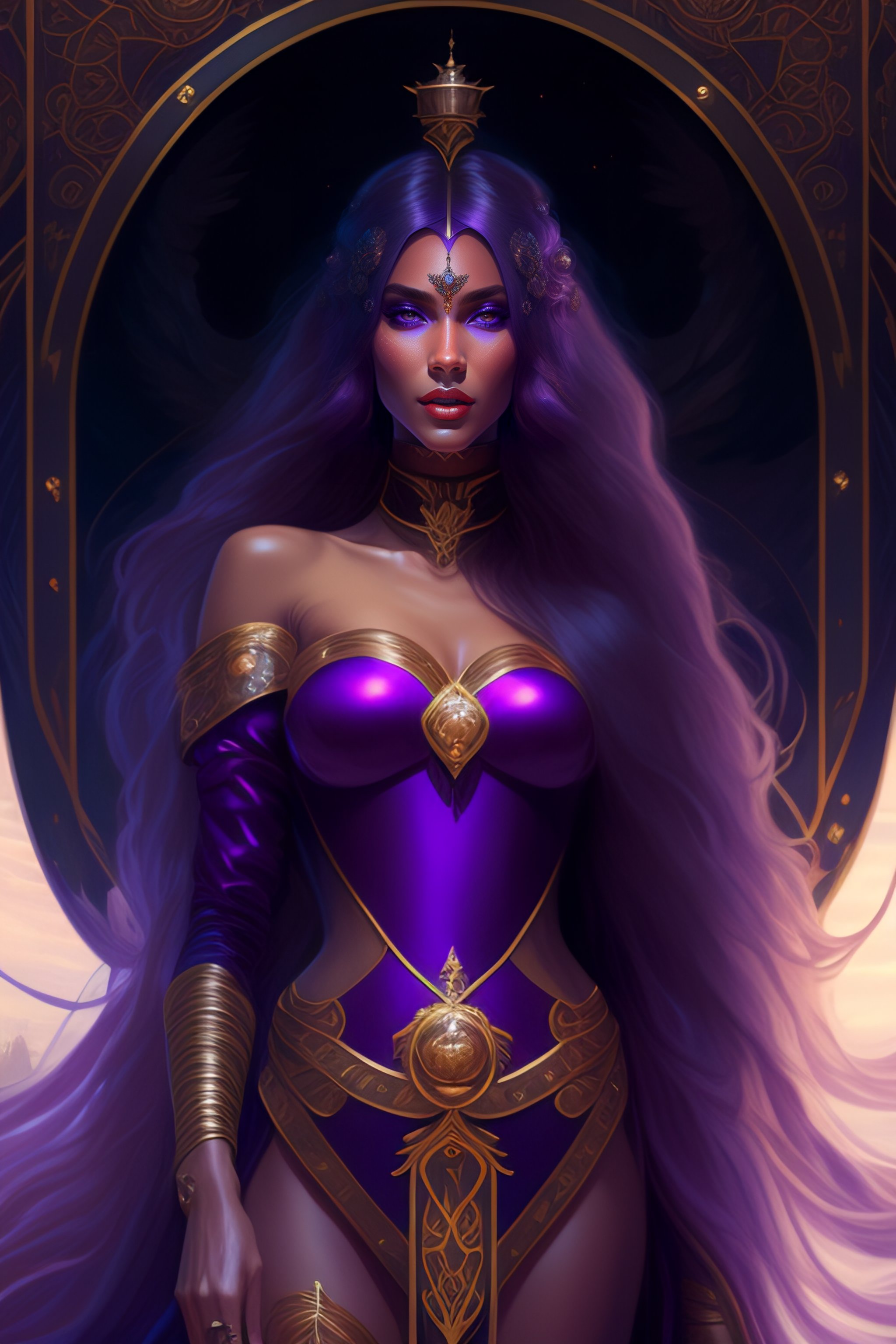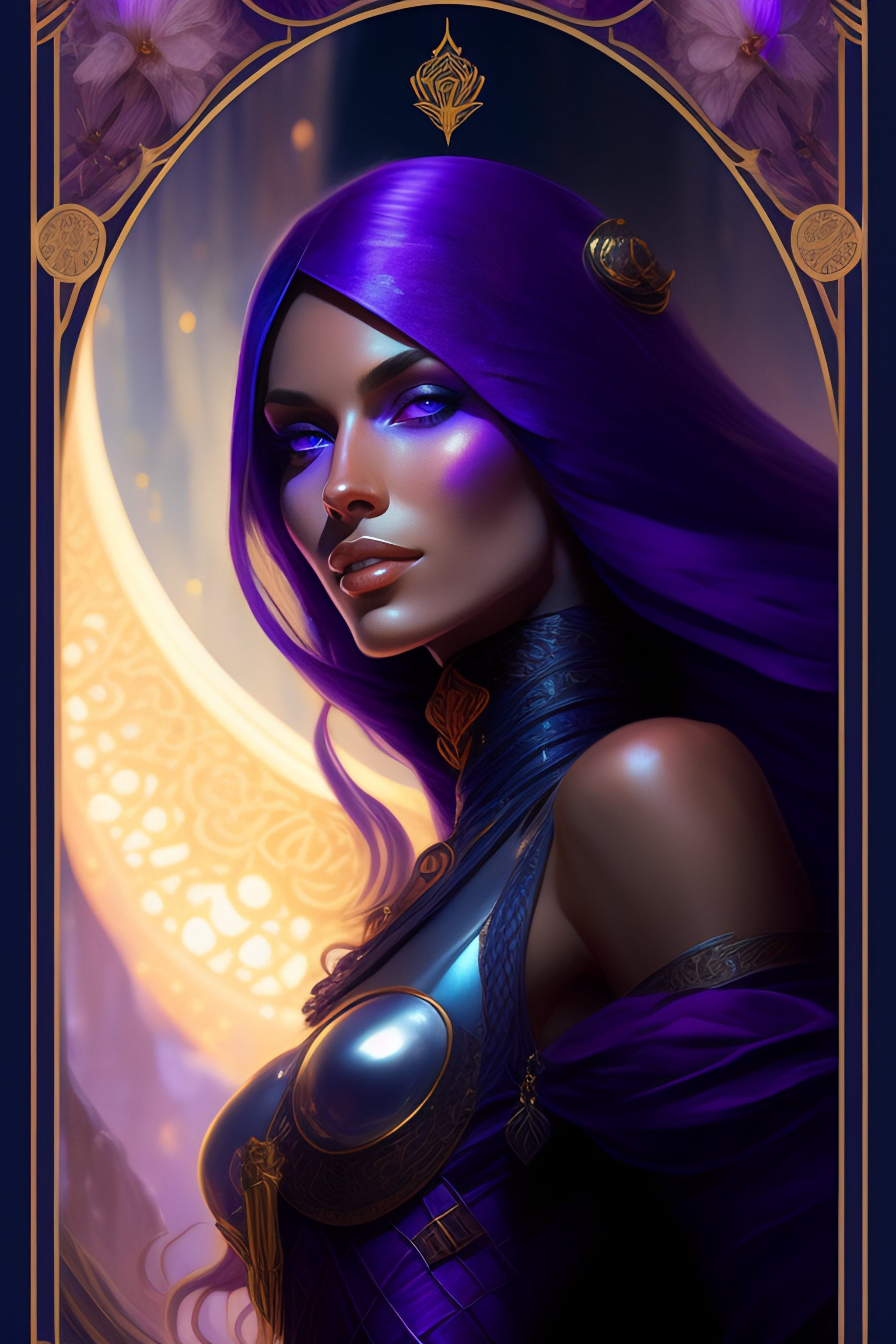 An extremely detailed tarot card of an unbelievably warm mysteriously smiling evil tall alien witch with long chestnut hair and purple eyes, shinny deep blue high heels only, artstation, detailed, realistic, by alphonse mucha and greg rutkowski on the nd beach