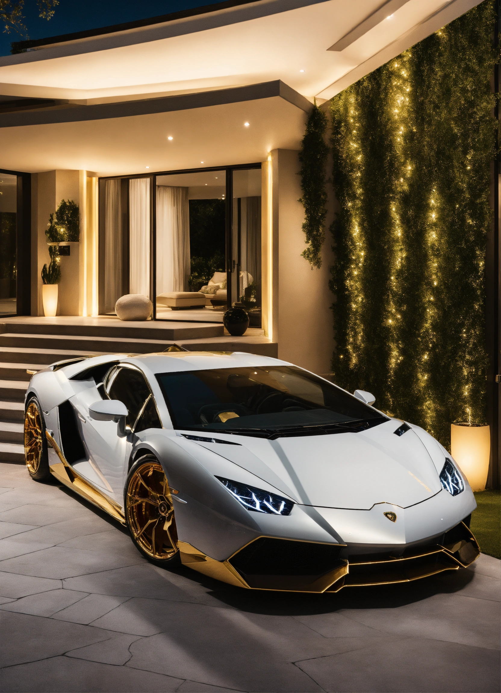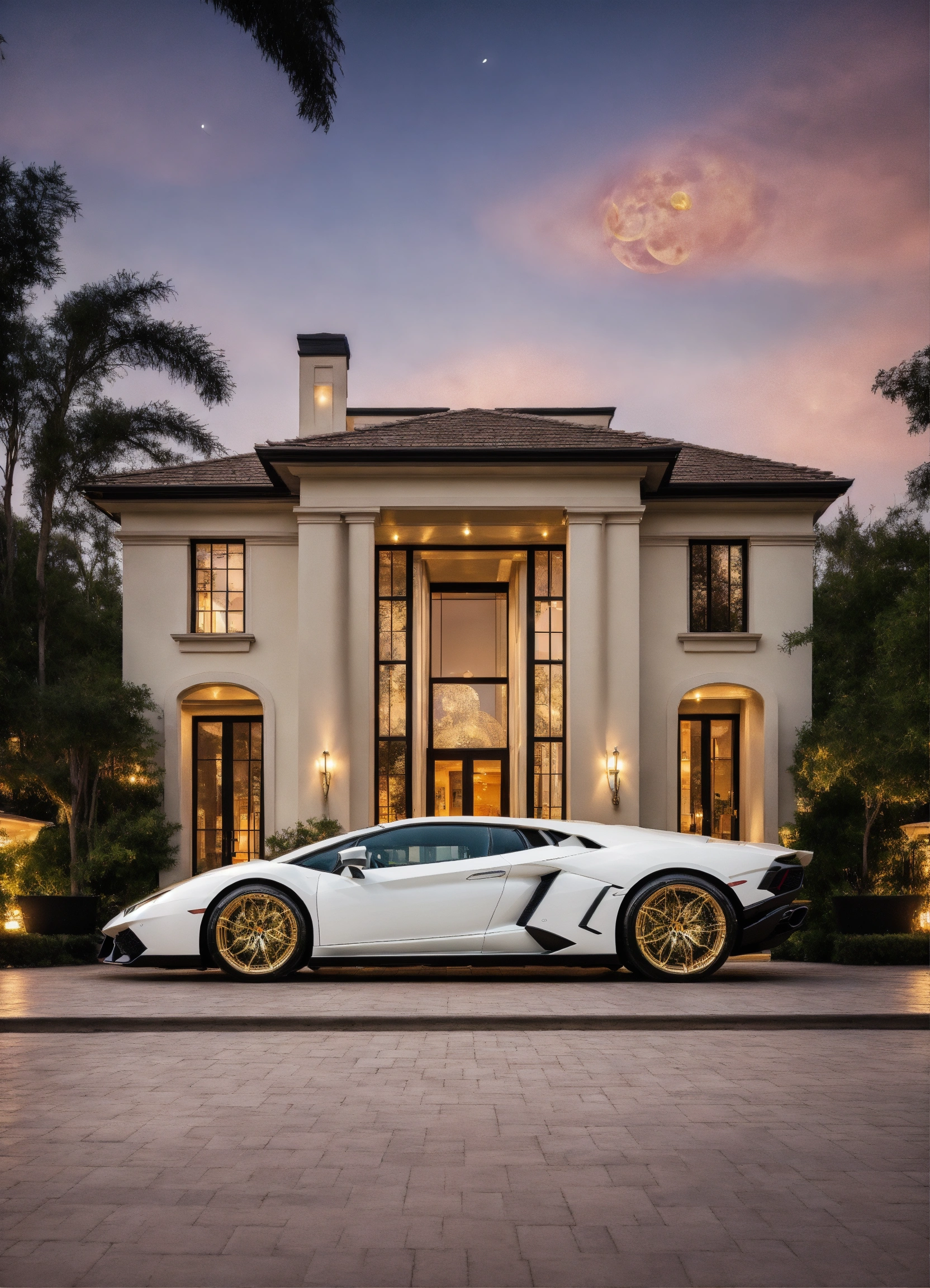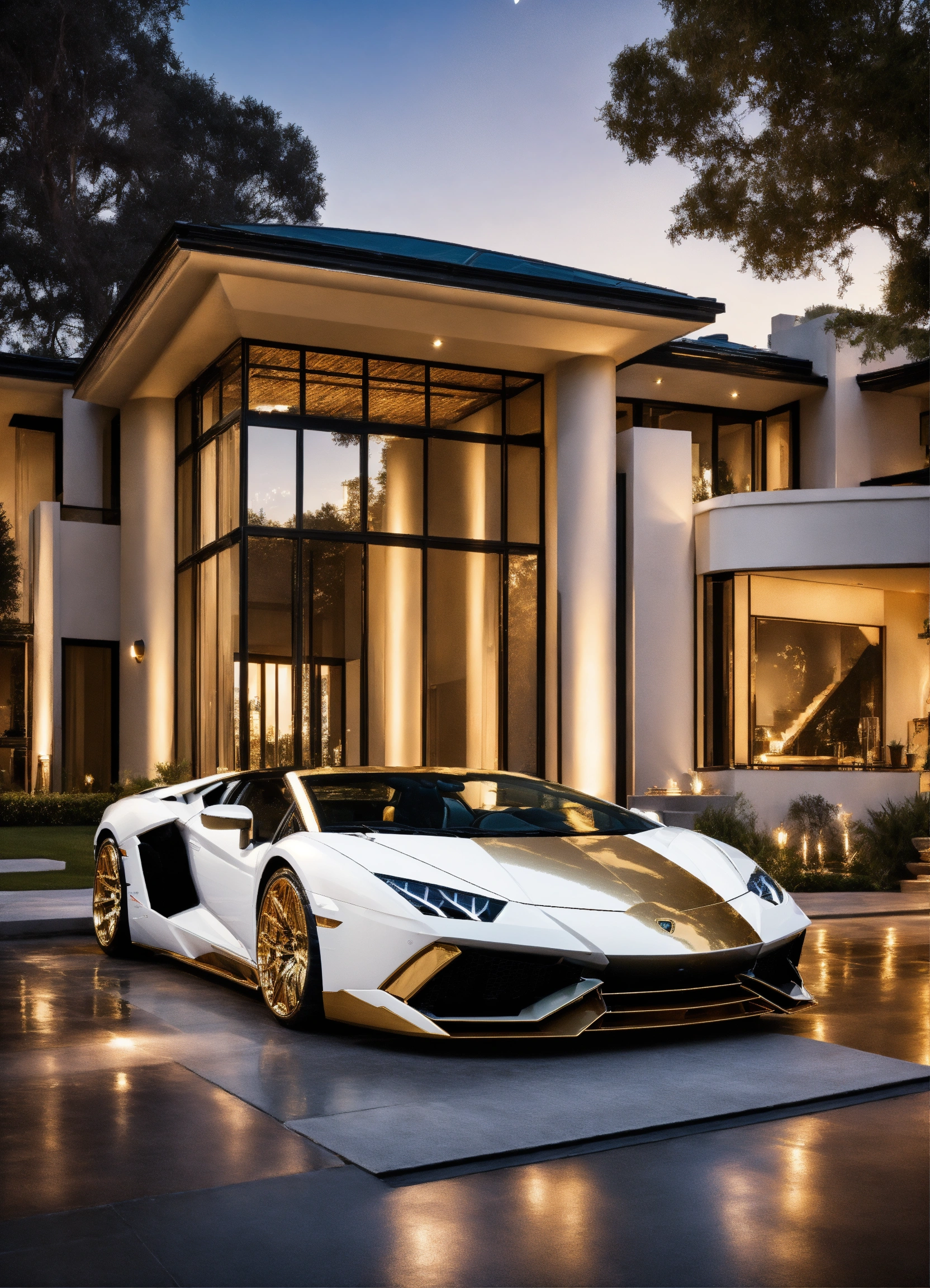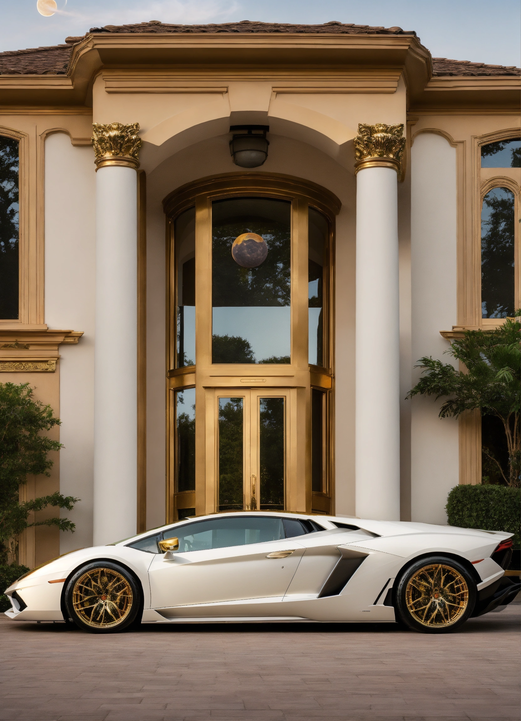 Gorgeous contemporary mansion with, golden moon, background 2019 lamborghini hurricane pearl white with gold trim