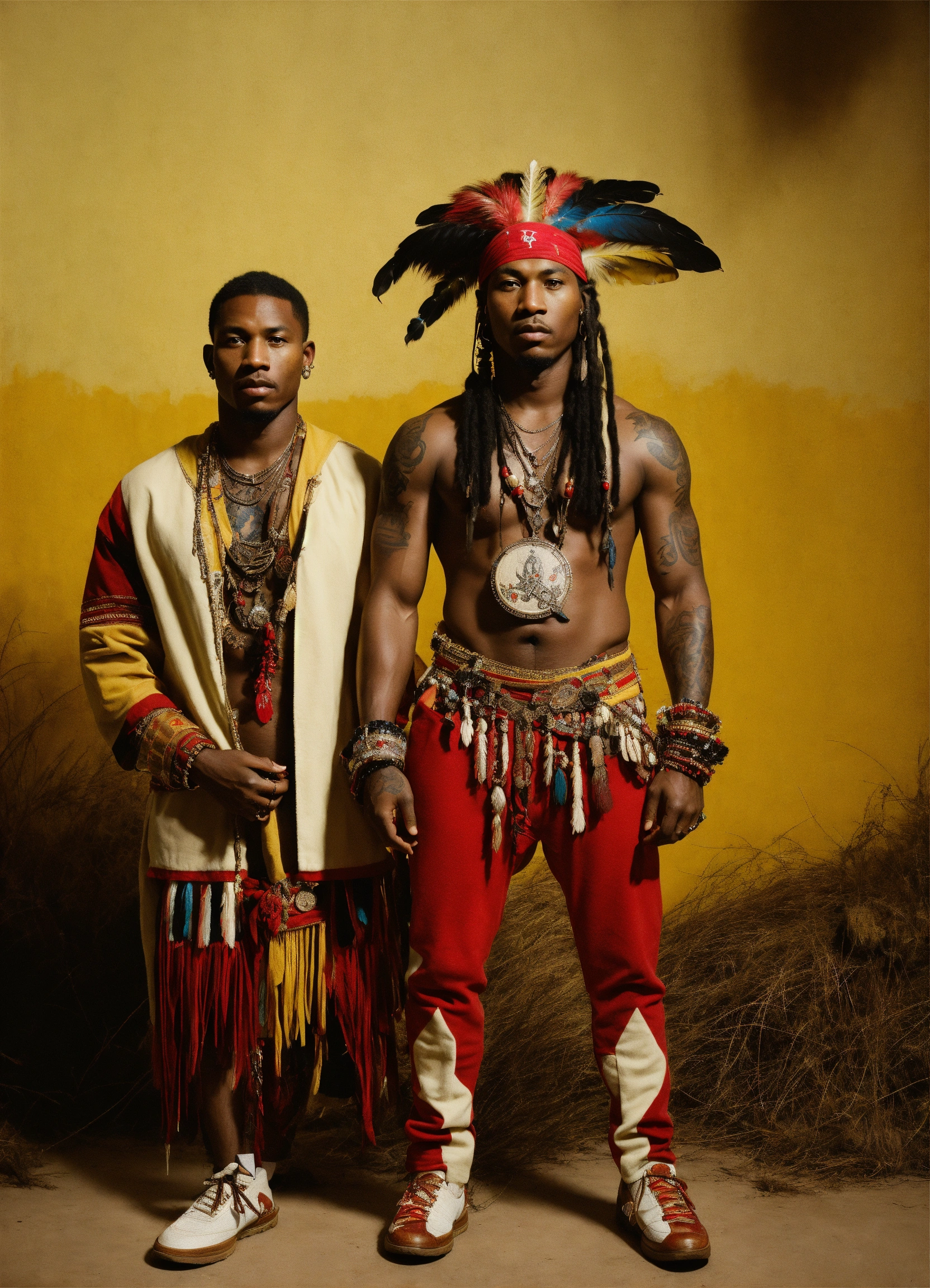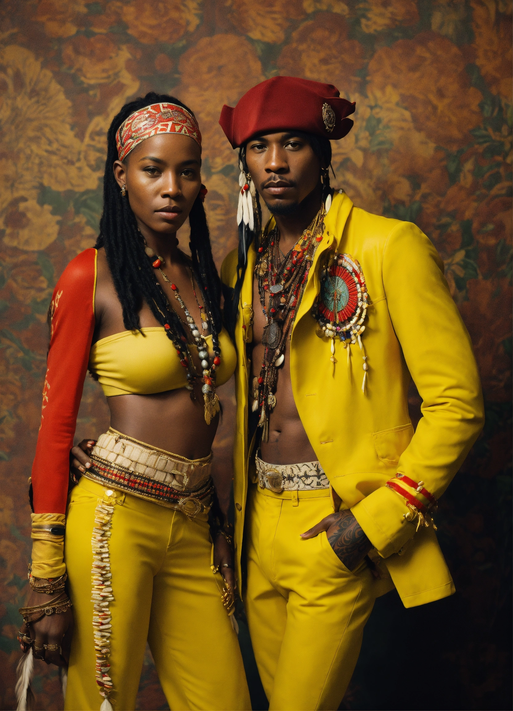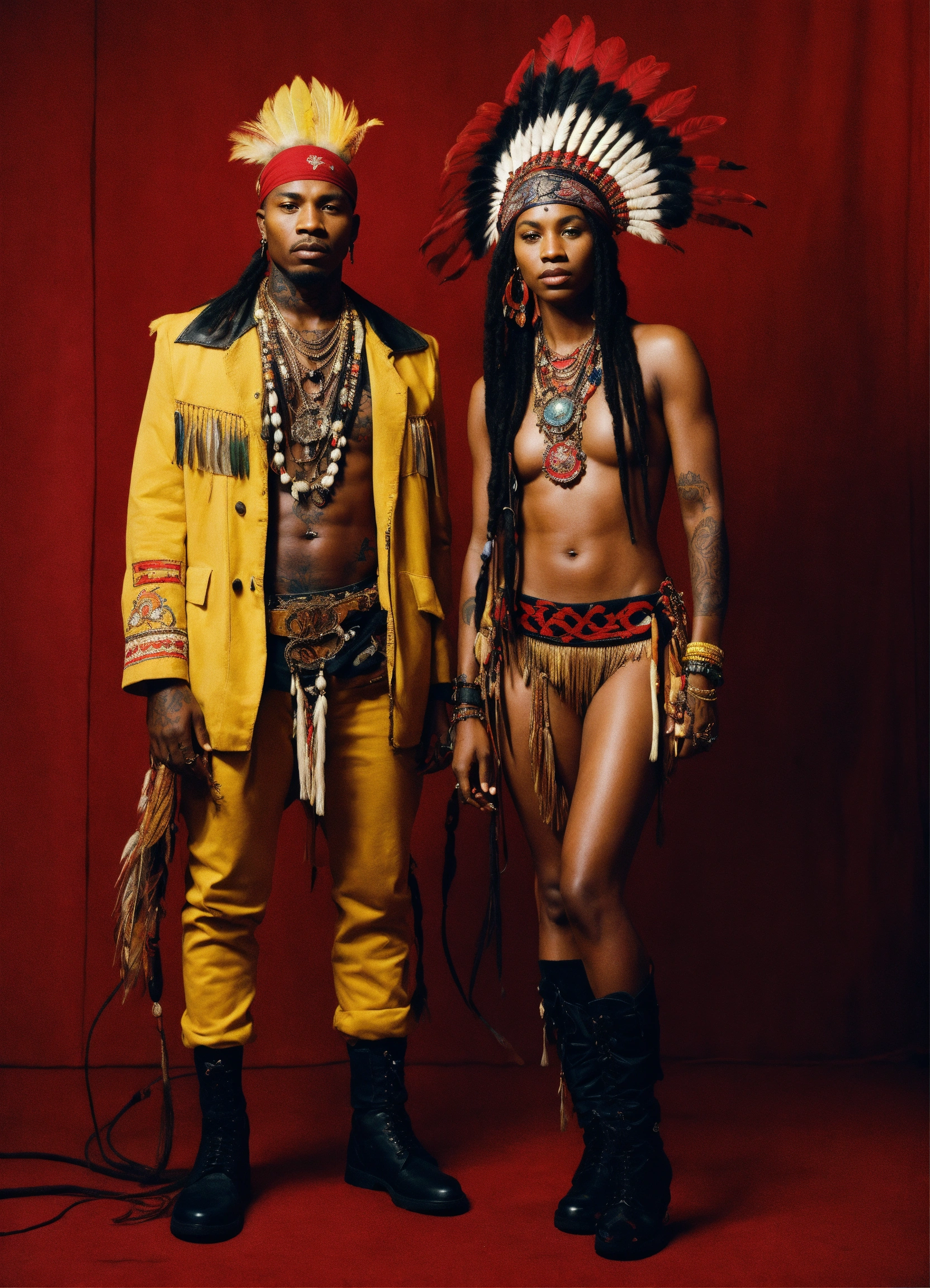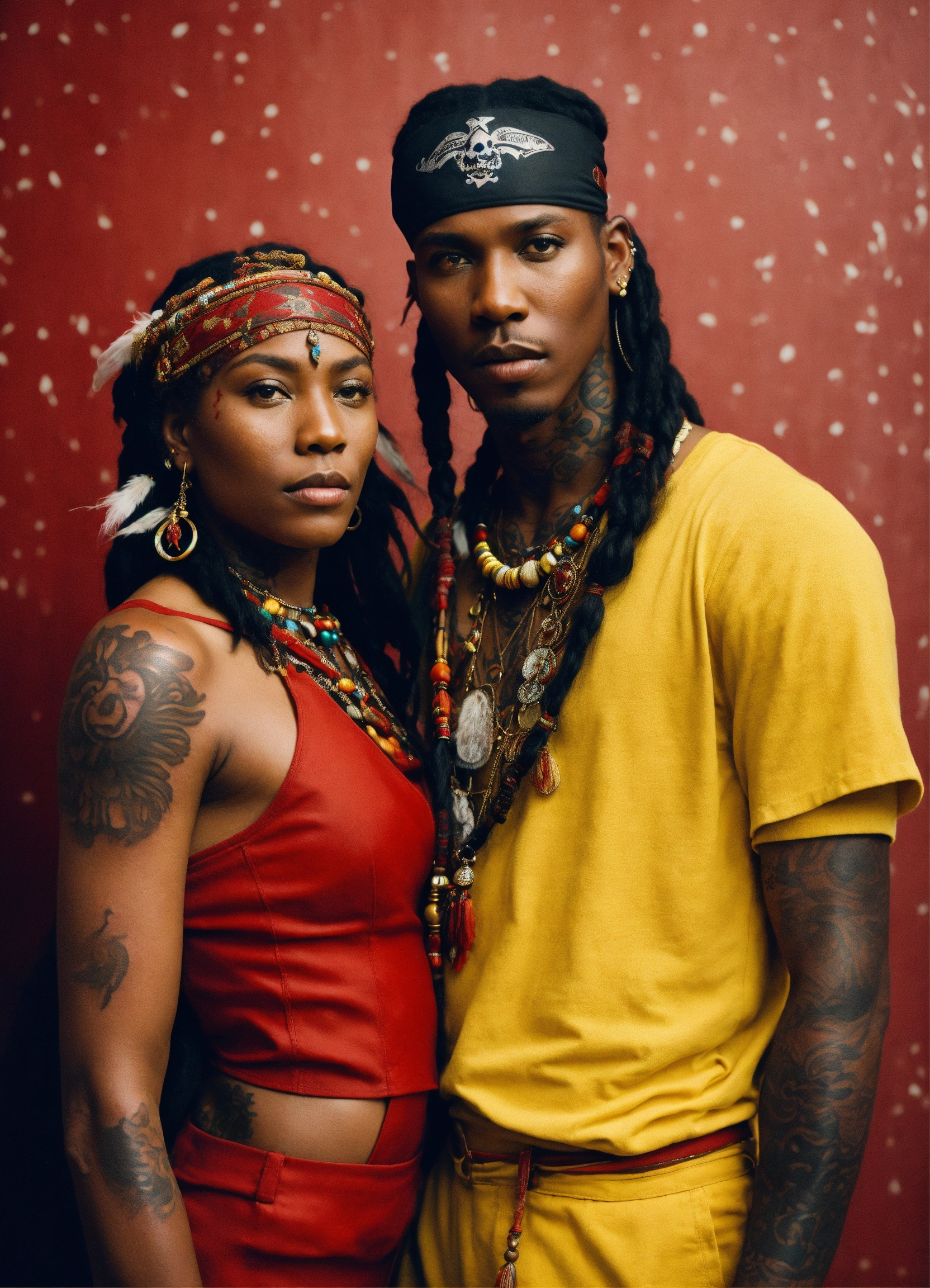 African american couple posing, in the style of bertil nilsson, idealized native americans, mark seliger, light yellow and red, piratepunk, adonna khare, tattoo by die antwoord