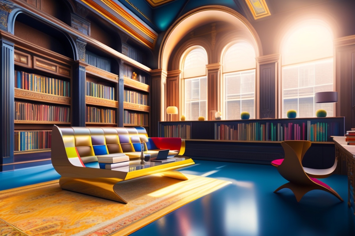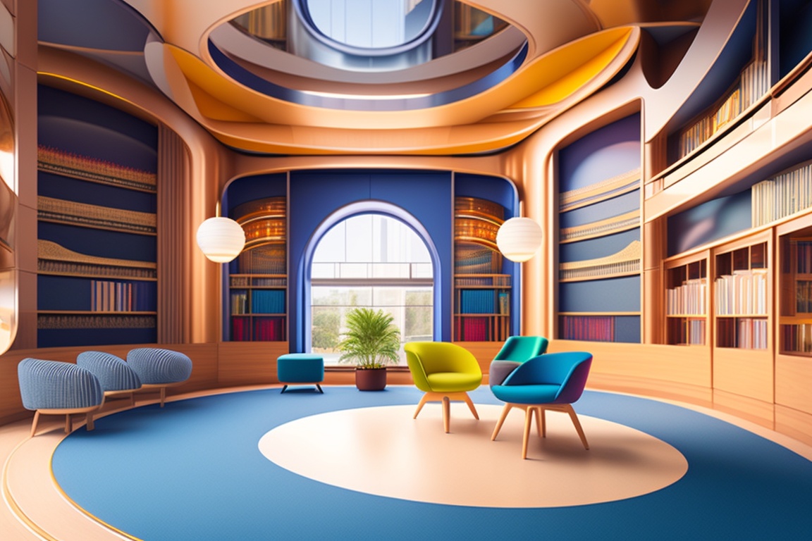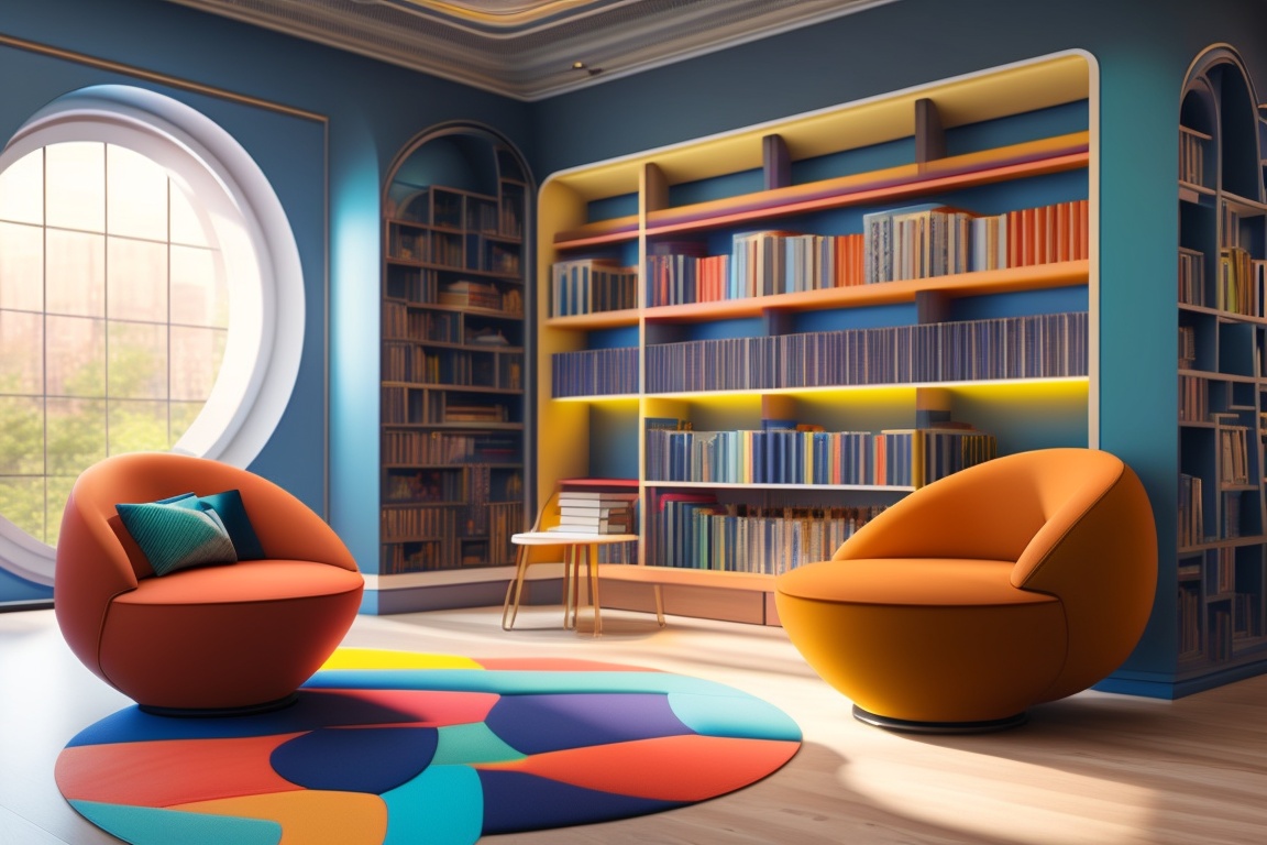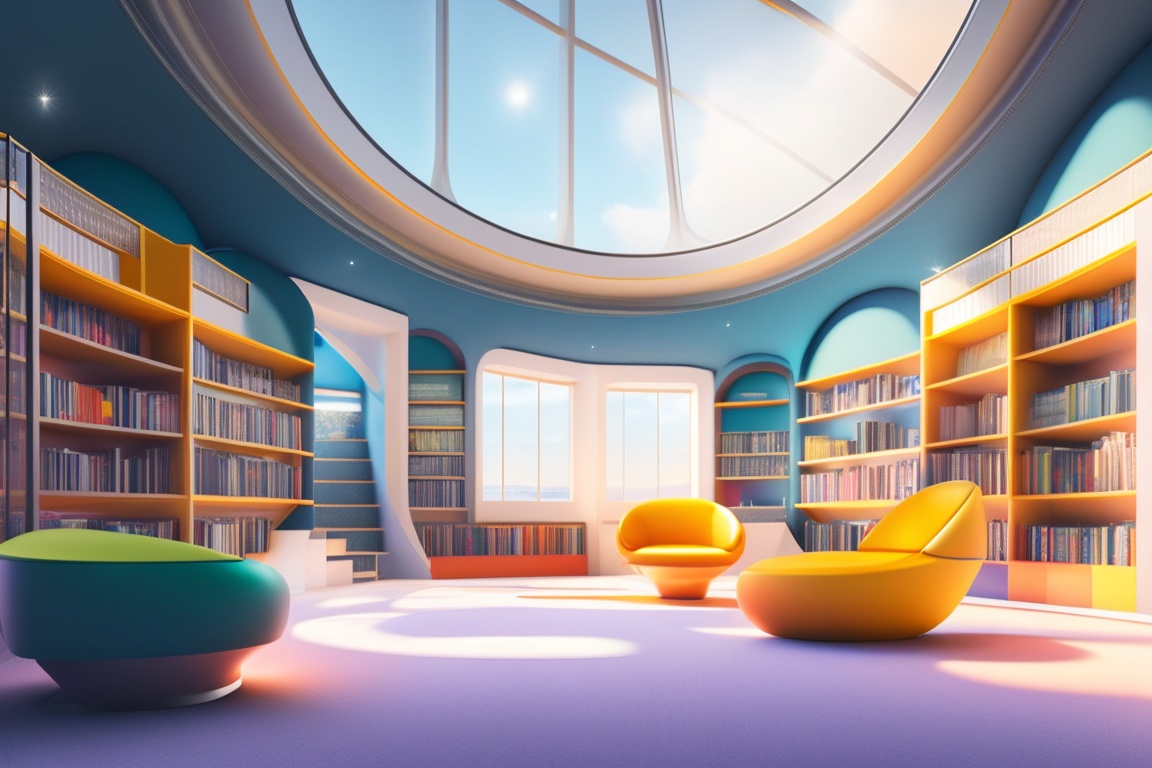 Interior of an over engineered luxury vast kids library, airy complex architecture, two prominent chairs, prominent bookshelf, sun rays, 8k, hyper details, rich colors, photograph, chaotic design, surrealist. glowy and full of day light, lit and bright.