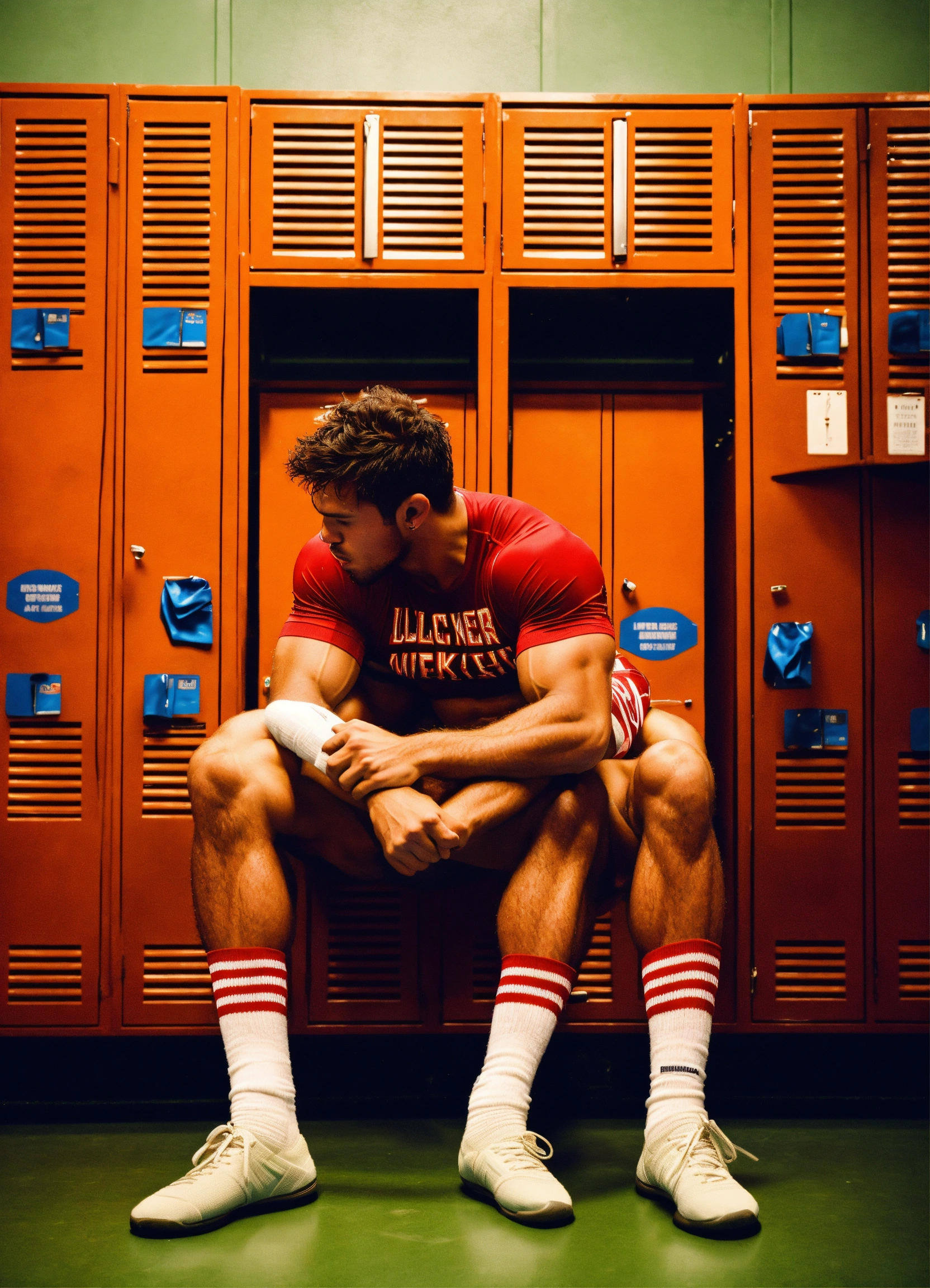 Group of skinny handsome boxer wrestlers young cuddling guys tanned hairy sweaty sporty hunks studs in sporty sock and in a locker room lockers with big bulges