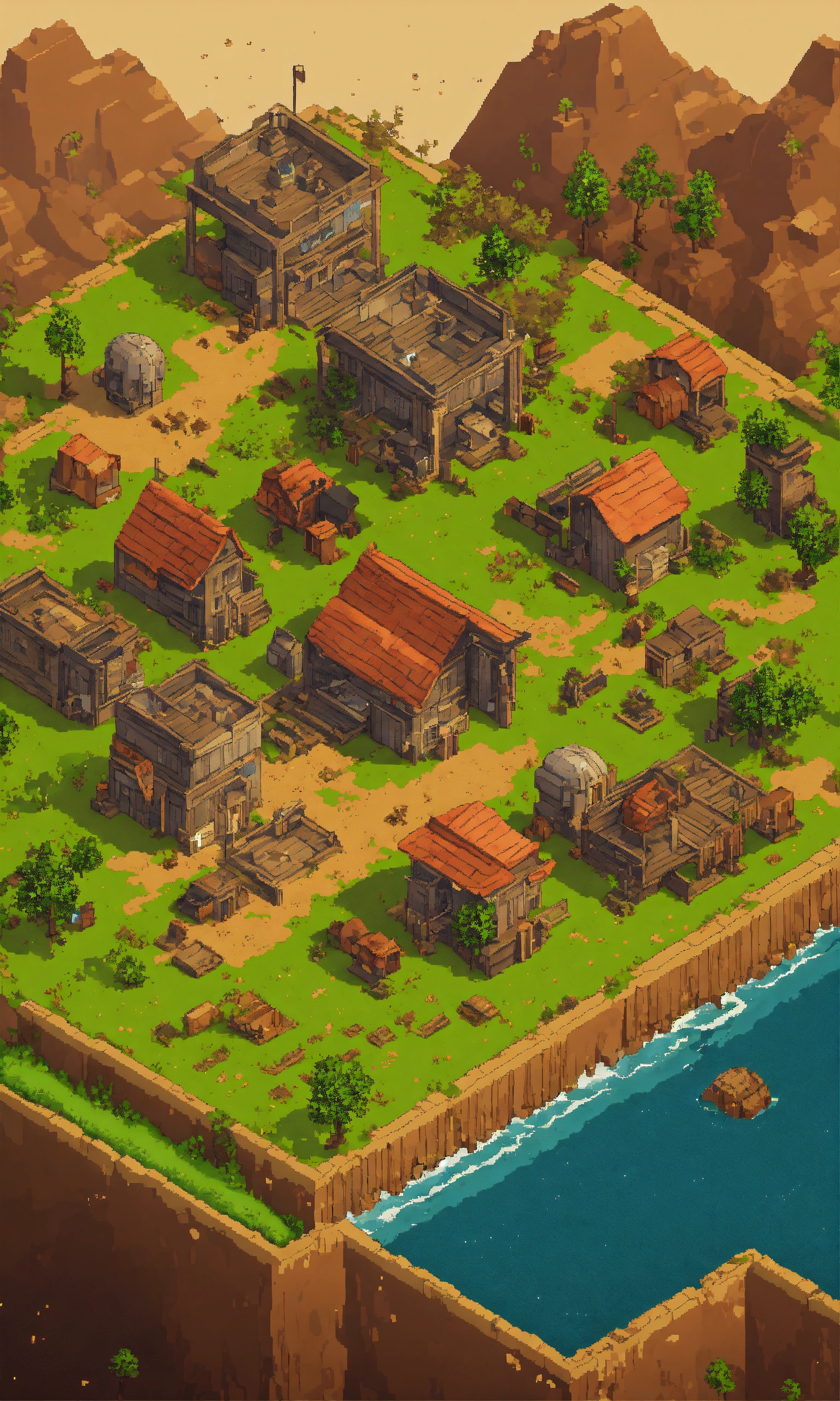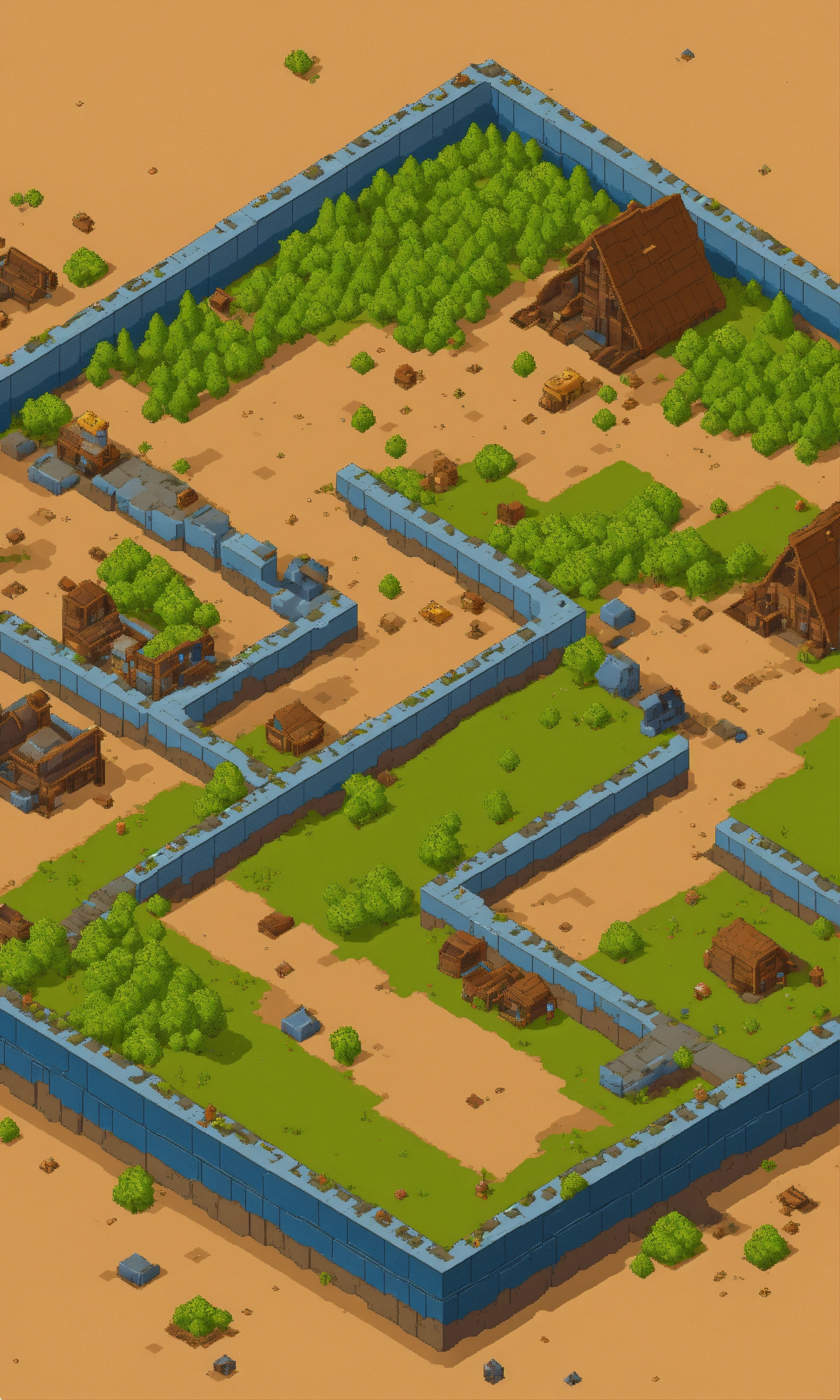 Isometric, post apocalyptic landscape map for a top down isometric mobile game extremely simplistic pixel art, low res blocky, center is empty, no buildings or water