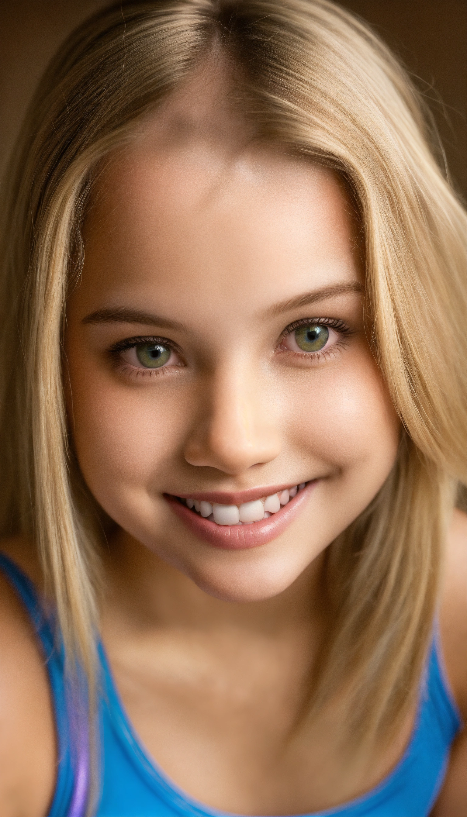 Very pretty, blonde tween girl, very young looking, center parted hair, very long shiny hair, shiny blue lycra gym outfit, shiny very short shorts, bra top, olive skin, posing, small chested, petite, big lips, angelic face, full lips, cute, youthful, pretty, biting lip, high resolution, natural lighting, studio, smiling
