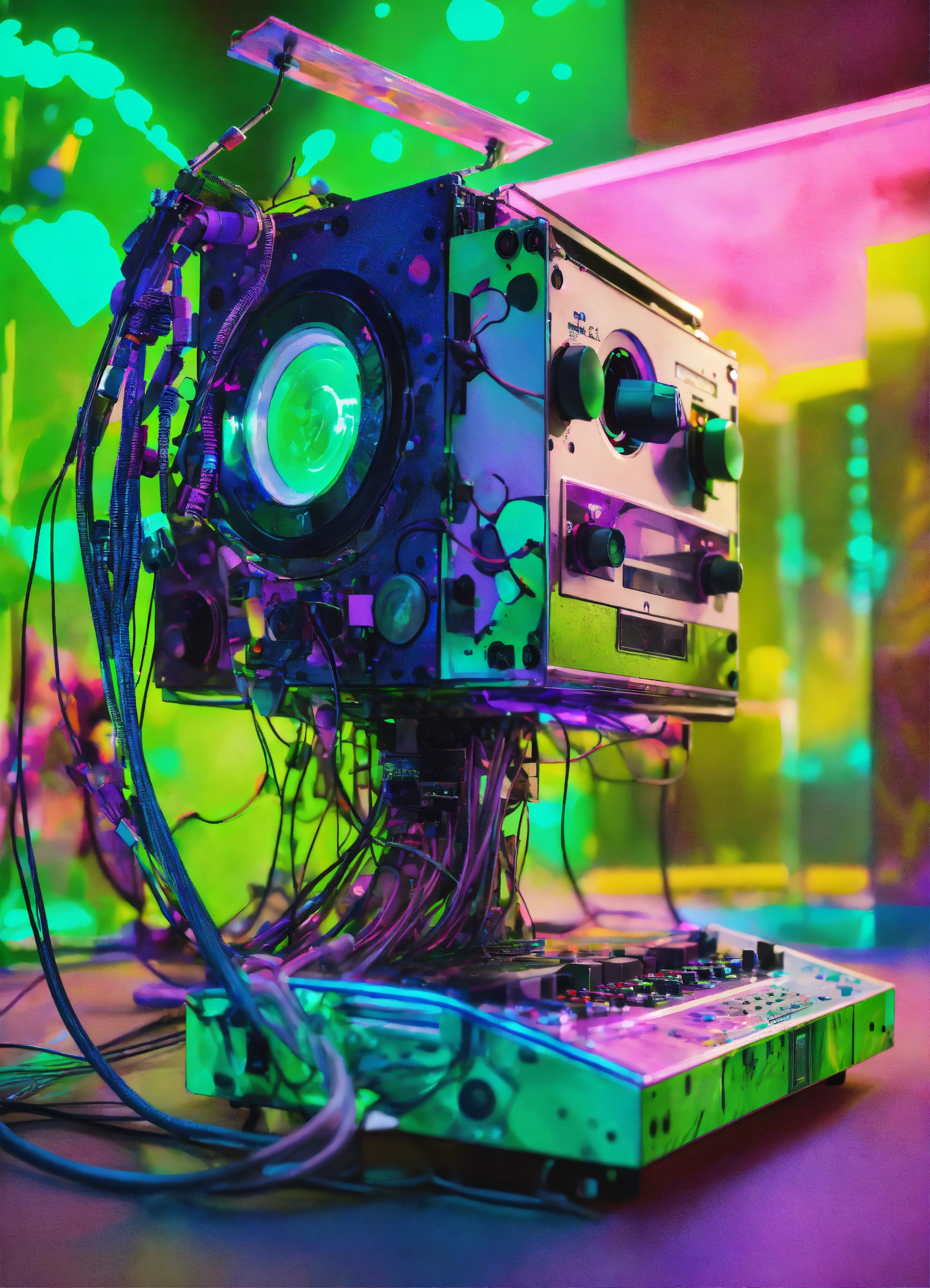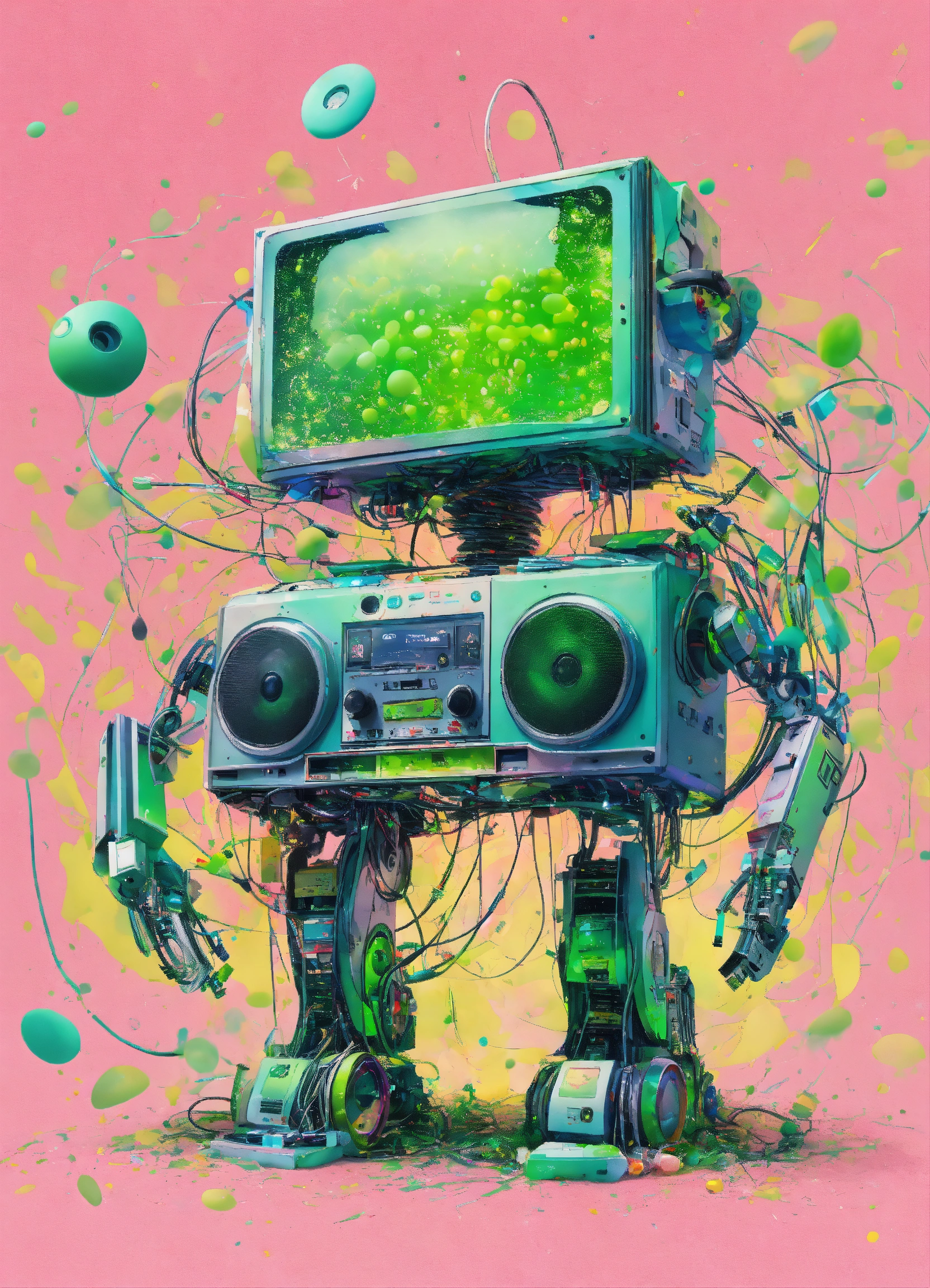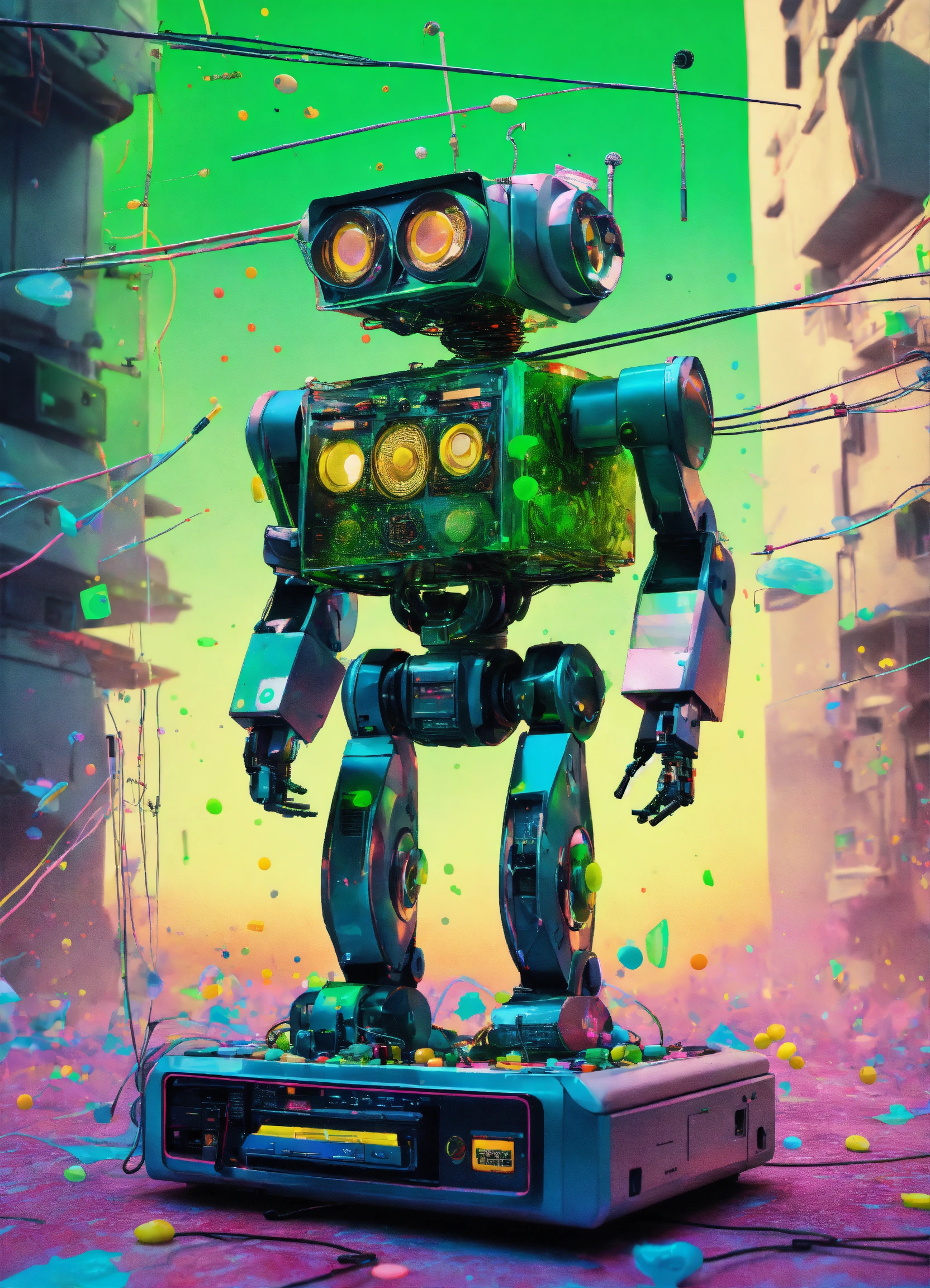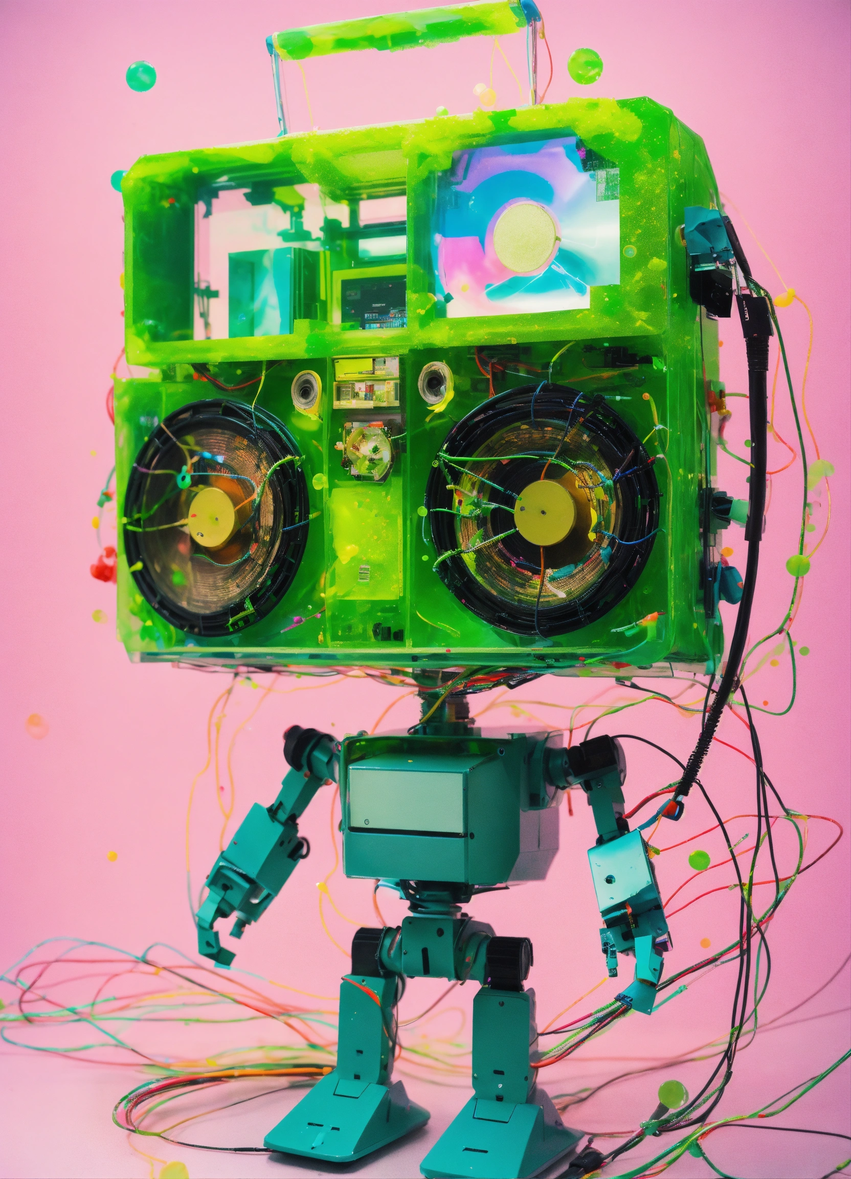 Pastel colors low-angle view shot photography of a robot body emerged from spiral green ink dots splatters, flying huge 3d plexiglass multi cassette ghetto blaster, play station, screeen computer, full of cables and wires, with big boomers, 80 degree view