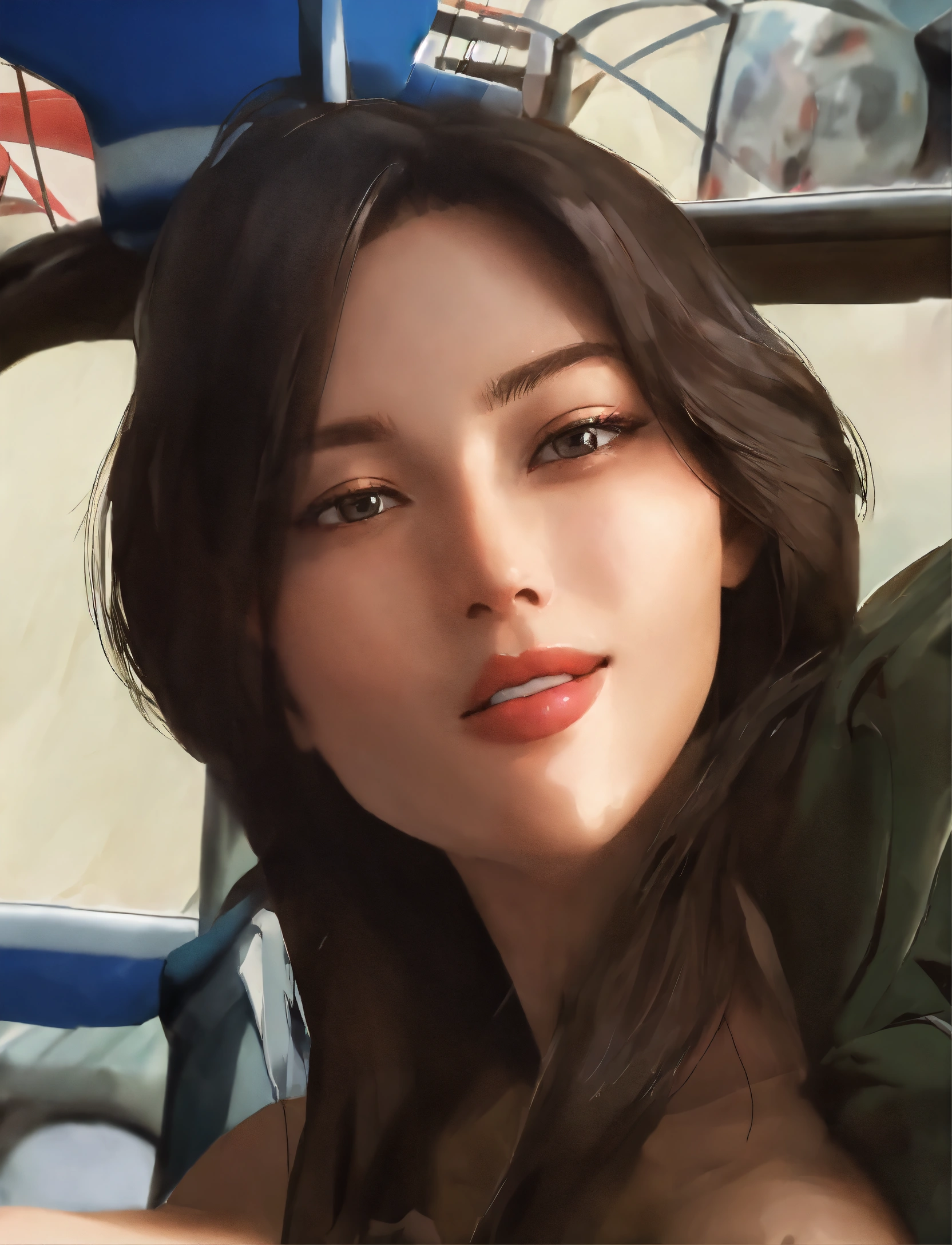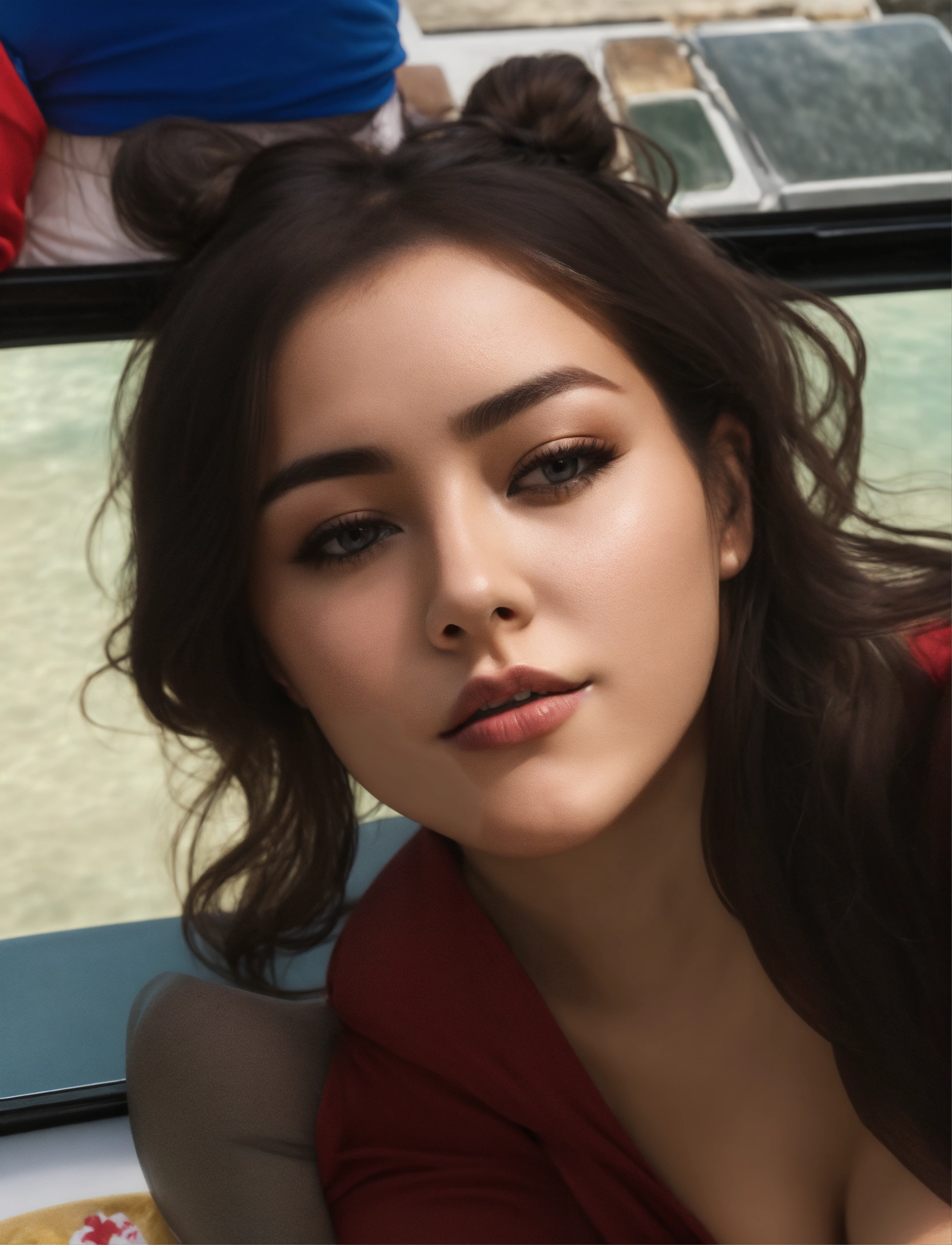 Using the face above, create an image of a woman, medium bust and round rear end, round thighs, in a swimsuit, show the whole body