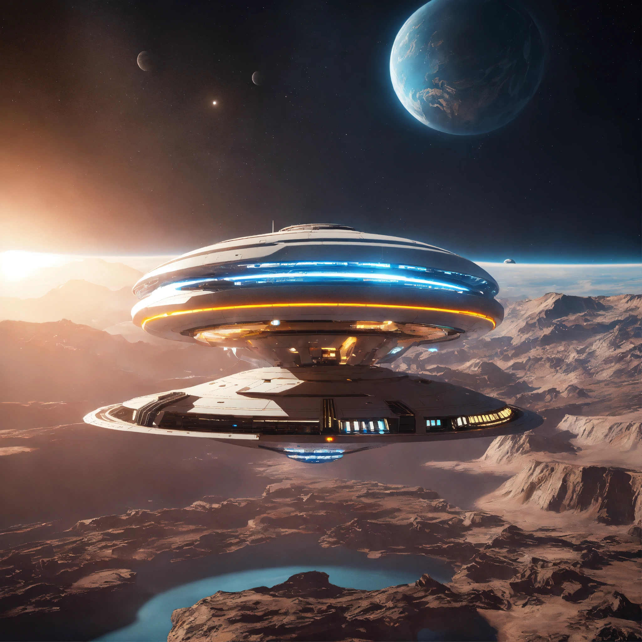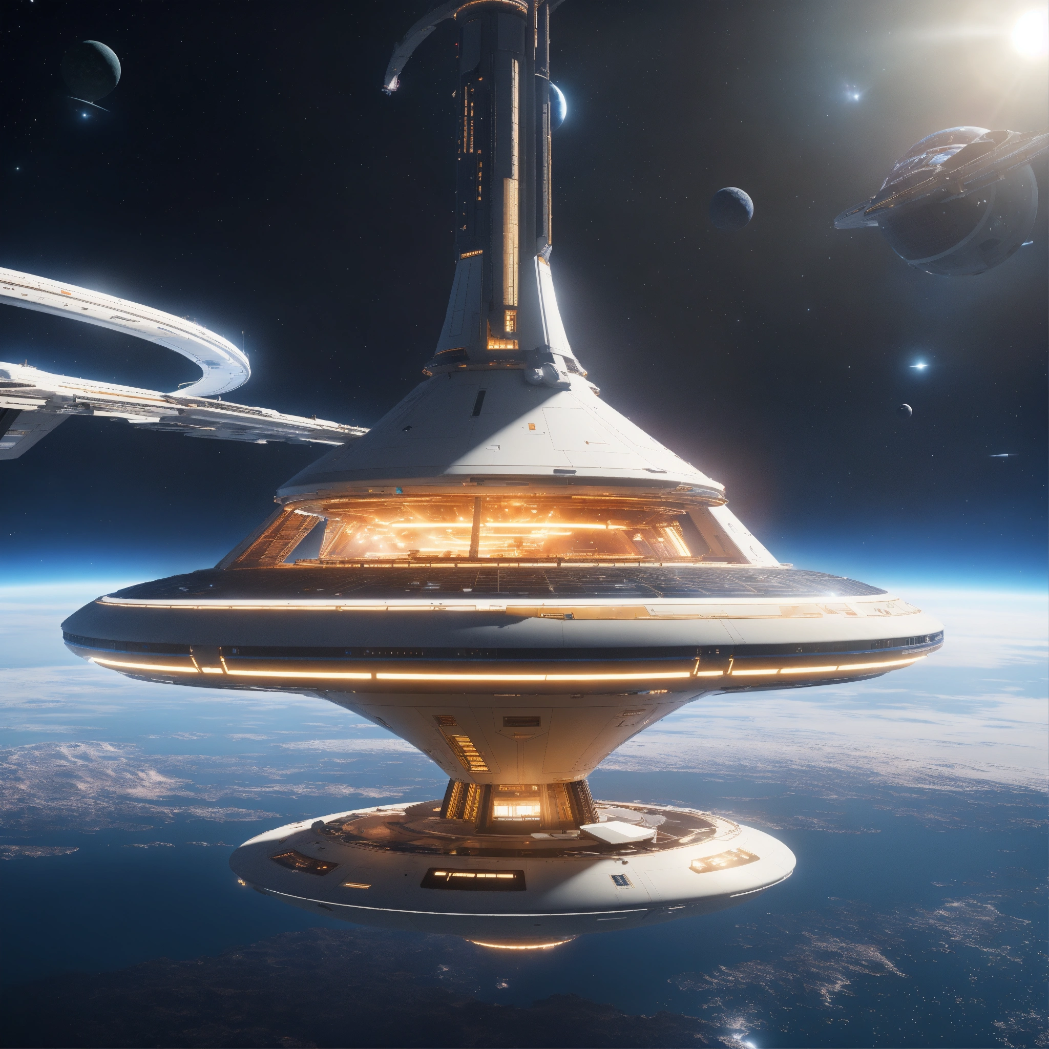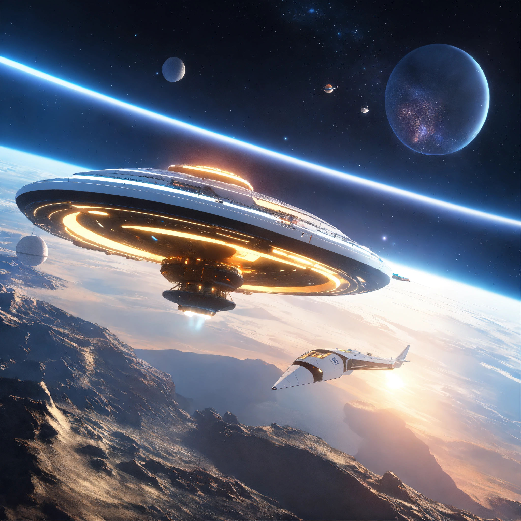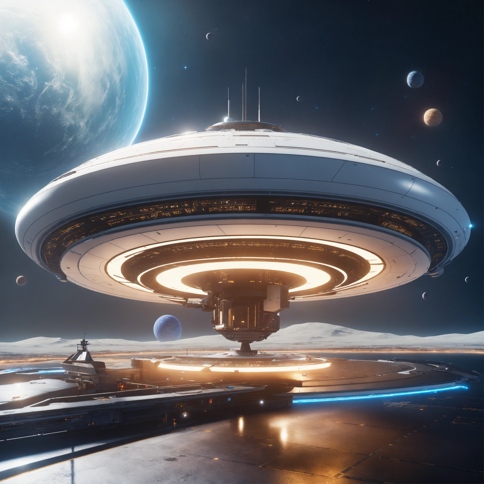 Space yacht flies through a beautiful docking port on a white spinning top disc shaped spaceport floating in deep space, futuristic, sci-fi, 8k, unreal engine, pixar