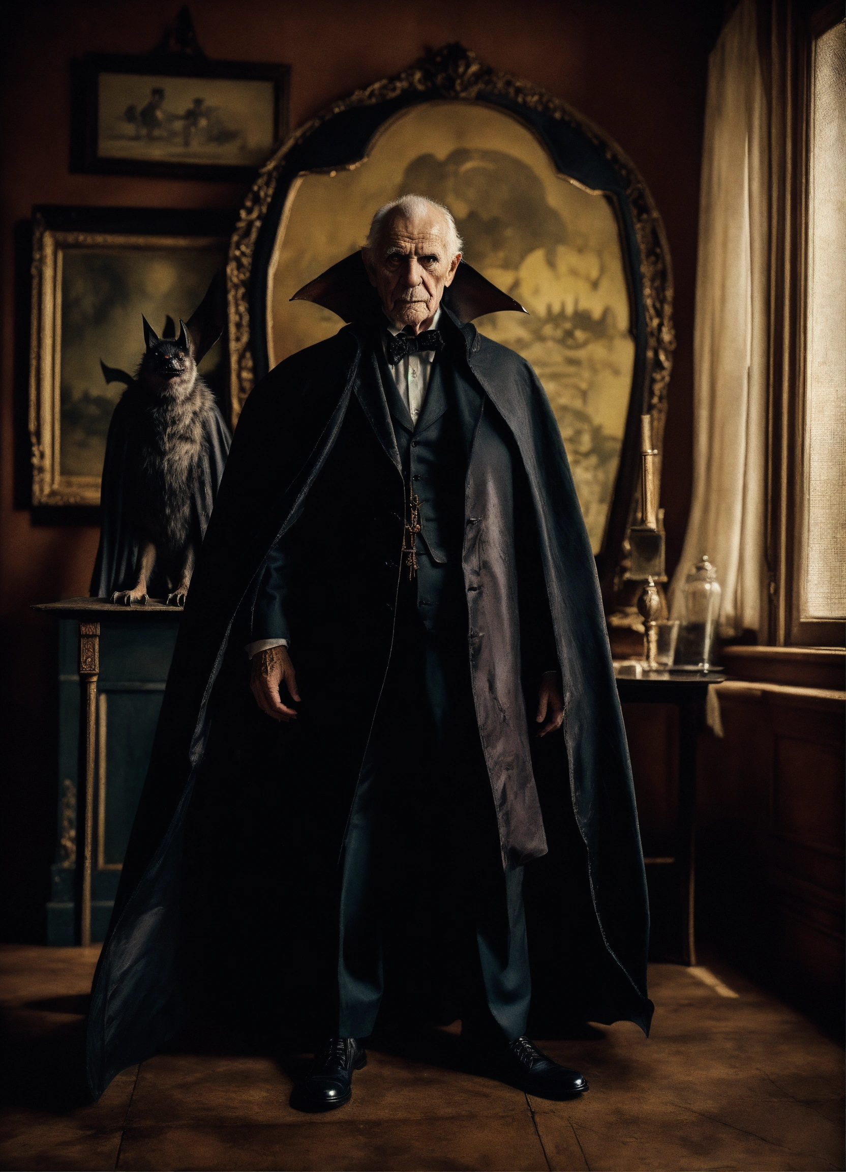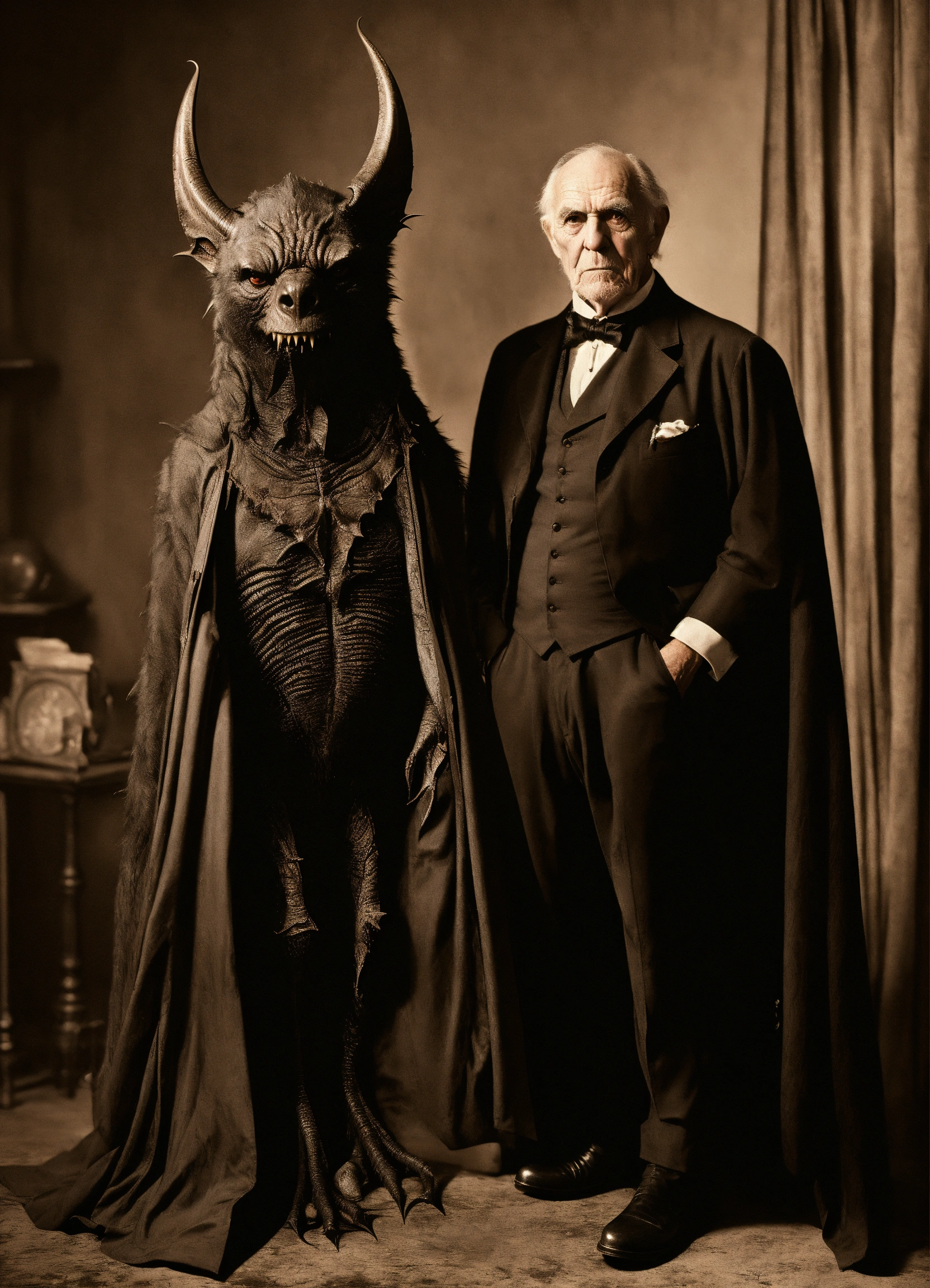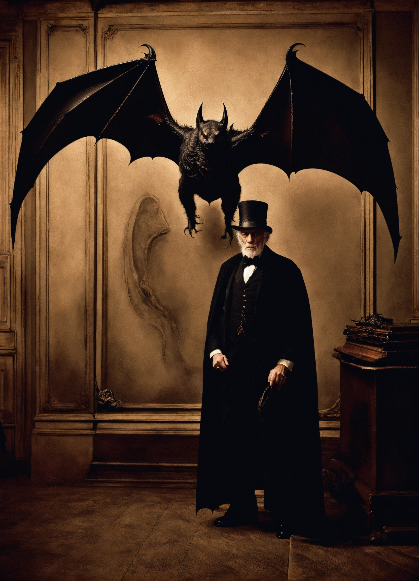 Old vampire man standing next to a giant bat monster, in the style of contemporary vintage photography, necronomicon illustrations, tabletop photography, 1890, hyperrealistic animal portraits, ghostly presence, whirring contrivances