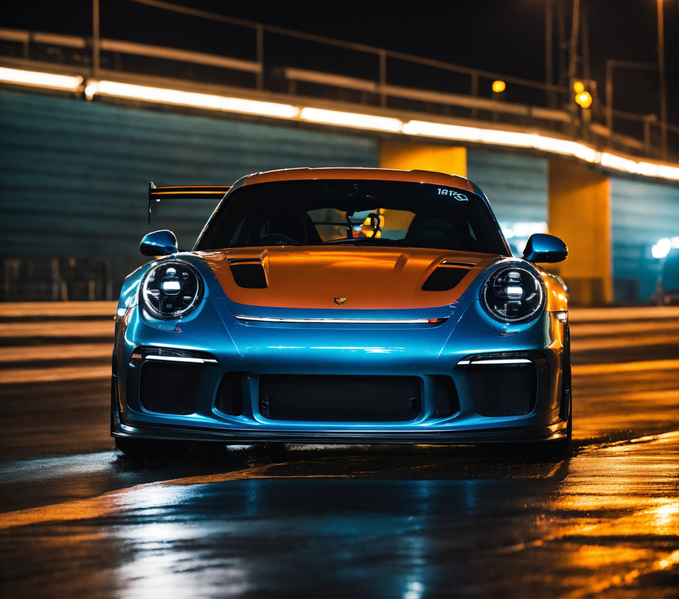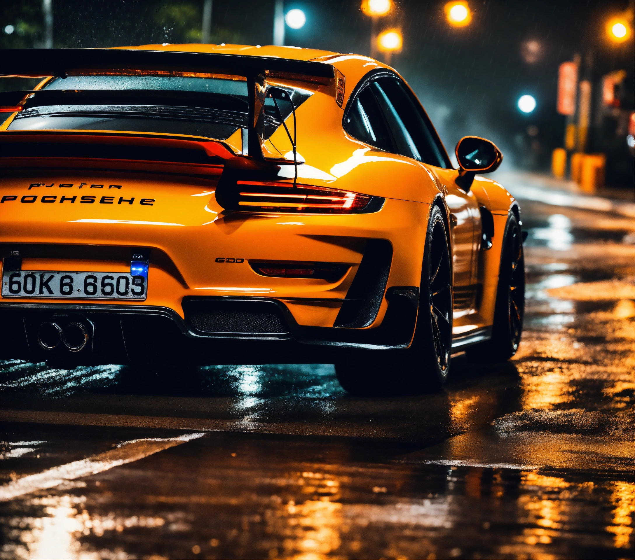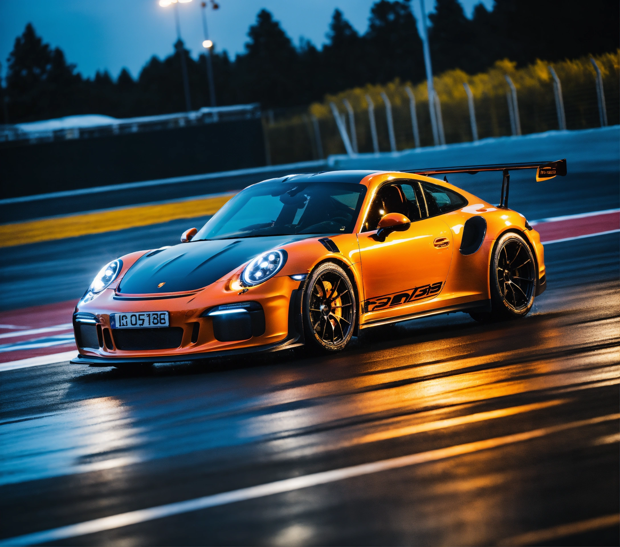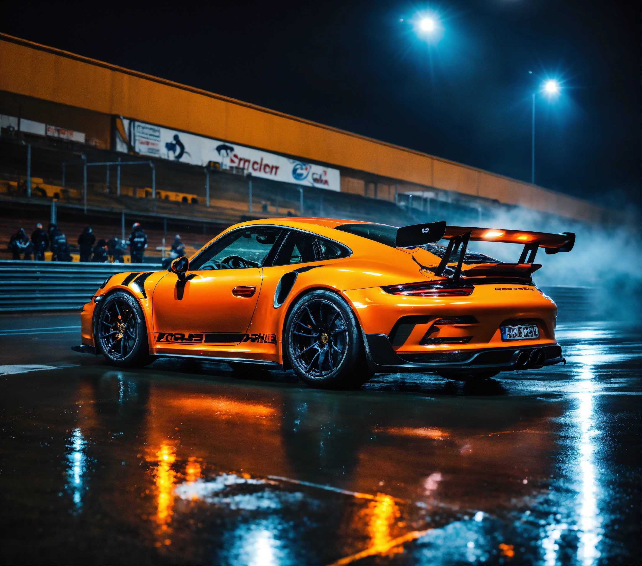Ultra-realistic photo 16k night photo, with rain, orange and black porsche with speed effect, porsche gt3 rs, at full speed, with fast car movement, with feeling of speed, automobile photographer, circuit man in the stands, speed, track, cinema atmosphere, ultra-realistic, with a black background and a palette inspired by the variant of the film "blue lagoon". composition taken with a canon eos-1d.