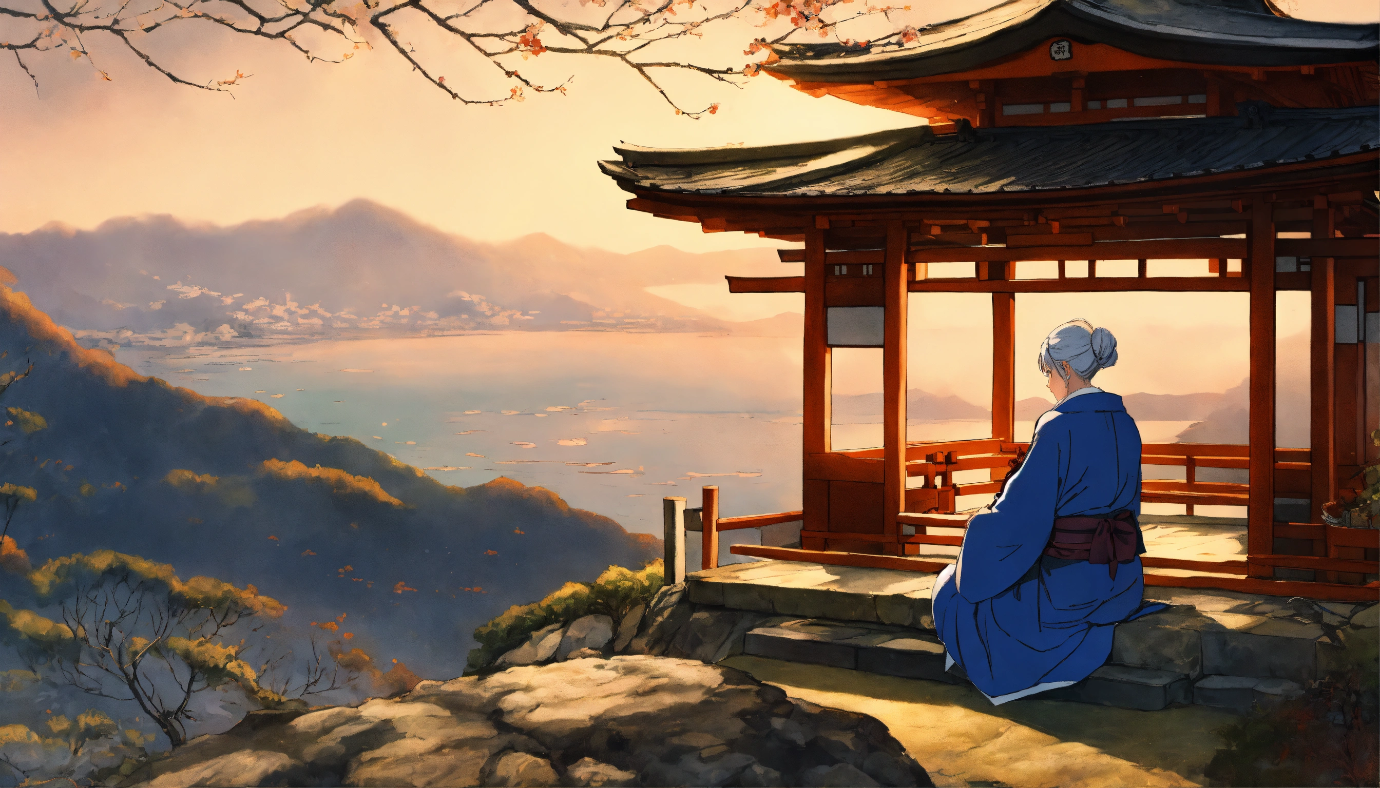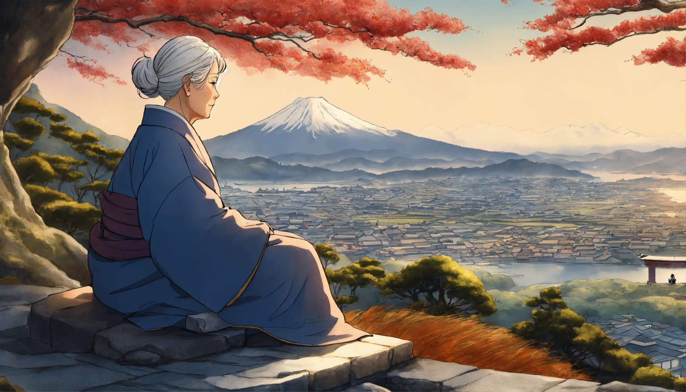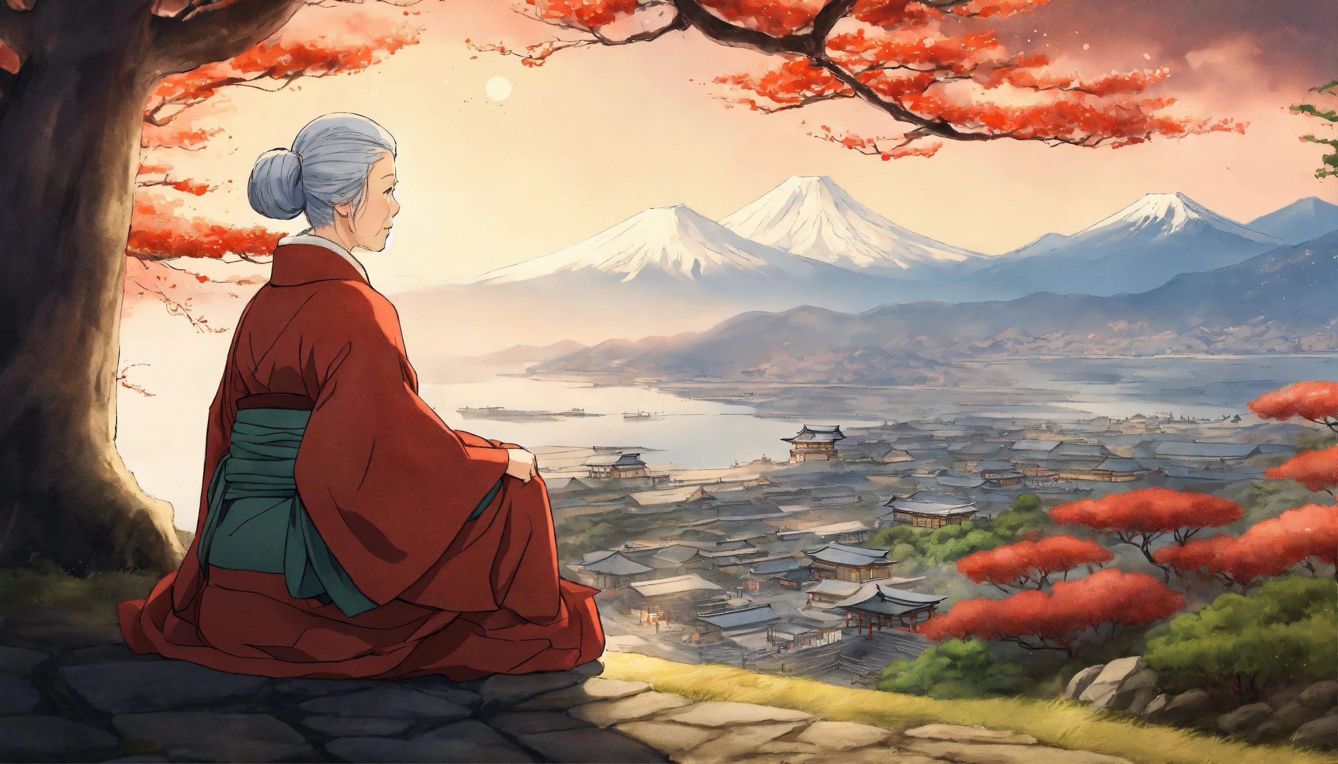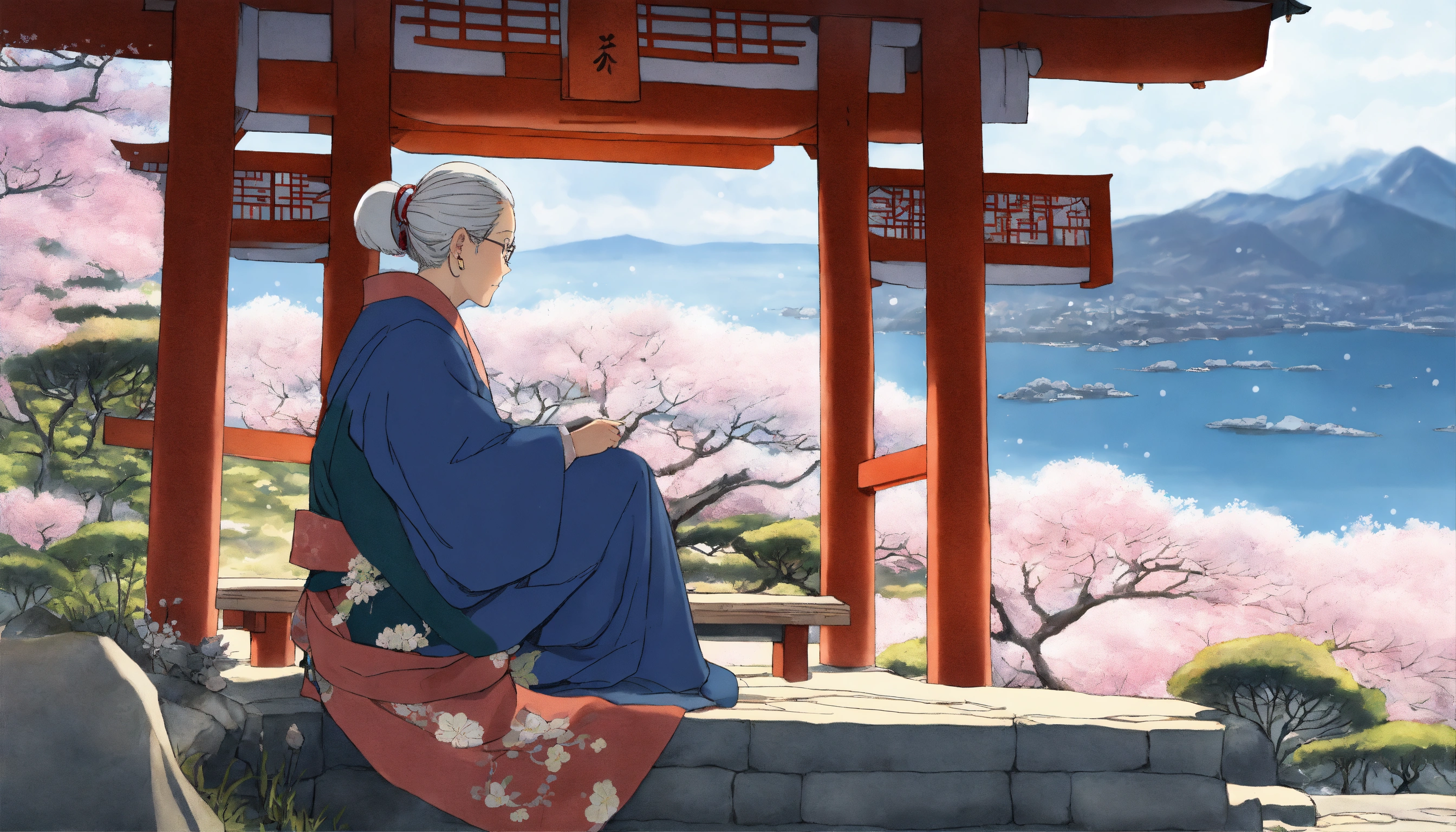 Masterpiece, best quality, an elderly woman wearing robes sitting on the rural hillside near a japanese style shrine during winter with a sea seen far below, drawn by pencil, digital art, art by hiromu arakawa, osamu tezuka, 8 k, beautiful drawing, highly detailed, concept art, sharp focus, ultra realistic illustration, anime++
