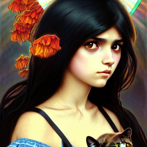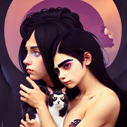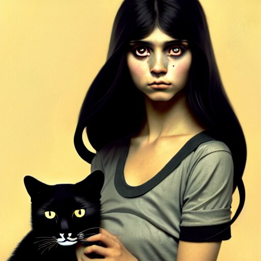 Emo mexican girl and her cat, with long dark hair, thick eyebrows!!! deep dark big shiny eyes and dark circles!, wide nose!, oval face shape, by juan villafuerte, greg rutkowski and alphonse mucha, pexels contest winner, high quality photo, rtx, hd