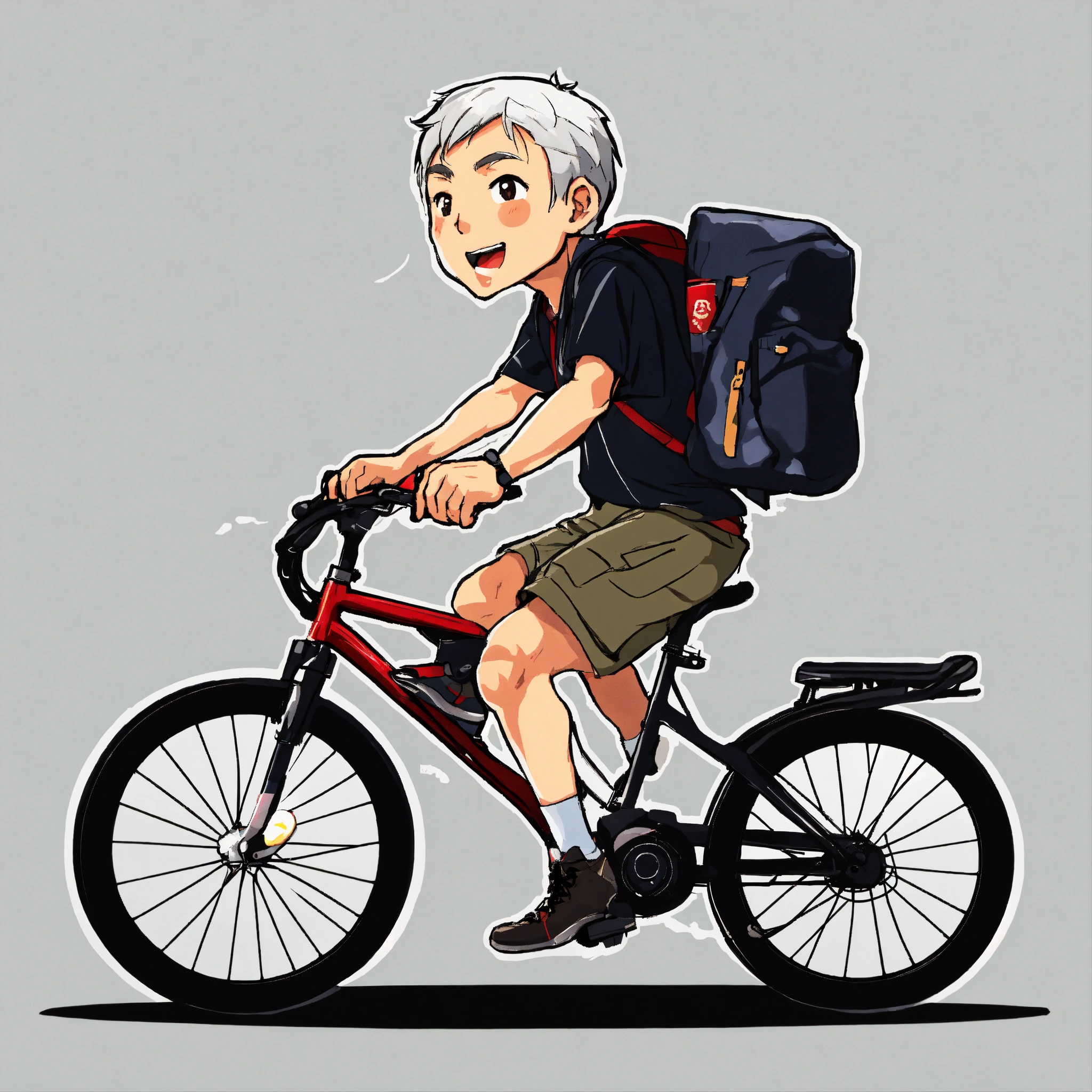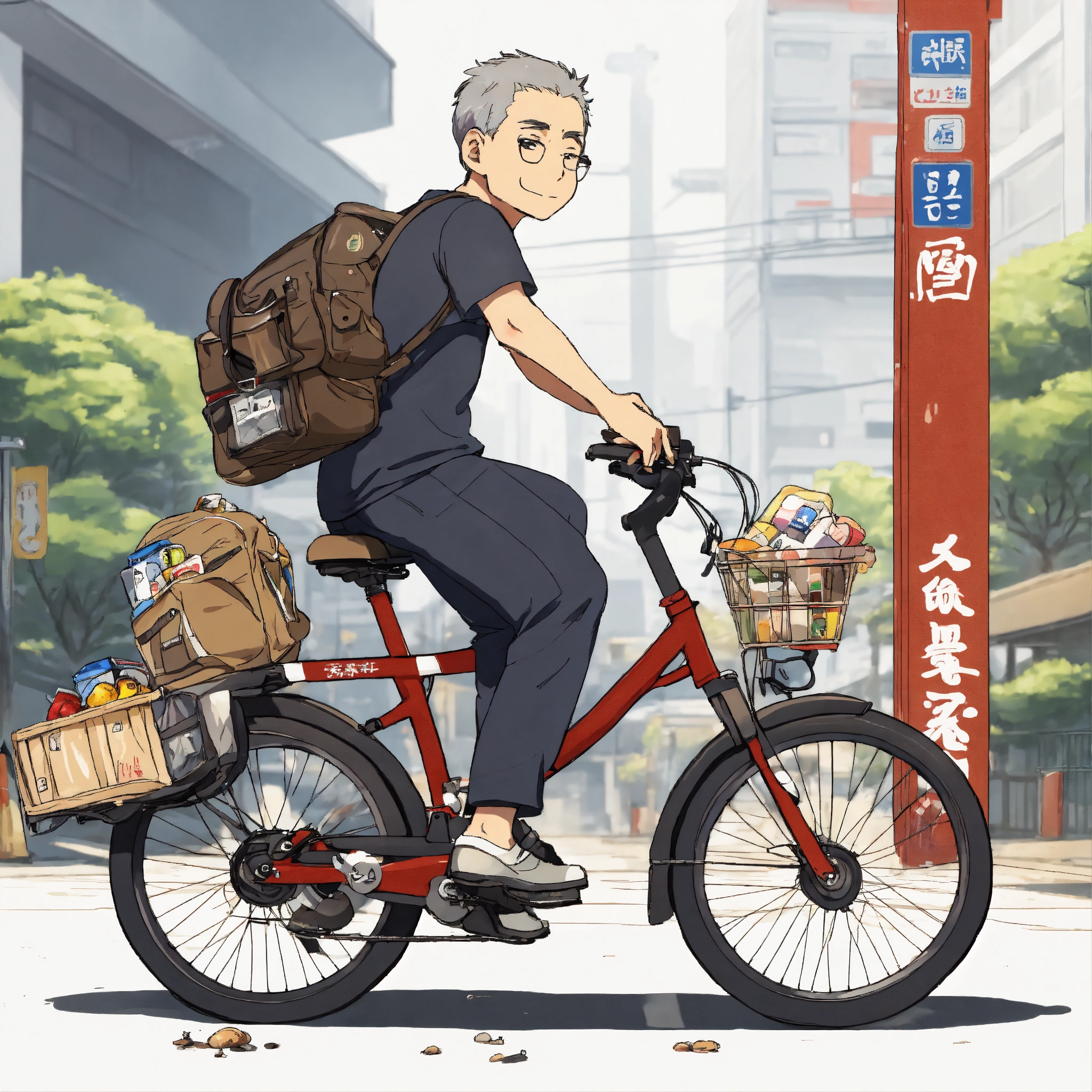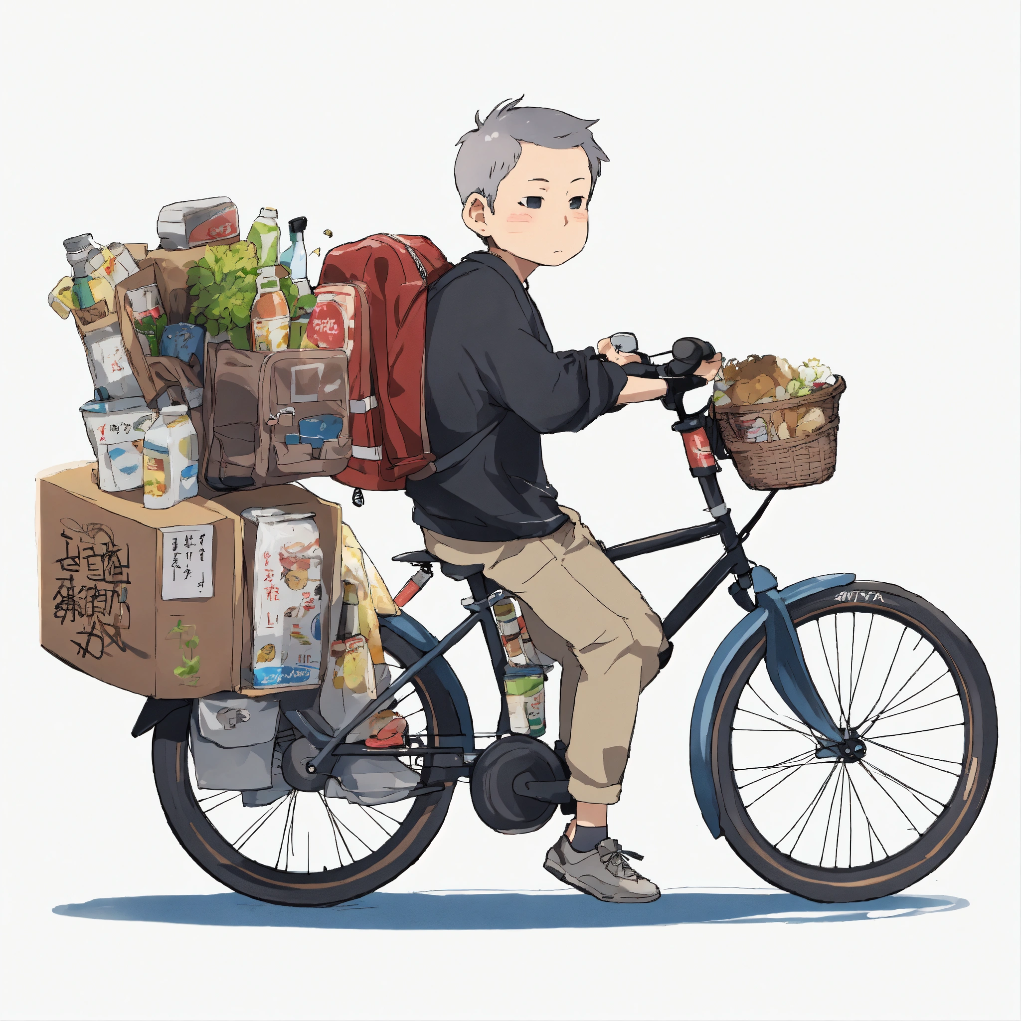 Poor japanese man, ride on the bicycle, black t-shirt, chibi character, anime style, 50 years old, short hair, no cap, white background, no backpack, a lot of stuff on the back of the bycycle