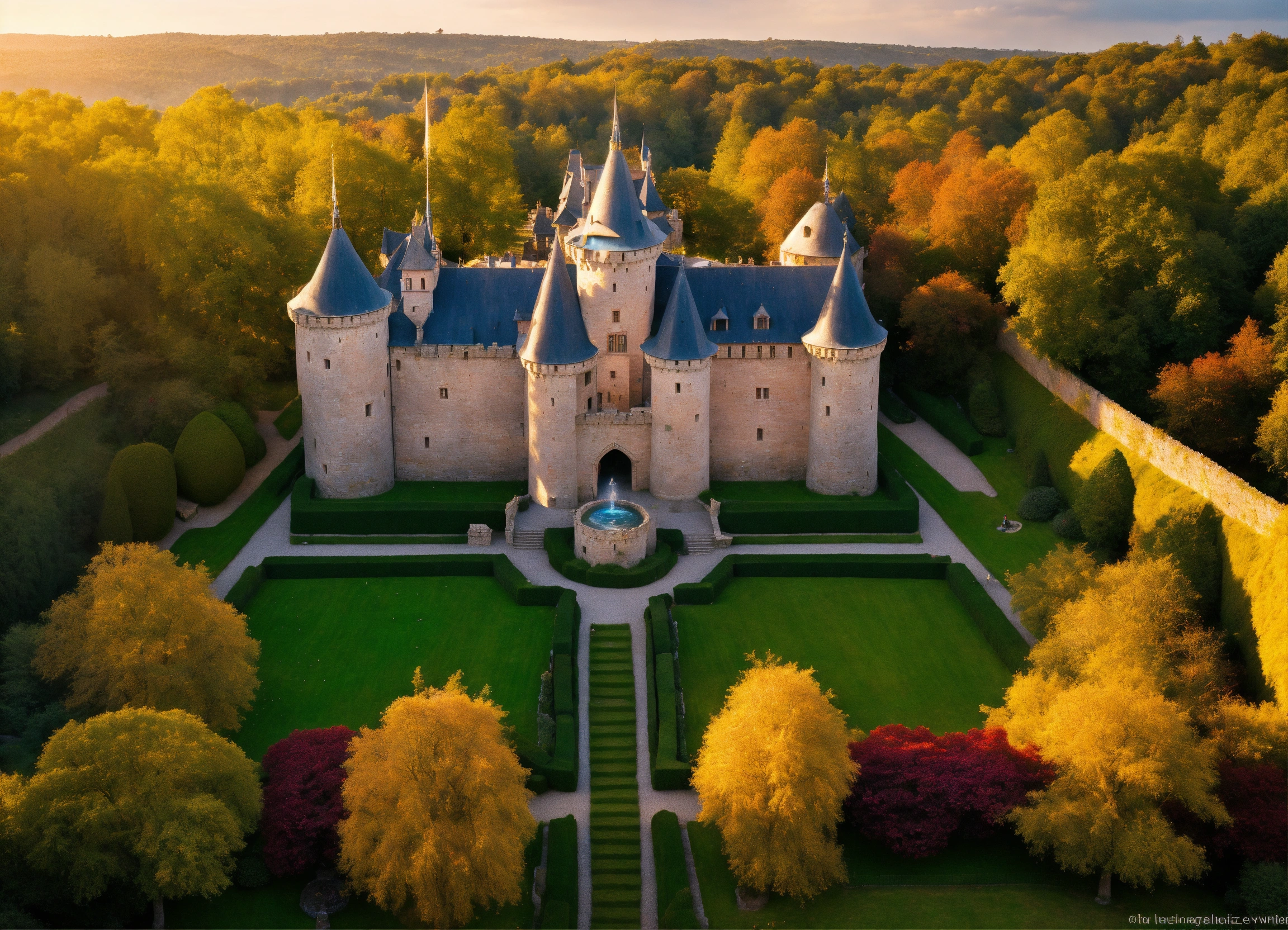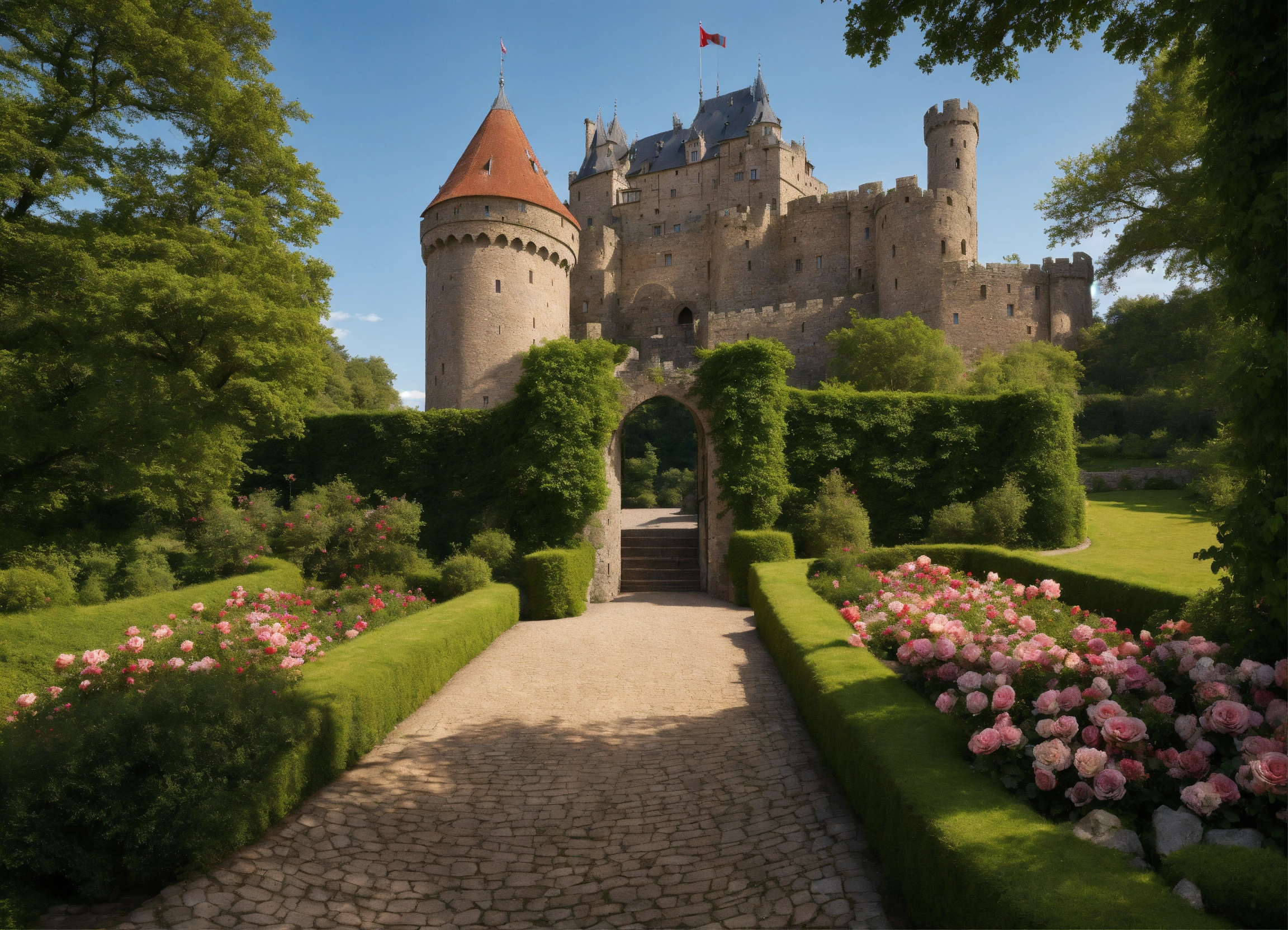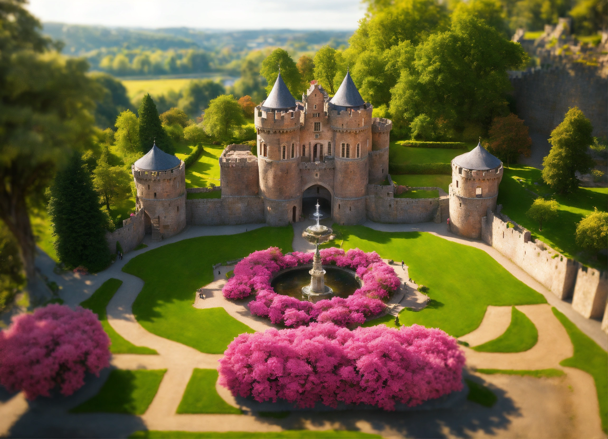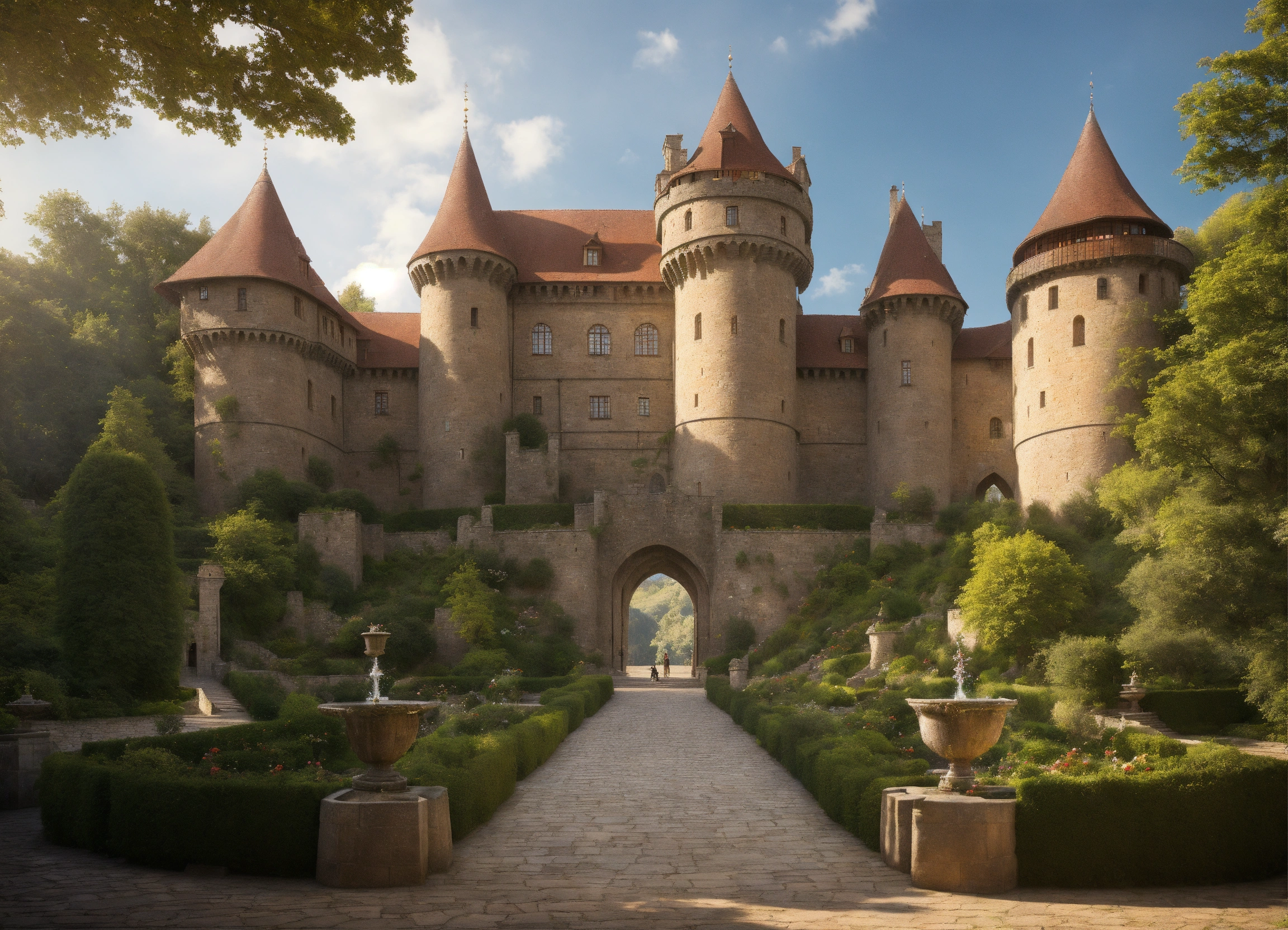 Ultra realistic, photorealistic, bird's eye view, on a narrow mountain plateau a little medieval castle sits enthroned on a narrow mountain plateau, from a big gatehouse at the front end of the plateau a tree-lined boulevard leads to the castle gate, the boulevard is surrounded by rose gardens and water features, on the sides of the castle garden the rocky hangs slope dozens of steps steeply downwards and thus form natural barriers, crenellated stone wall with a central wall gate and watchtowers surrounds the castle, magnificent fountain, marble figures in the gardens, servants quarters and stables, rose pavillon, pleasure grotto, large forecourt, ultra detailled, focus on castle, sharp focus, sharp, ambient lighting, ksiąz castle in poland