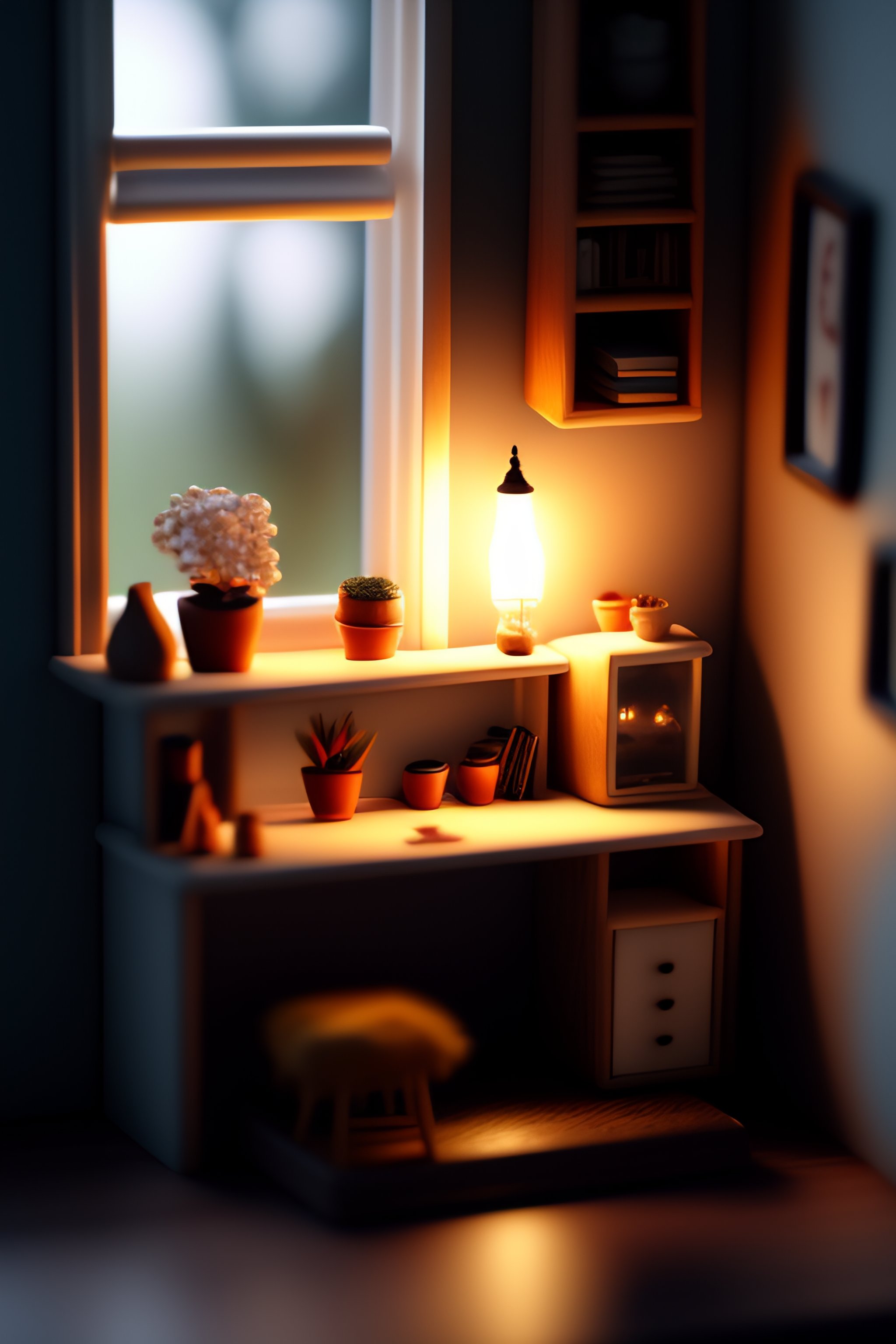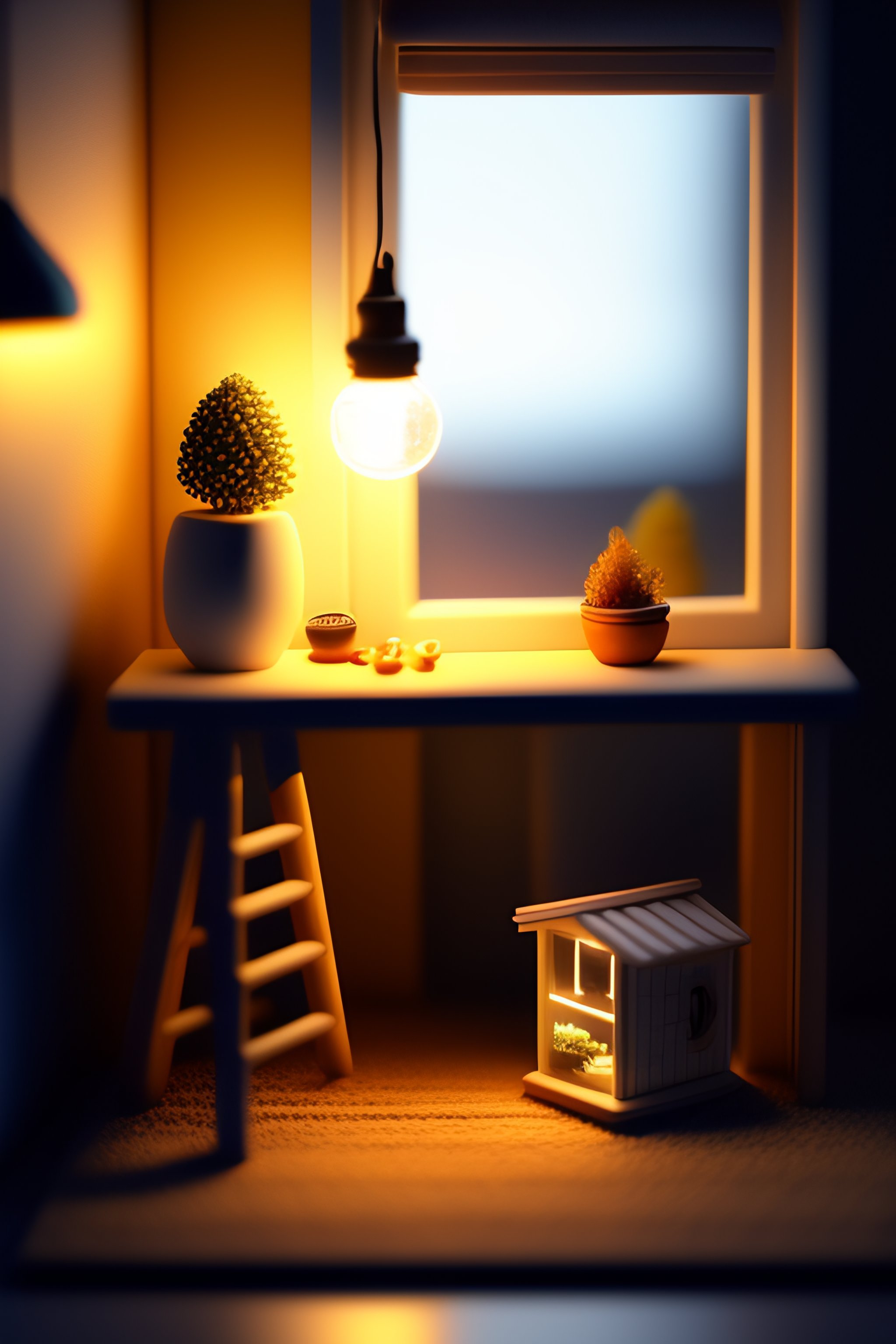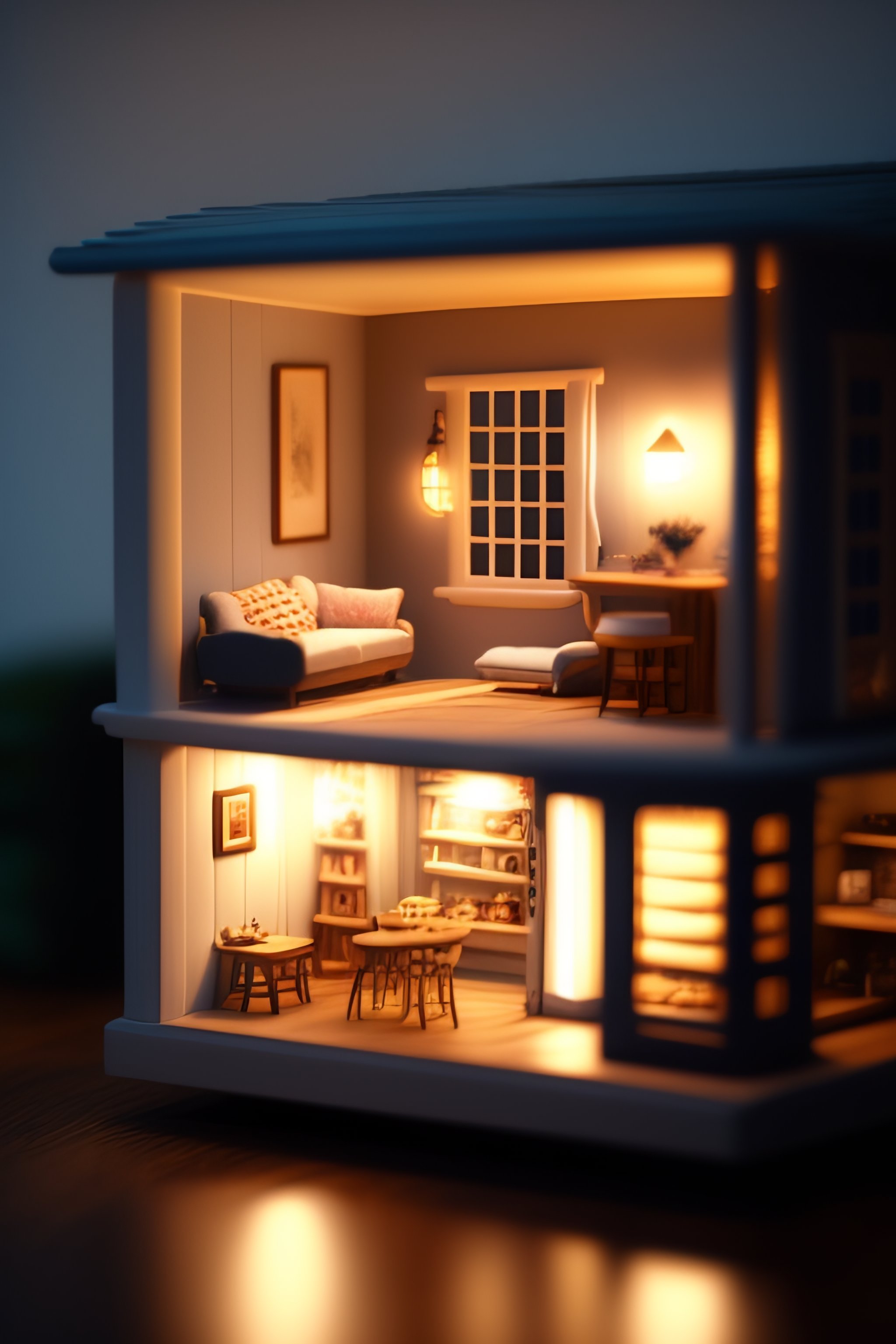 Minimal, cozy interior lighting, artstation, ultra detailed, cinematic, hyper realistic, a realistic dollhouse work room with furniture and window at night. artwork table decoration with handmade realistic dollhouse.