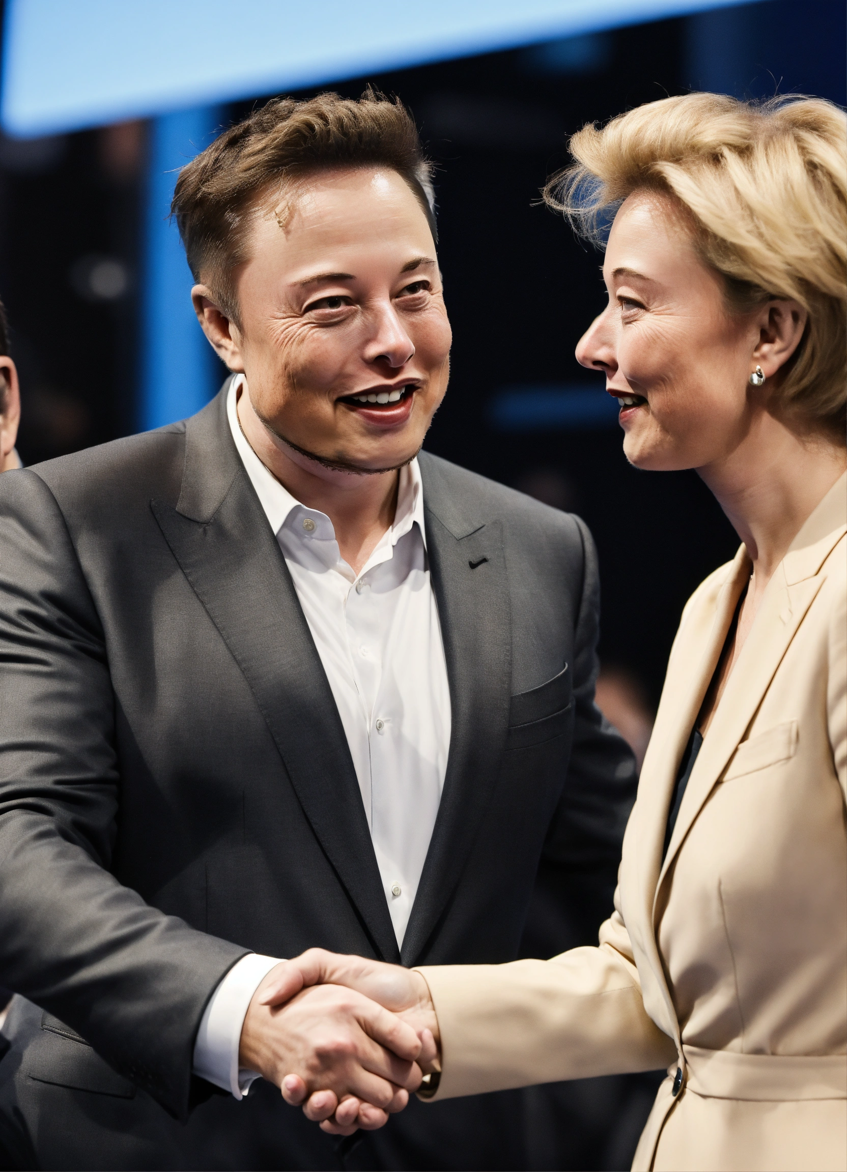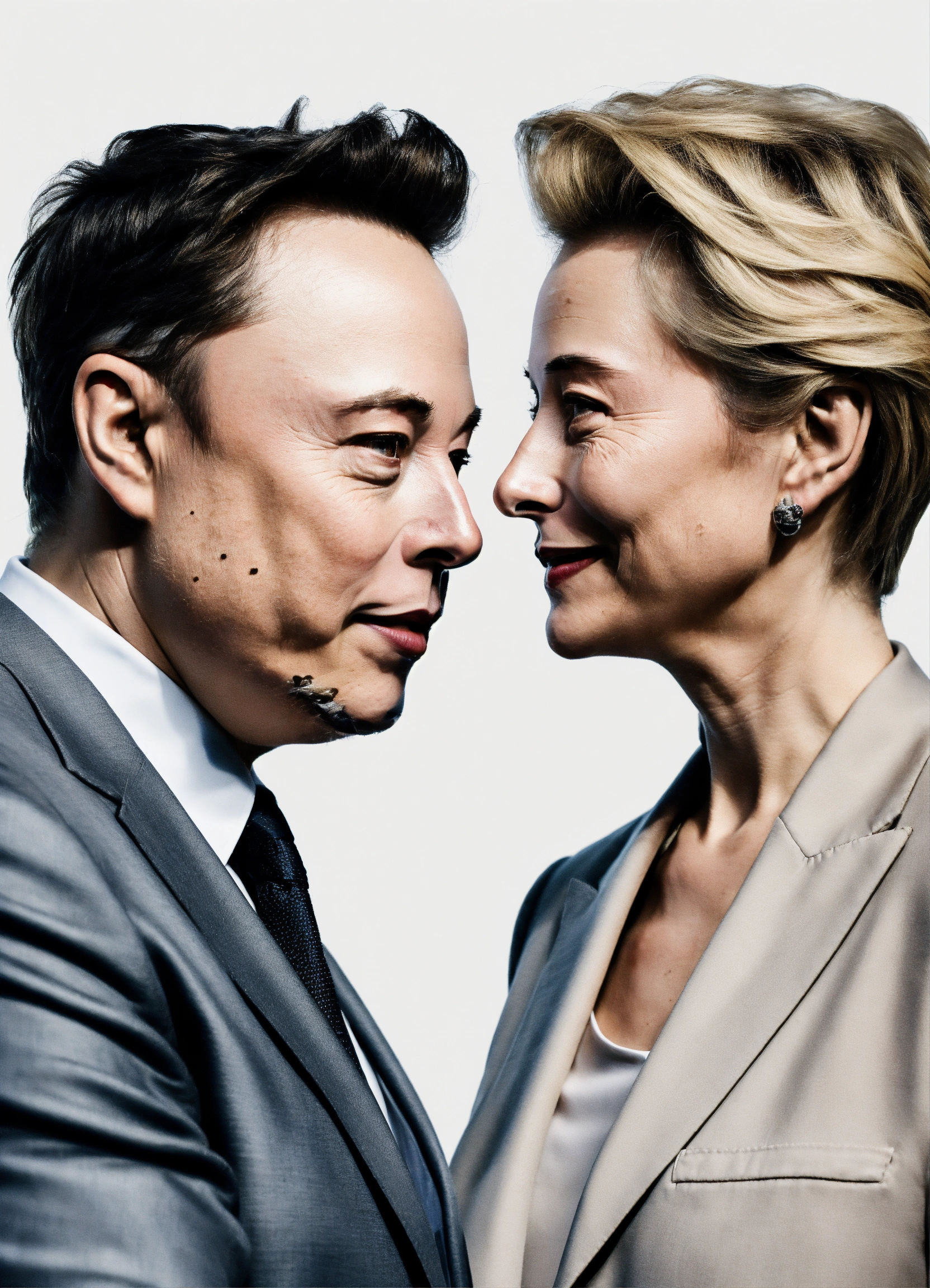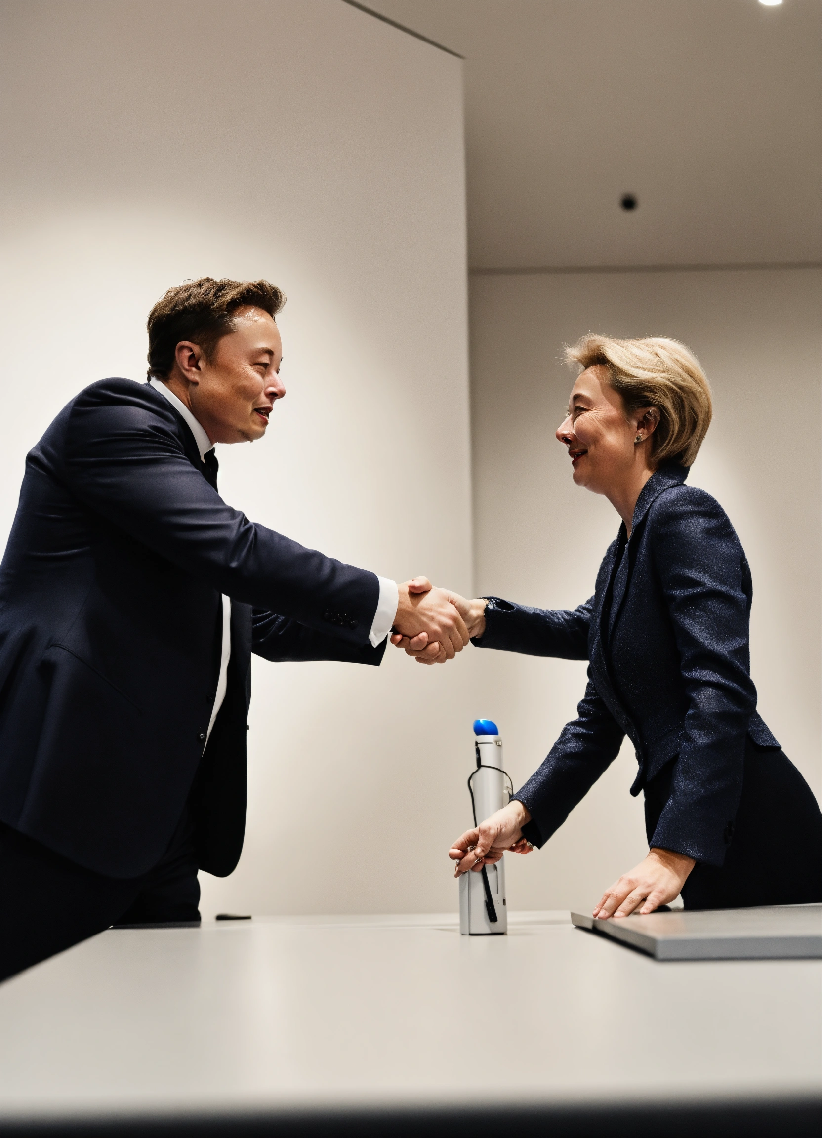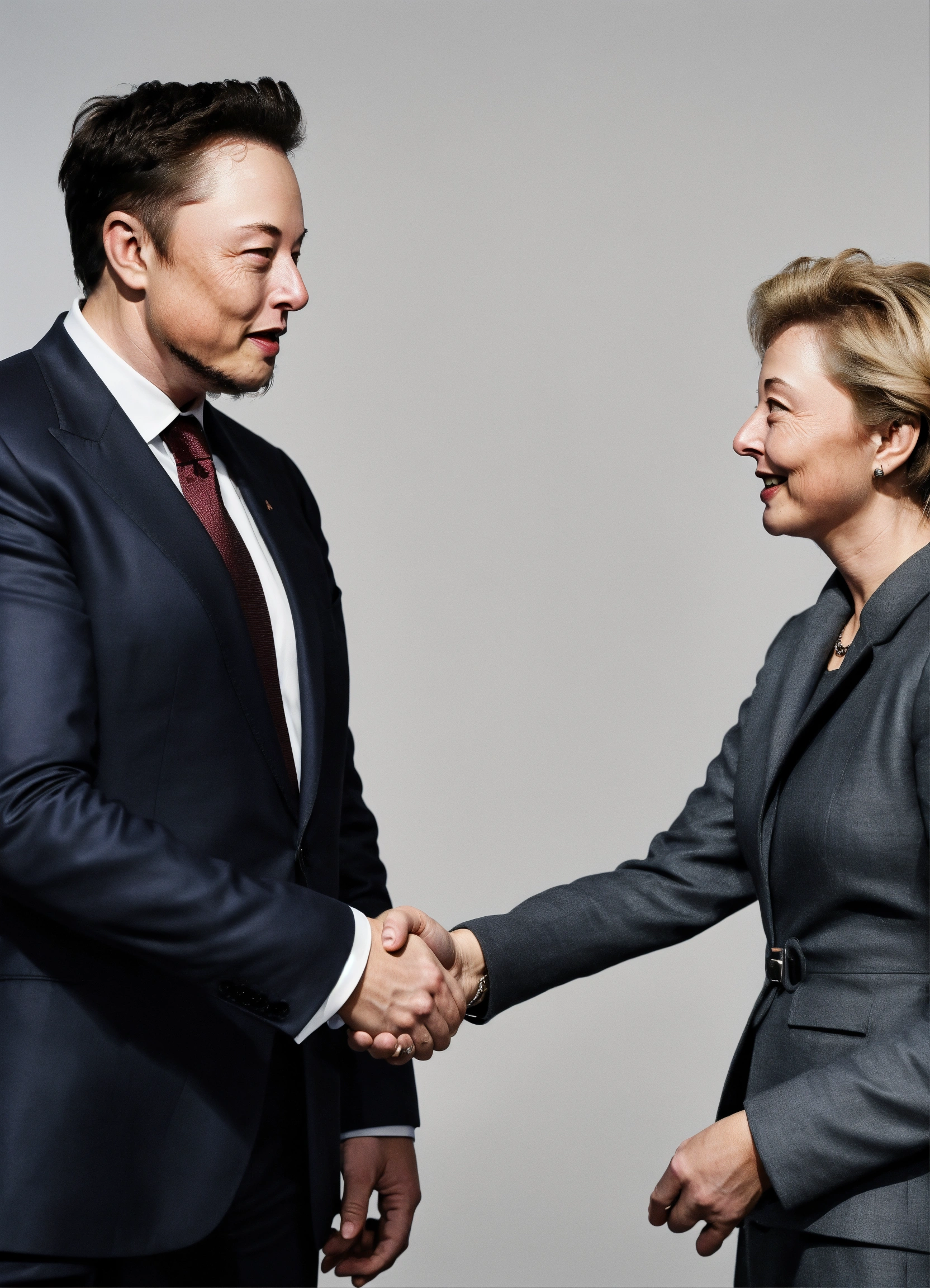 Elon musk shaking hands with ursula von der leyen looking at the camara on a white background, like a photo, realistic