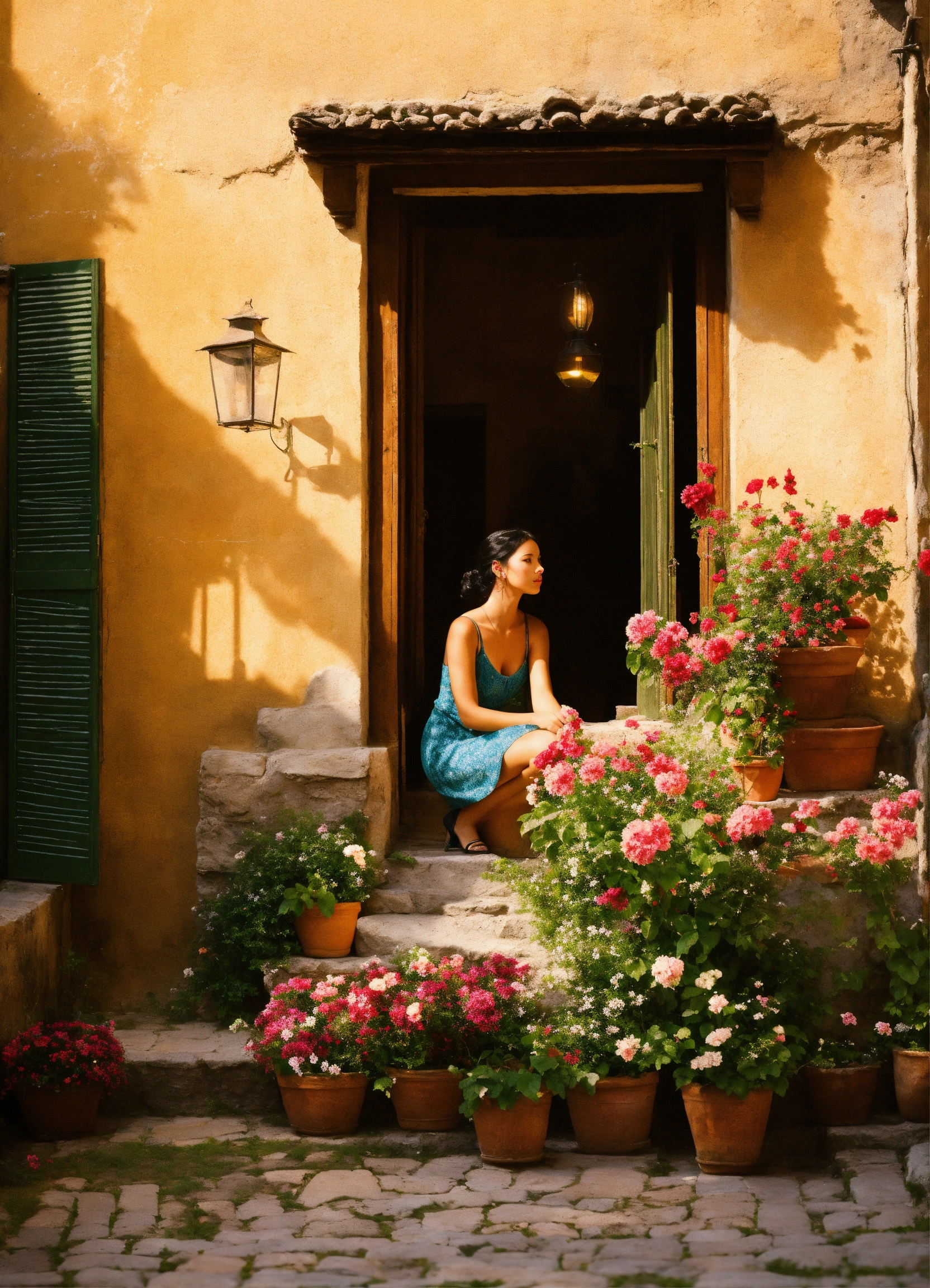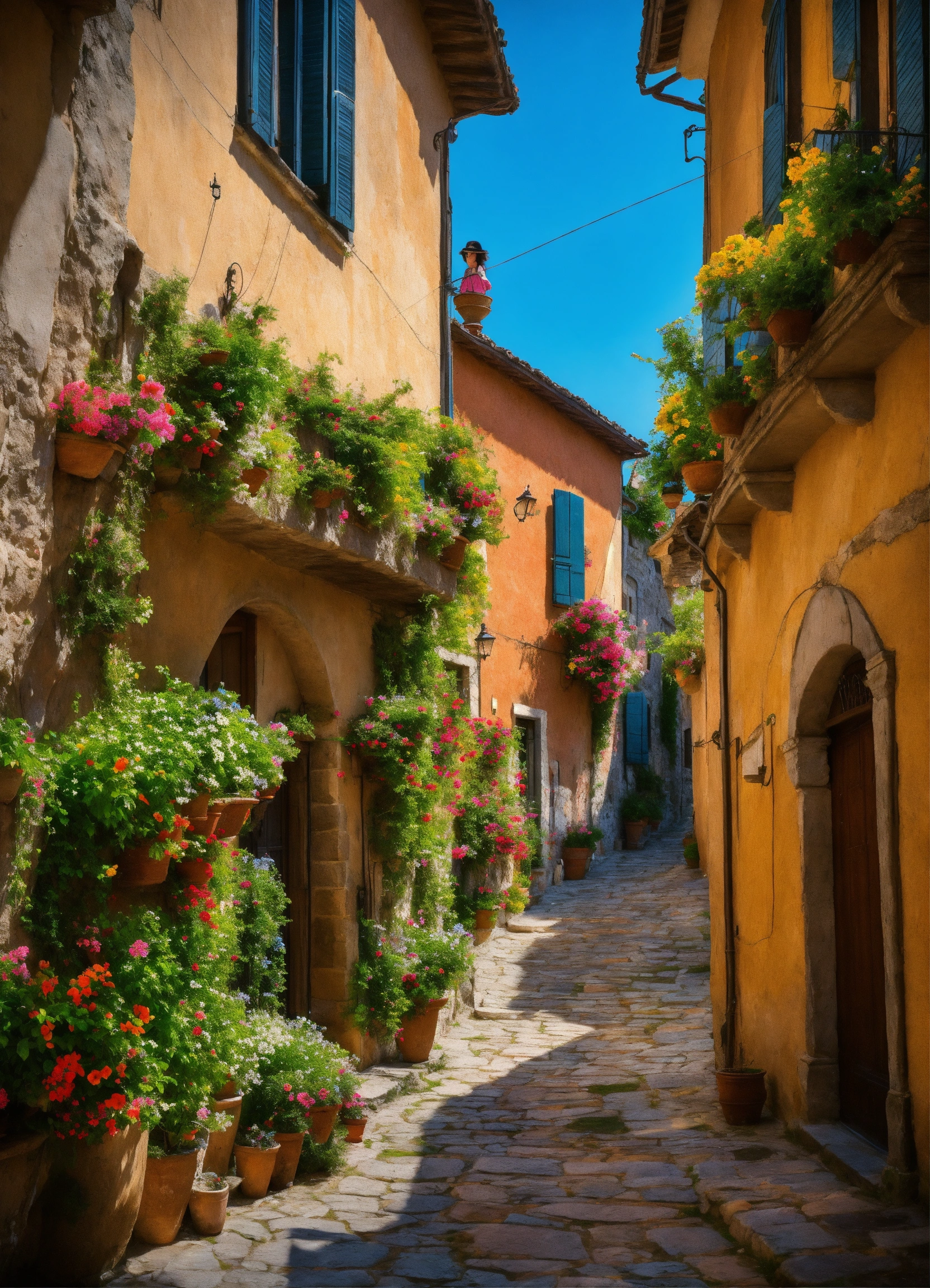 Venture into a charming italian hamlet, where the streets are narrow and every turn reveals stone-built houses that have stood the test of time. balconies and windows come alive with flowers of every hue, painting a vibrant tapestry against the muted tones of the stone. as you navigate this maze, a girl captures your attention. seen from behind, her silhouette is gracefully poised, and her black hair, tied up, adds to her mystique. the scene feels like a frame from a federico fellini movie. medium photo hyper-realism. style inspired by the neorealism era of italian cinema. lighting soft diffused backlighting, highlighting the intricate details of the stone houses and the girl. colors a palette dominated by earthy browns and grays, contrasted by the vivid colors of the blooming flowers.