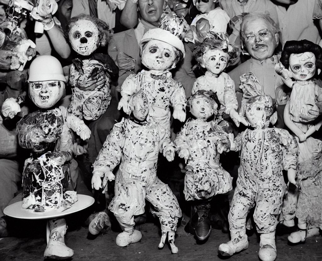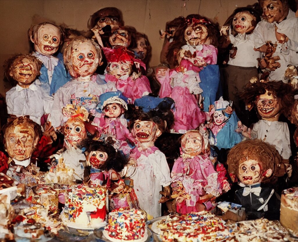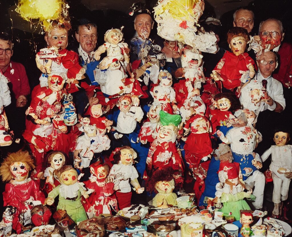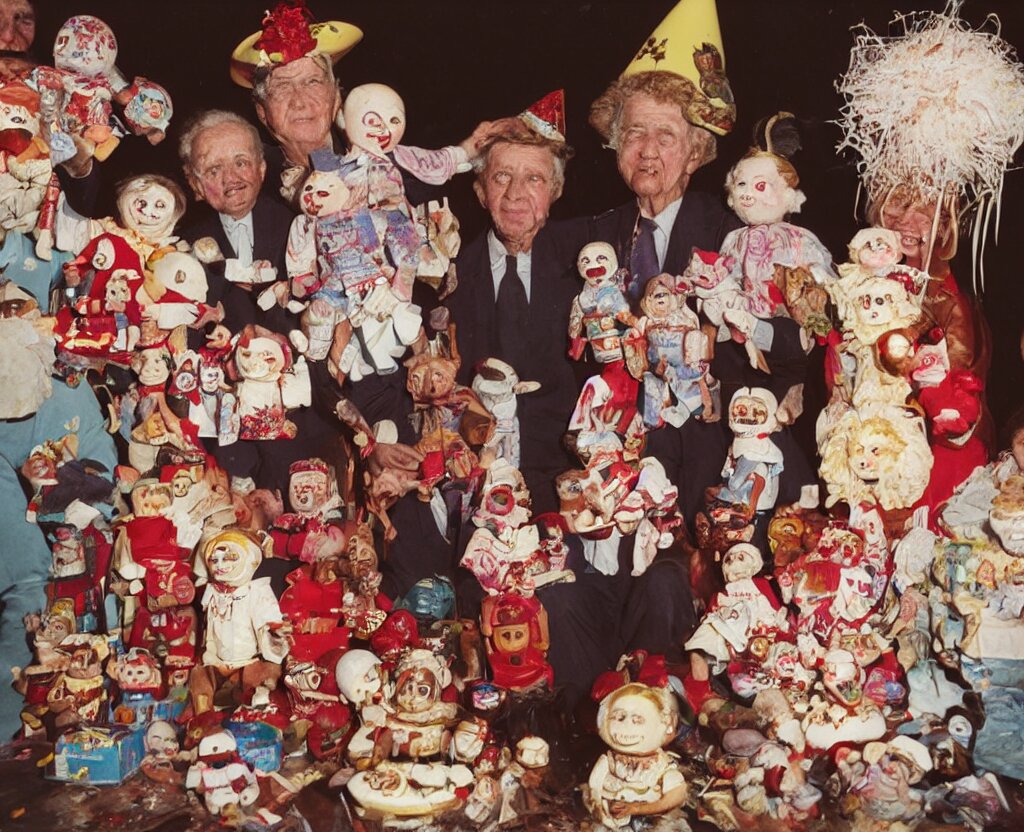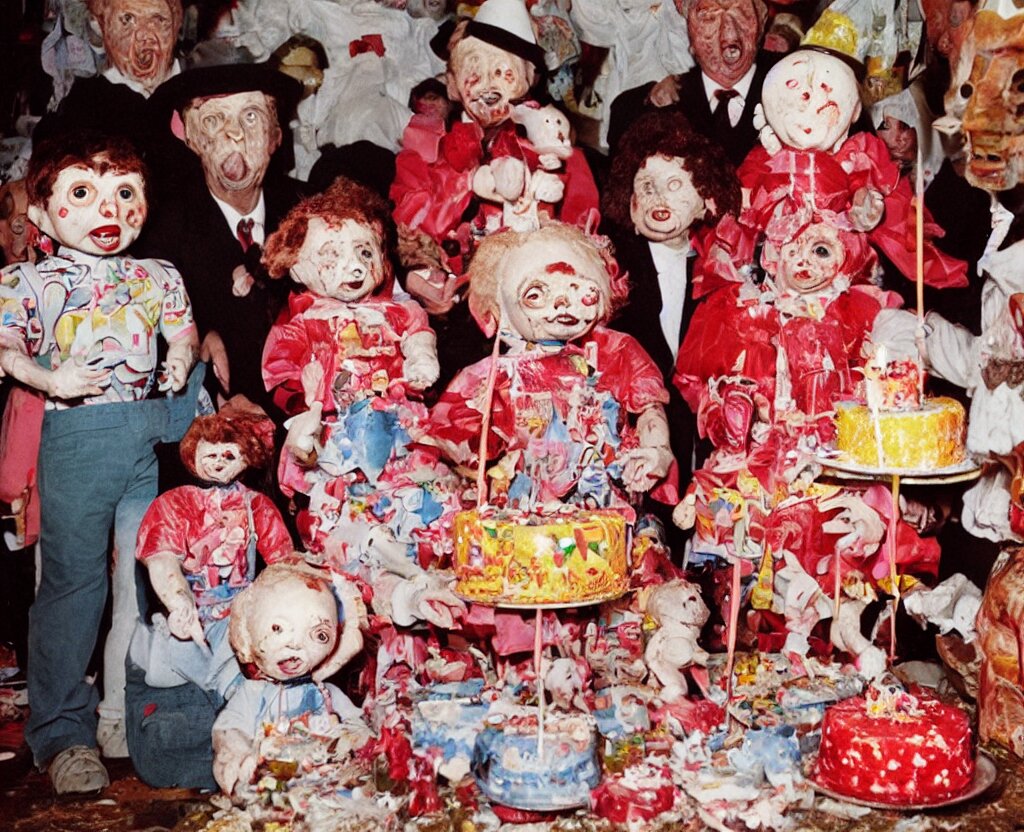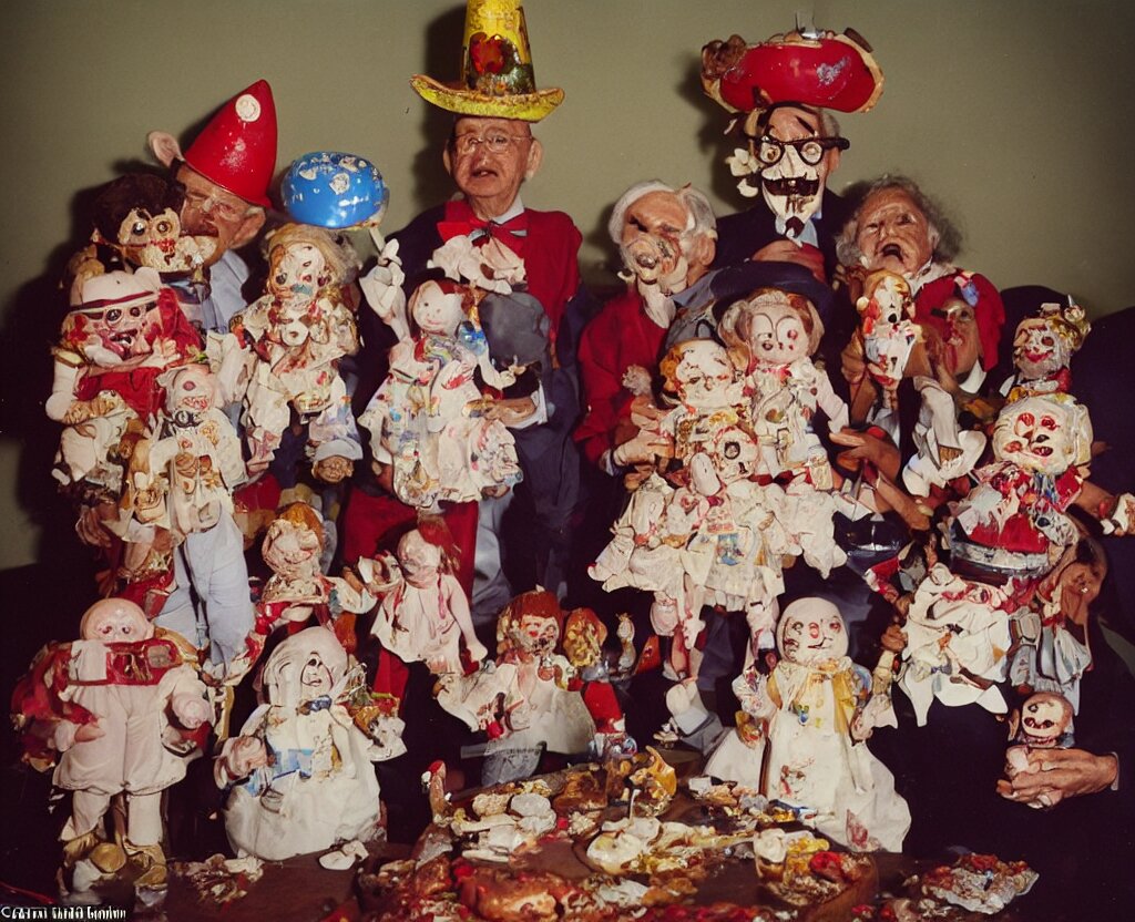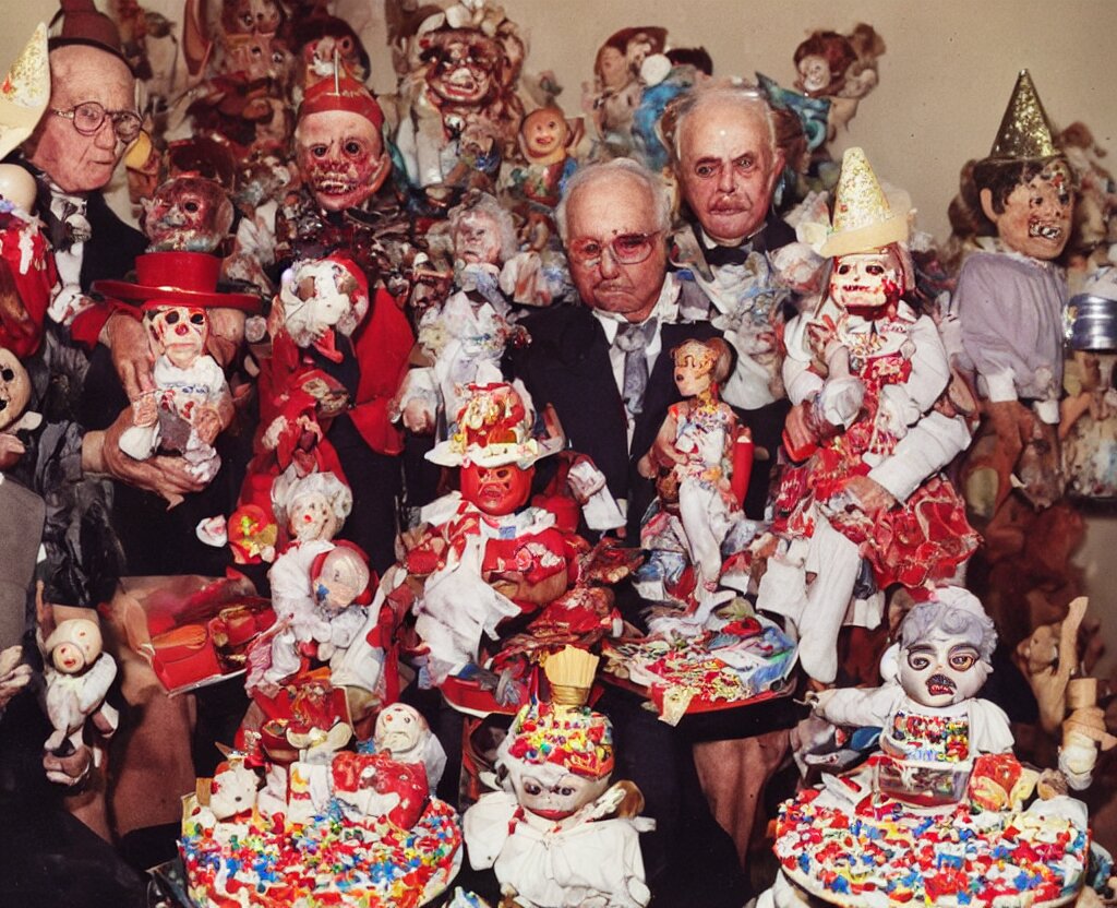 Portrait of grandparents in his birthday party, wearing dictador costumes and party hat in 1 9 9 0, colorful kodachrome photography camera with strong flash on a cake explodes by the powers of many diabolical creepy cursed dolls, pieces of cake explode photo taken by martin parr