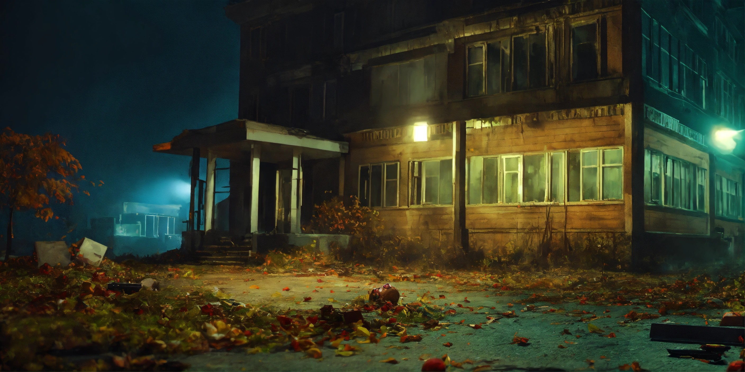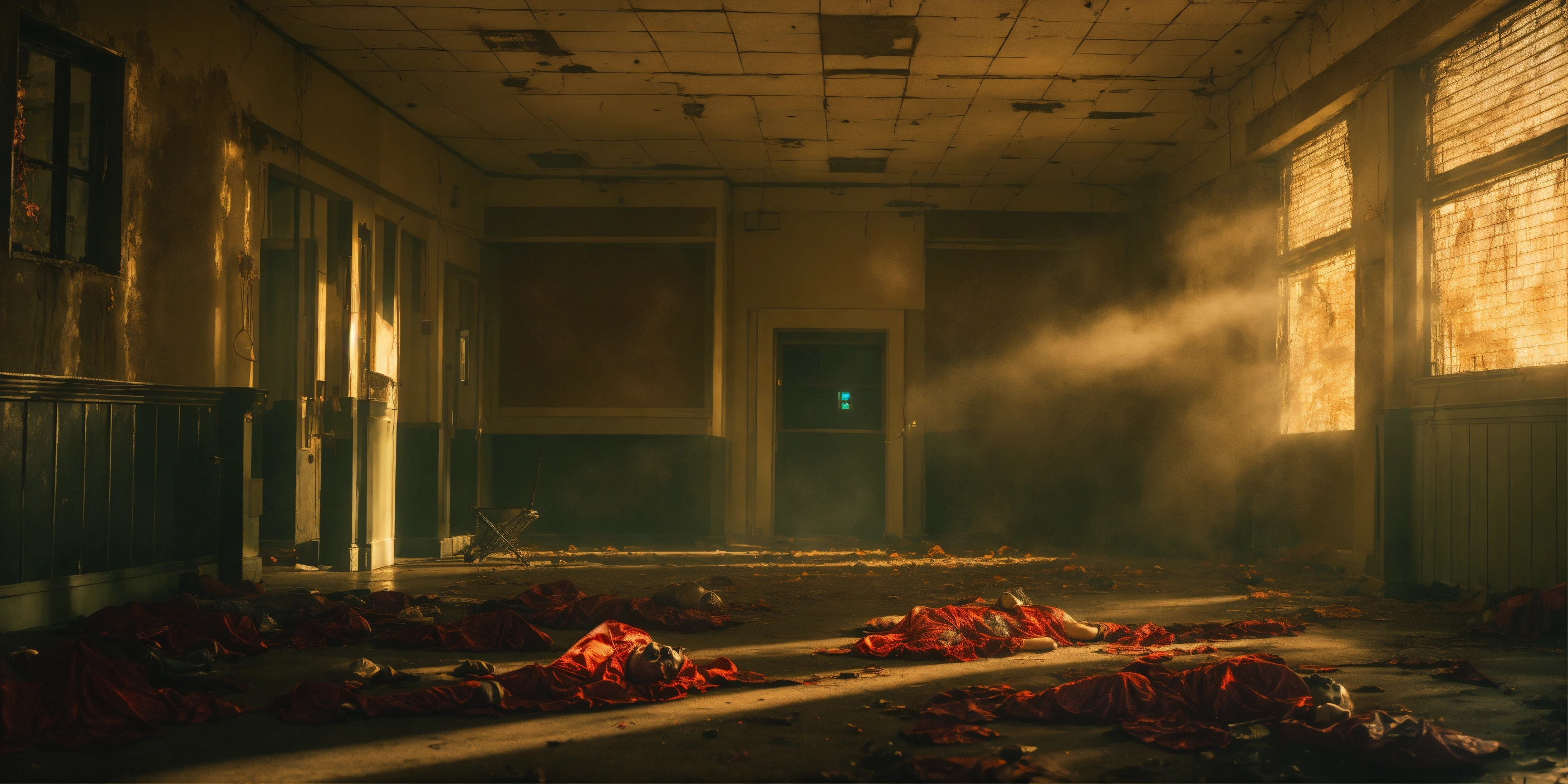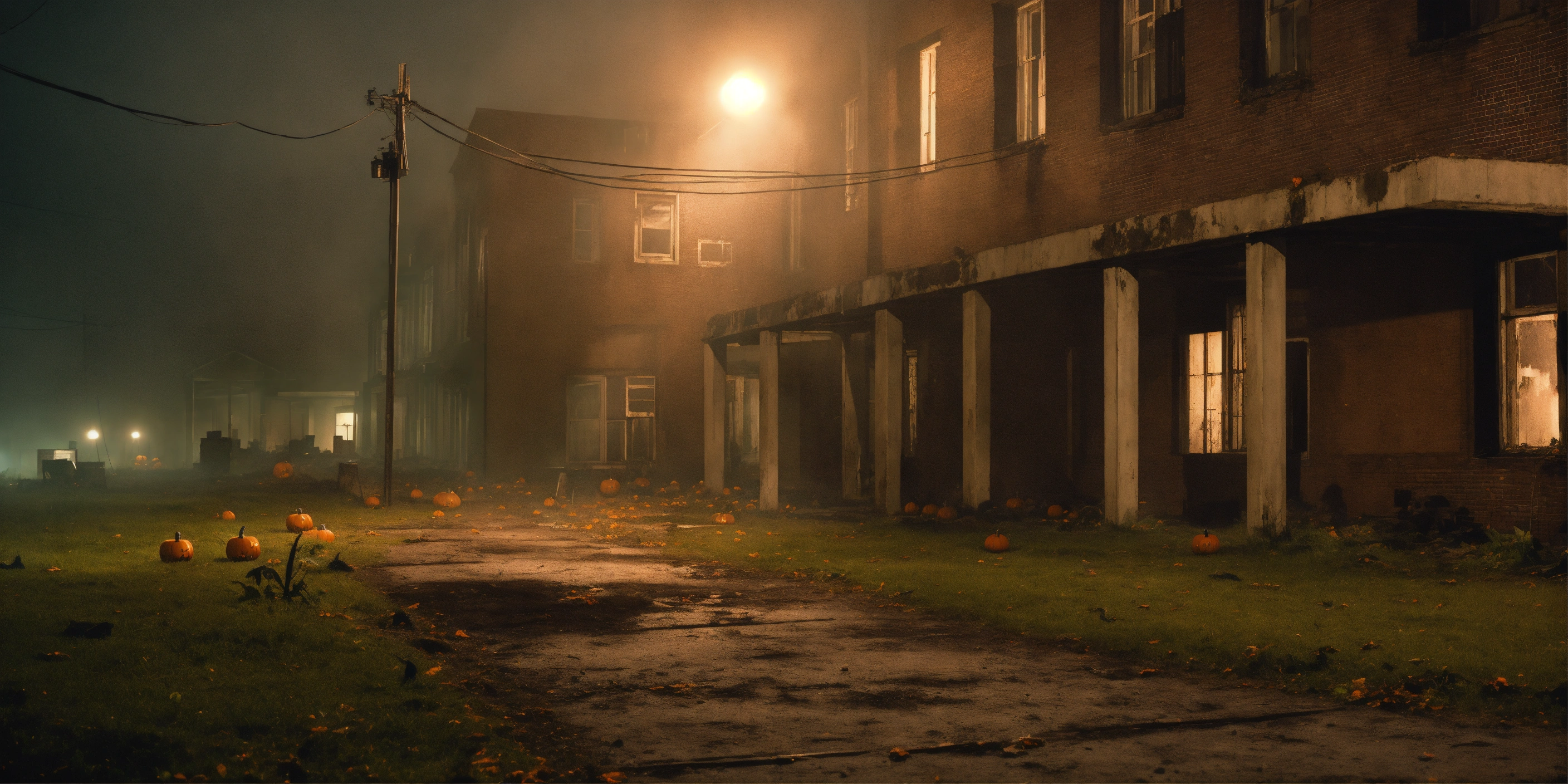 Zombie scene, abandoned hospital for a halloween party ambiance, night, brouillard highly detailed ultra réaliste suitable for printing poster. 8k