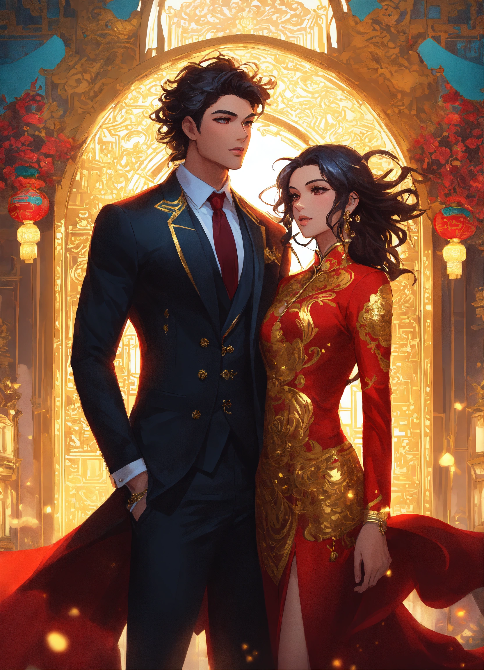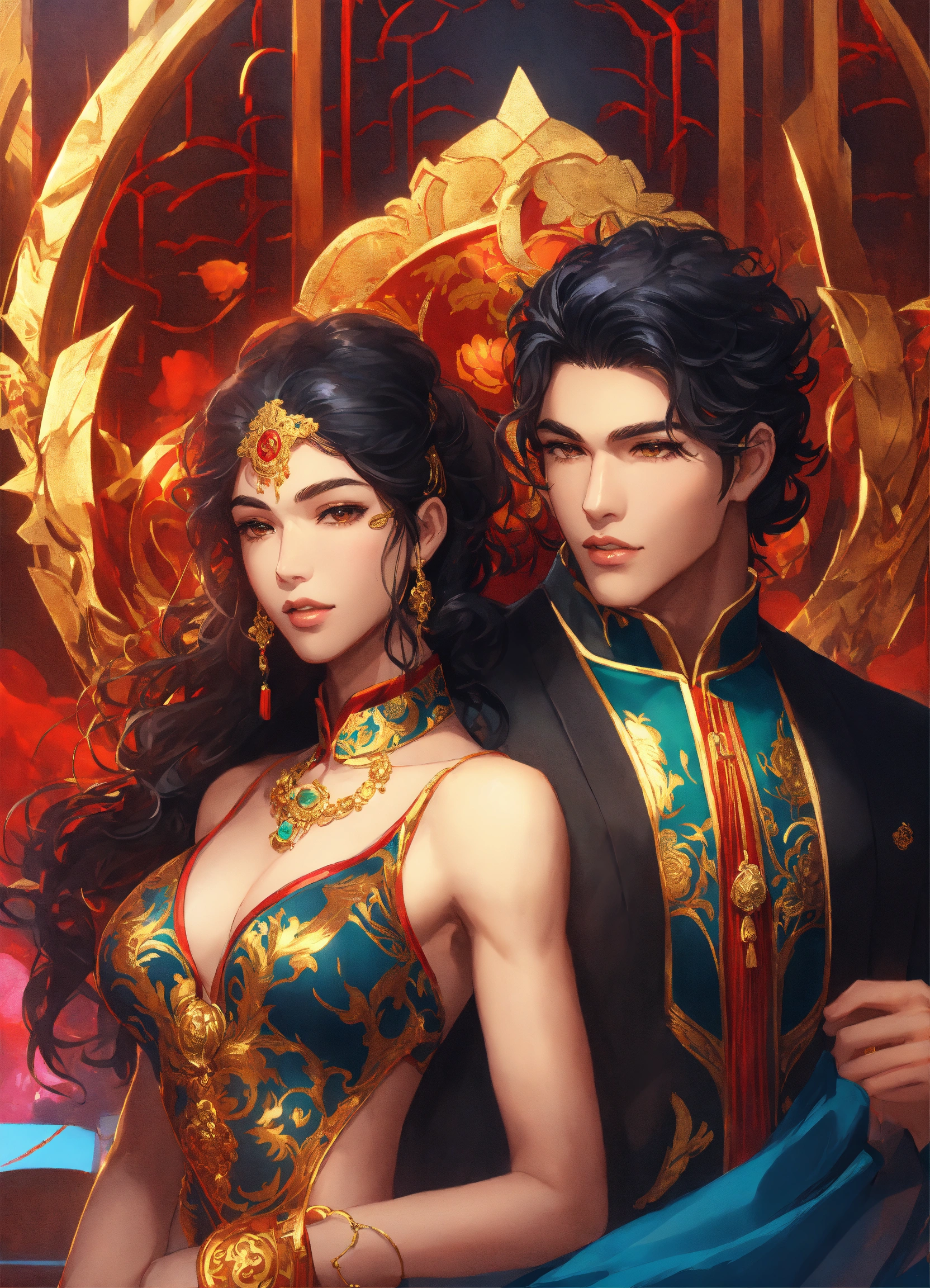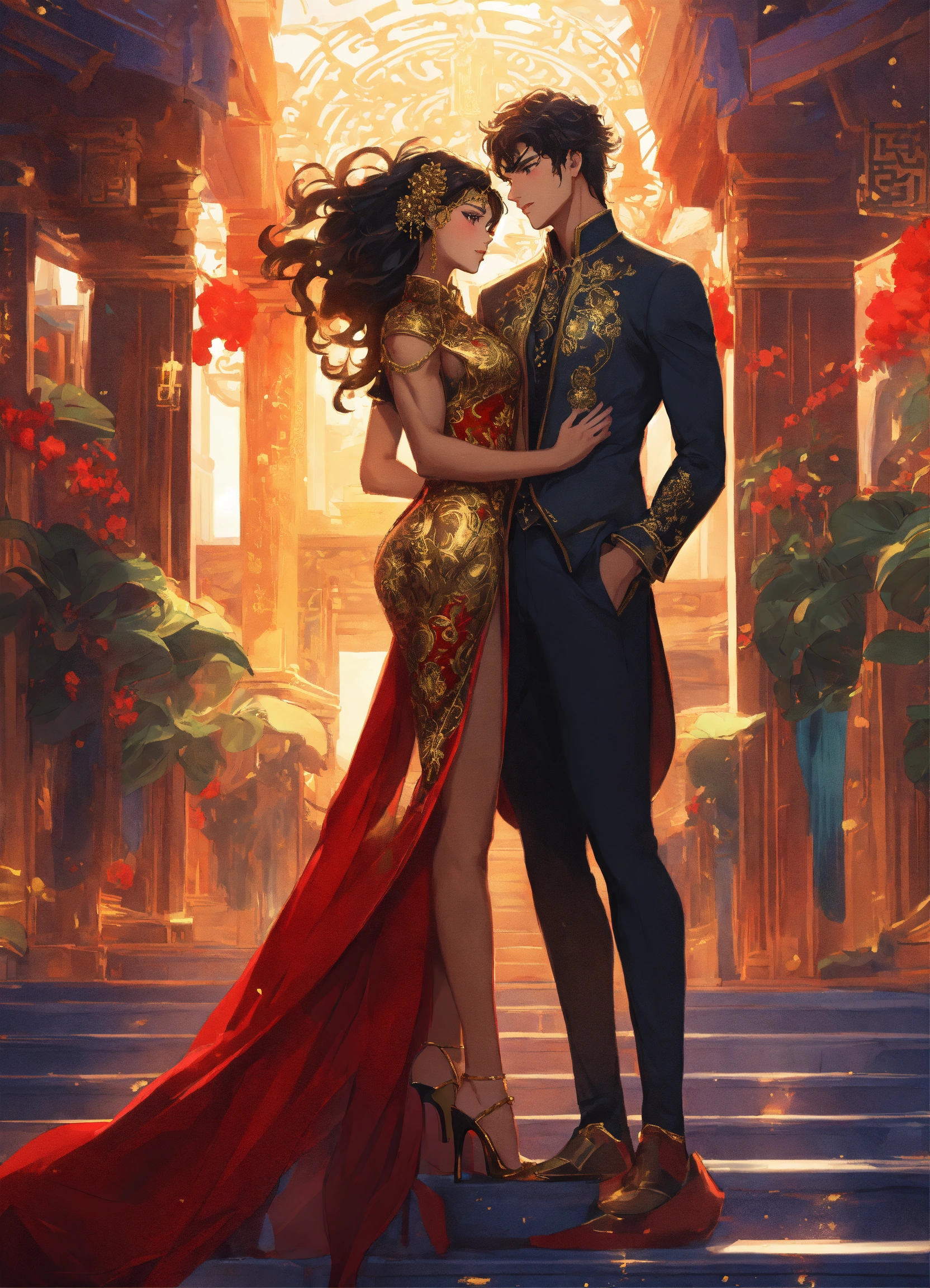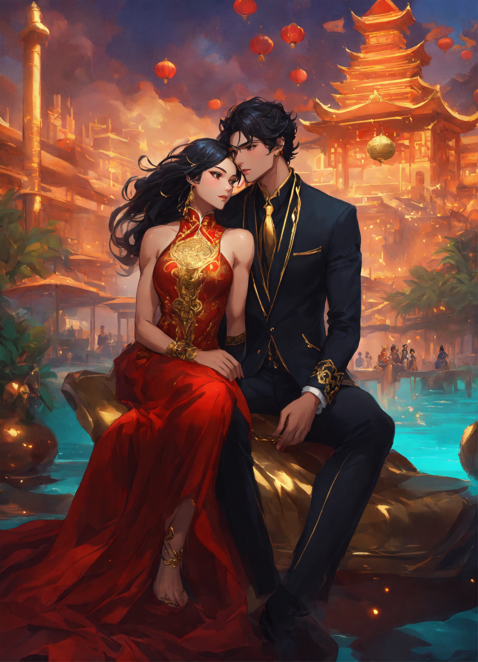 Illustration of beautiful city of atlantis, vibrant colors, fair skin, the young man wears a intricate black suit with gold ornaments, has wavy black tousled hair, the woman wears a red chinese dress with gold adornments that shows legs, she has muscles, maximalist, 8k photo, animestyle, by artgerm, trending on artstation