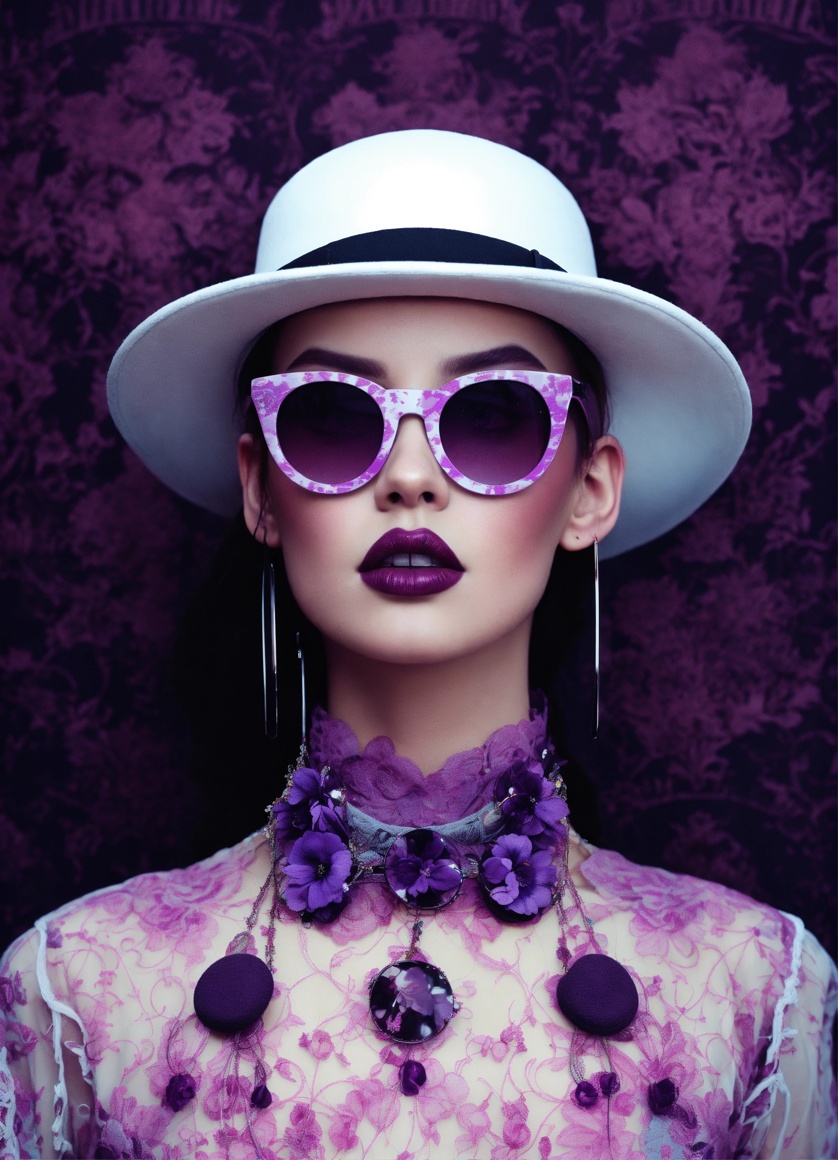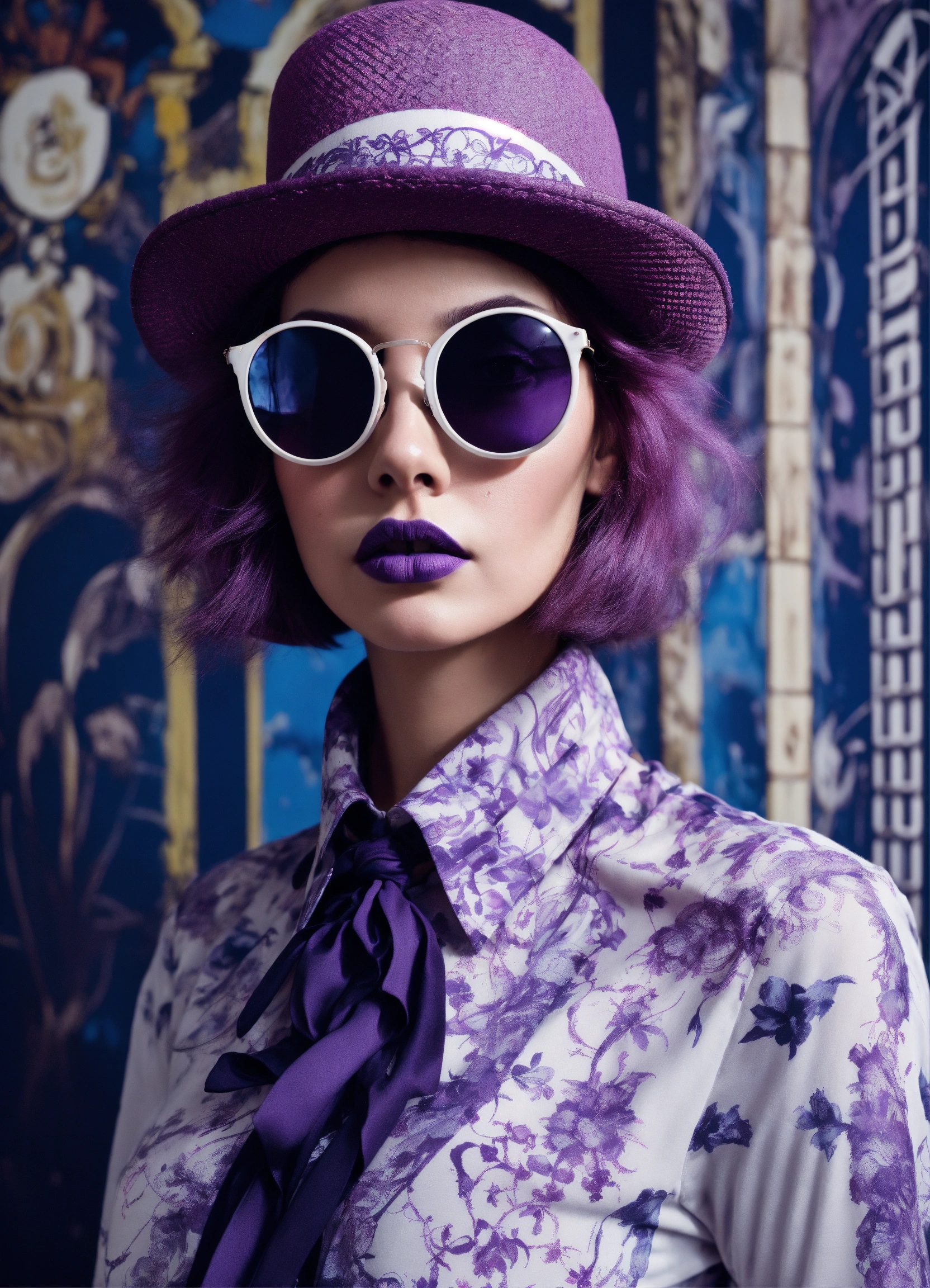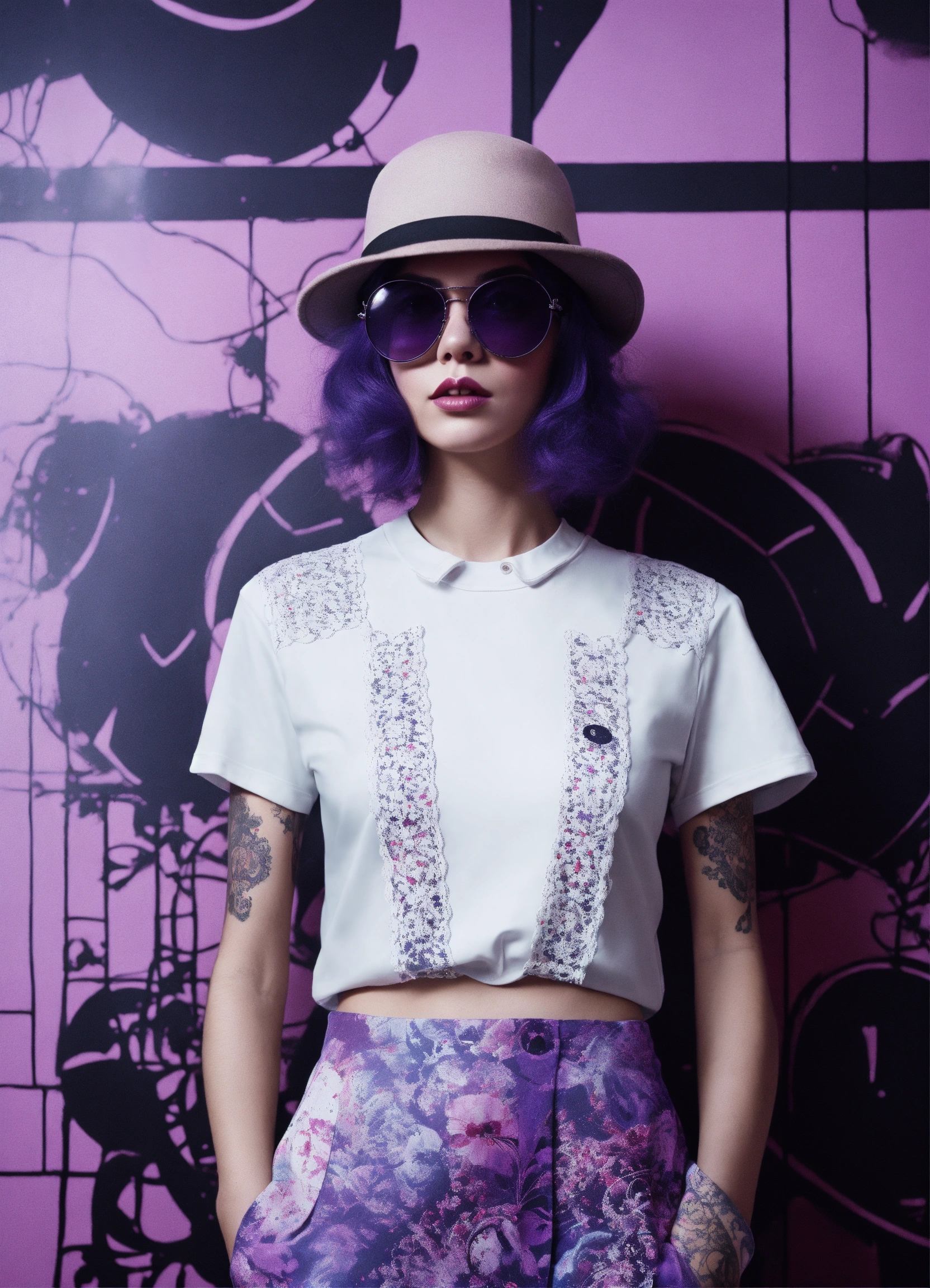 Front profile half body photography, in front of black wall, a punk 80's british model woman with bowler hat, in minimal round shapes white and violet patterns body laces tee shirt and large sunglasses, 80 degree view, art by sergio lopez, natalie shau, james jean and salvador dali
