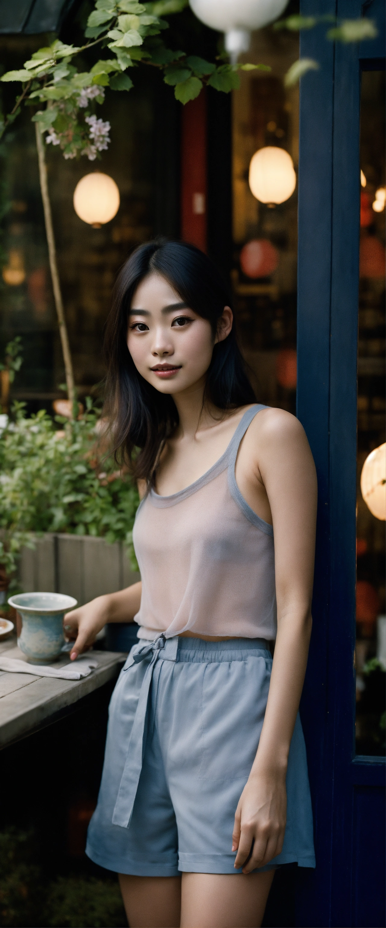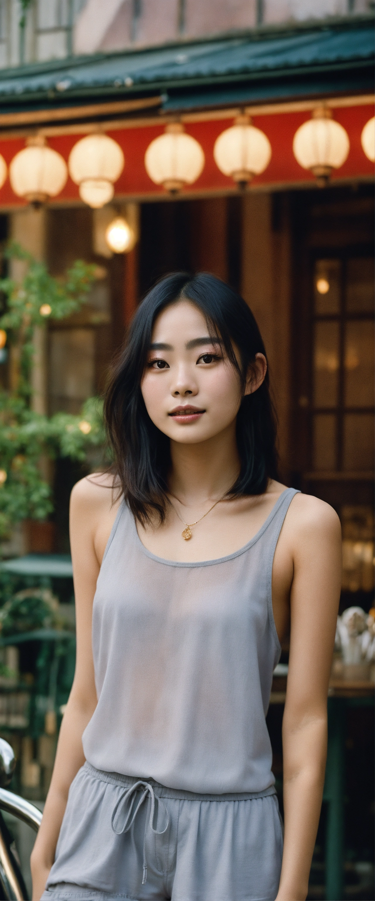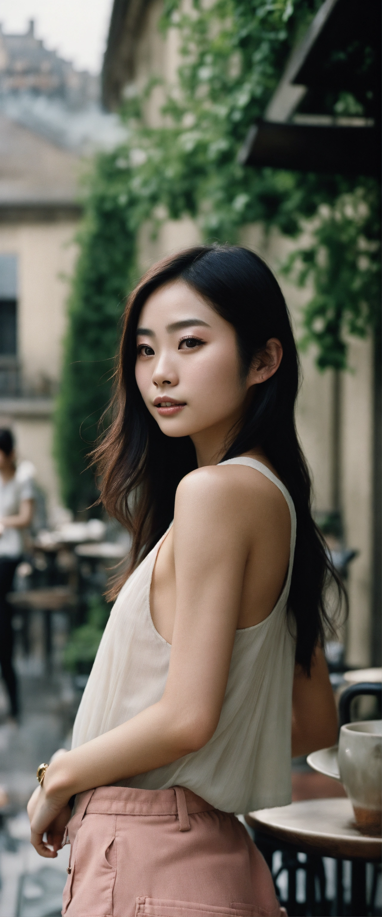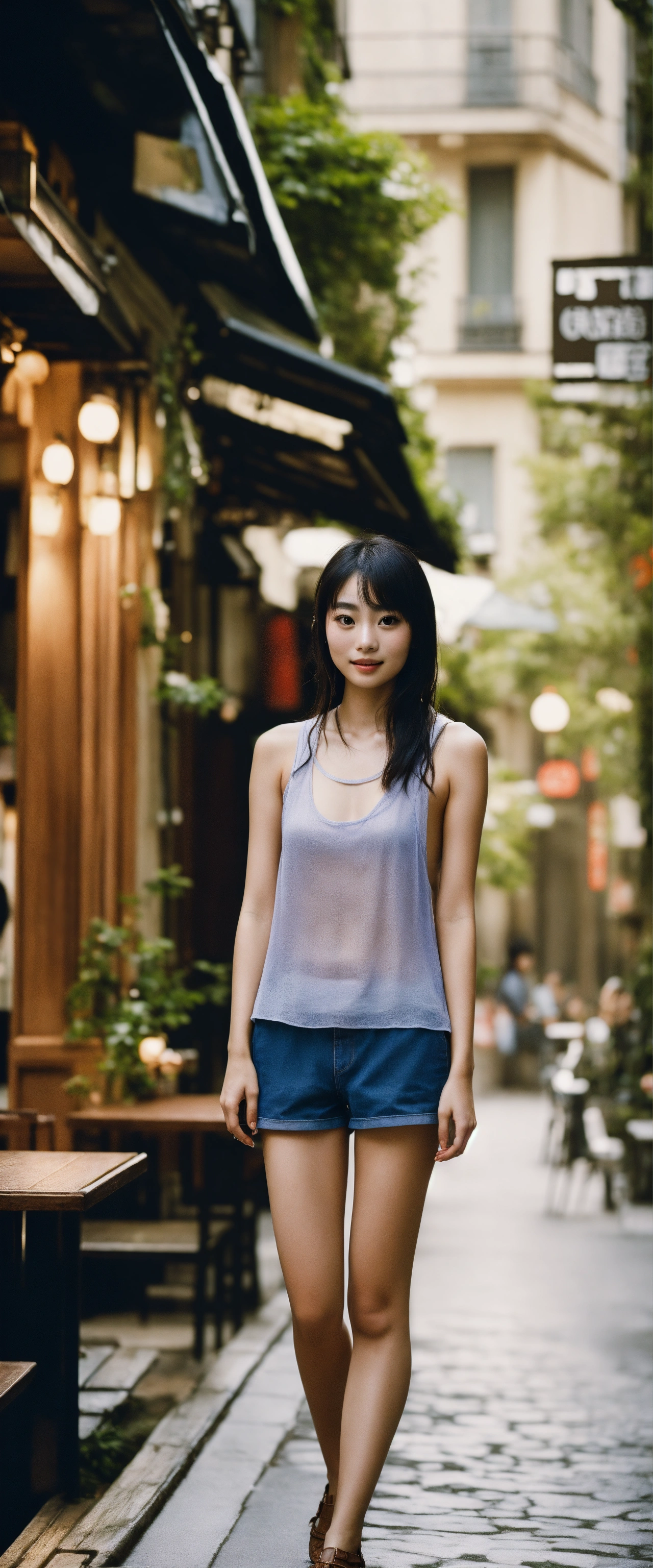 Portrait of a beautiful japanese suzu hirose with long smooth hair, wearing shorts and a top tank, ethereal dreamy foggy, photoshoot by steve mccurry, editorial fashion magazine photoshoot, fashion poses, in front of parisian café terrace. kinfolk magazine. film grain. a soft smile